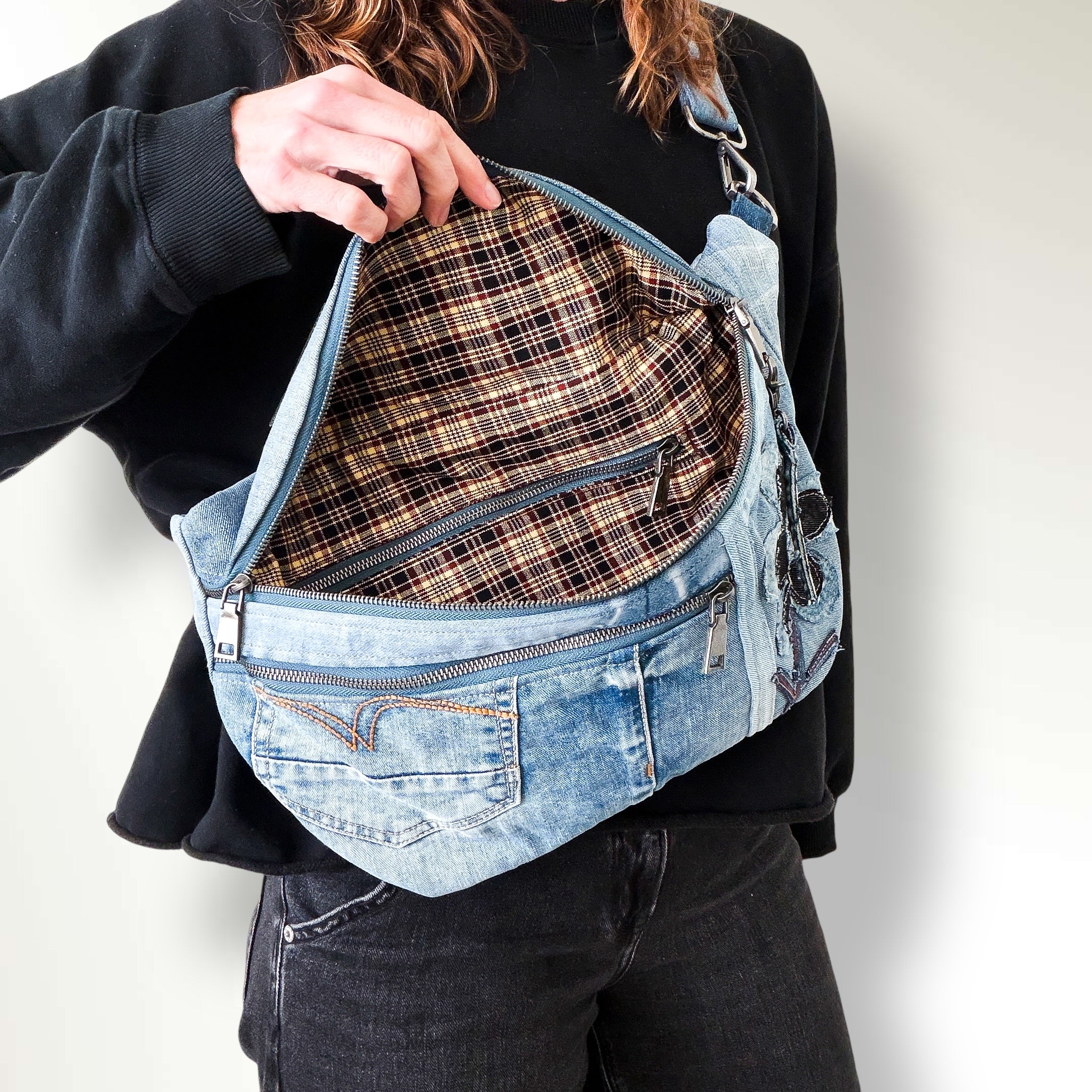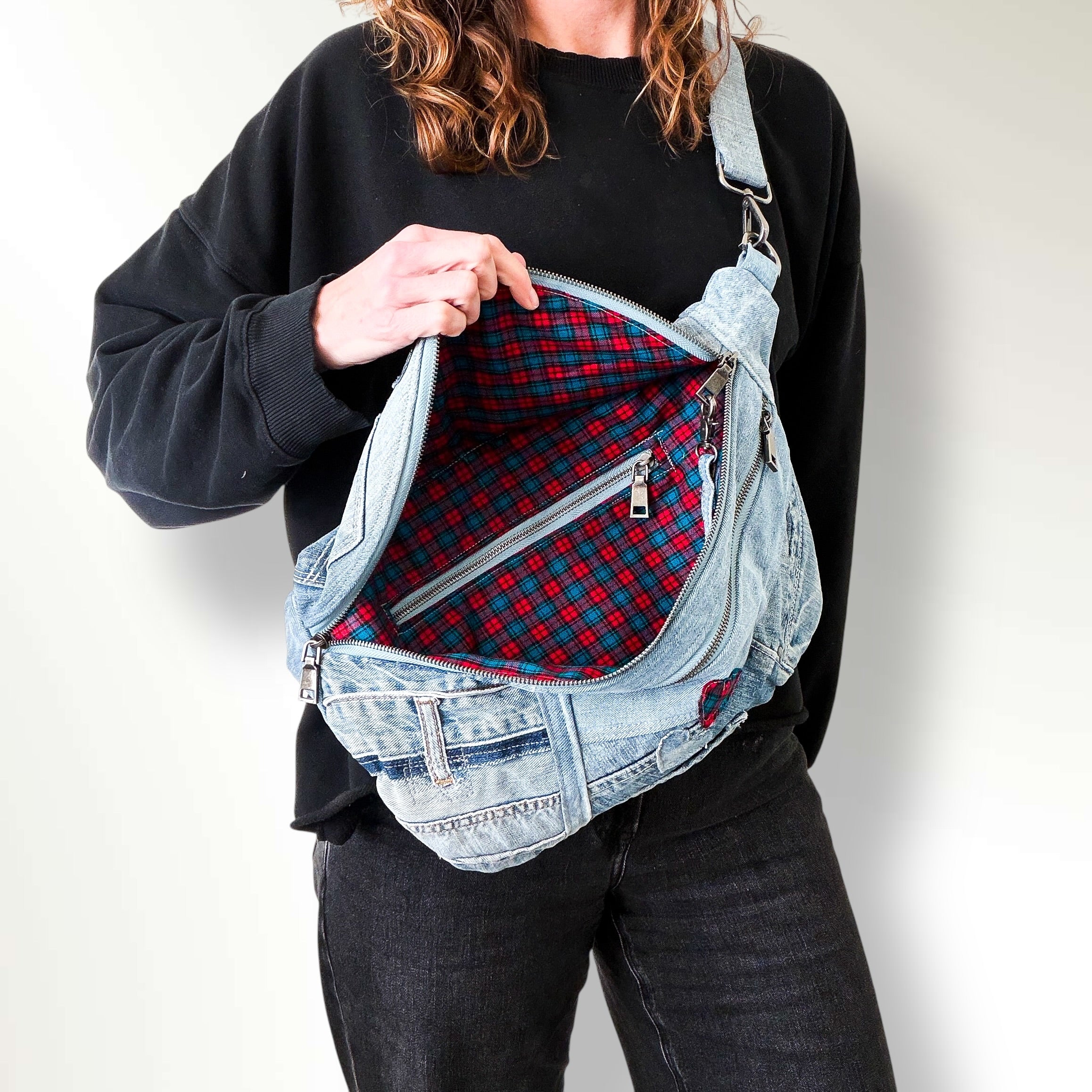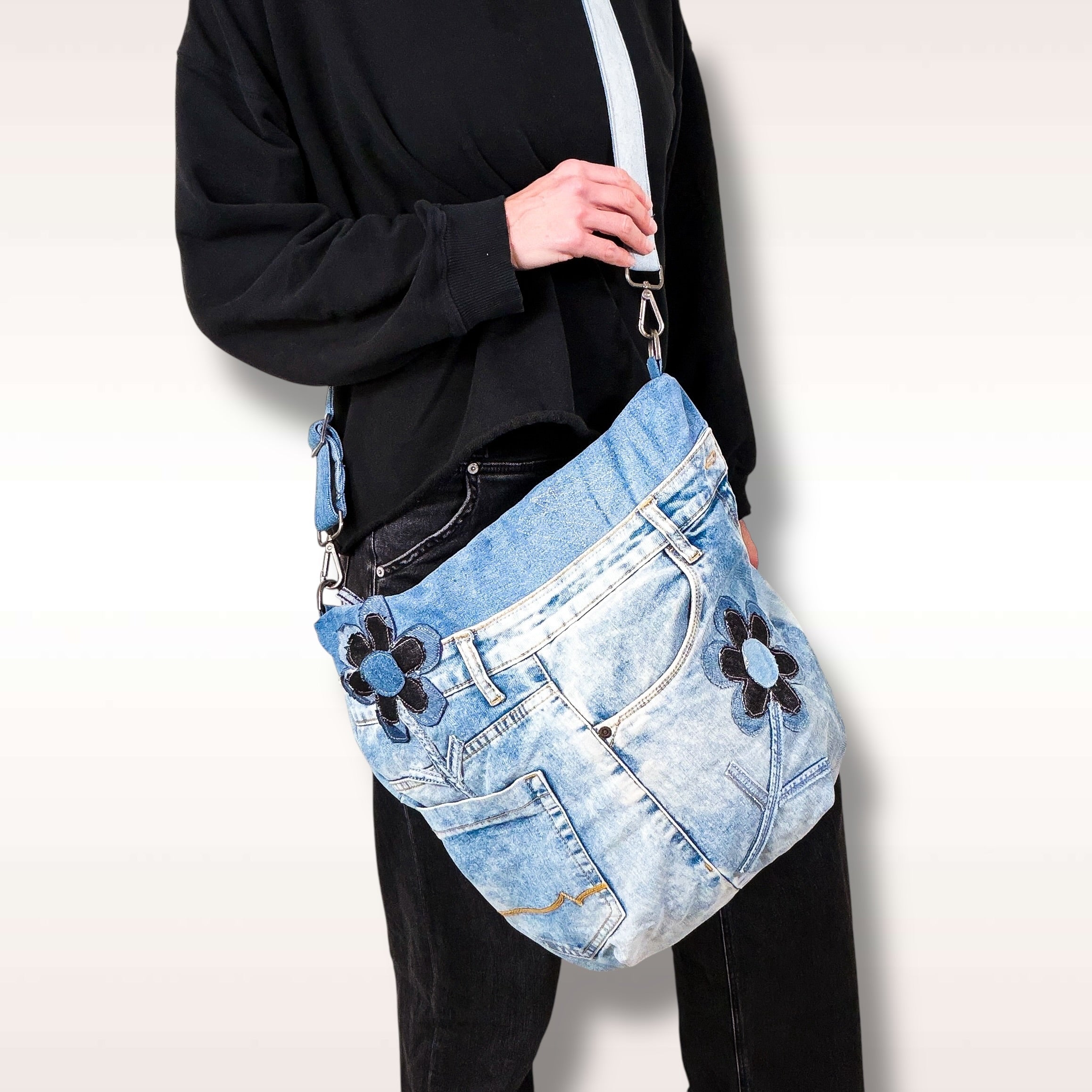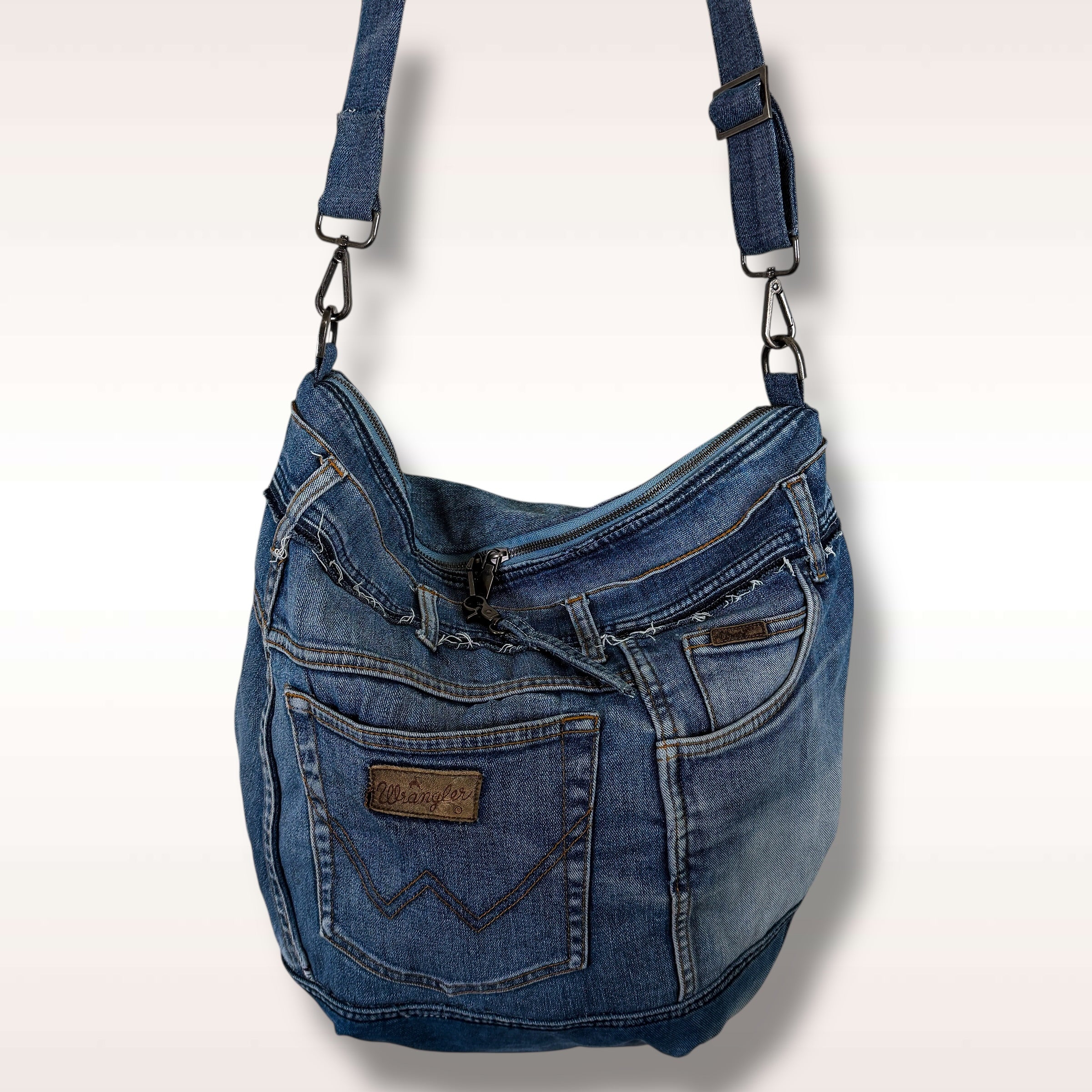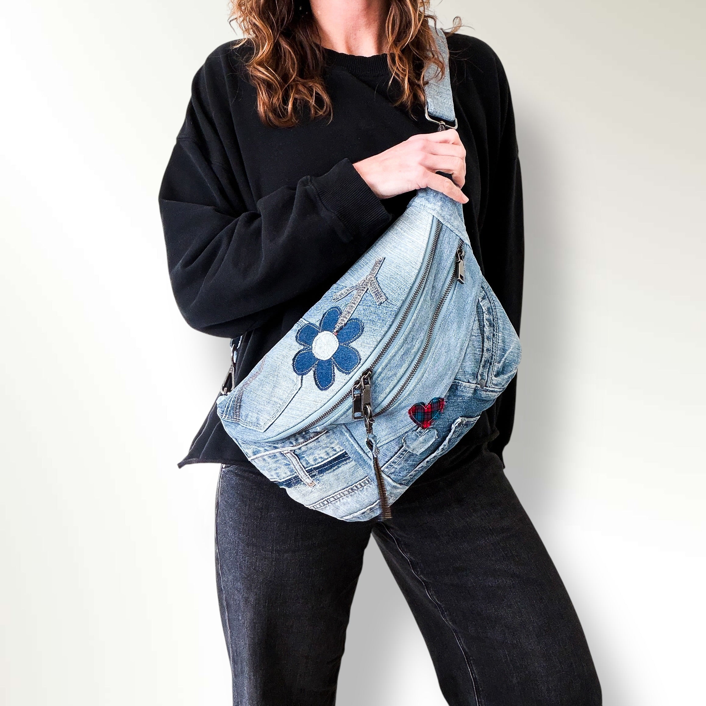 Check out our upcycled denim bag collection. Sling bags. Crossbody bags.