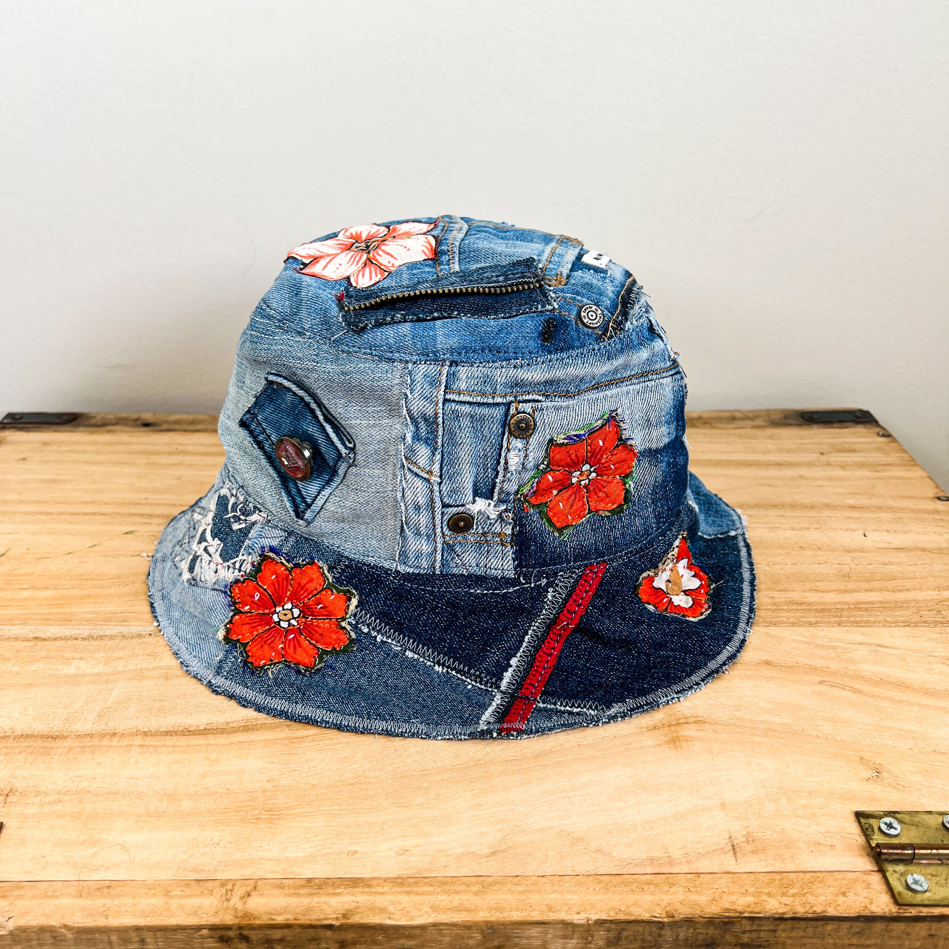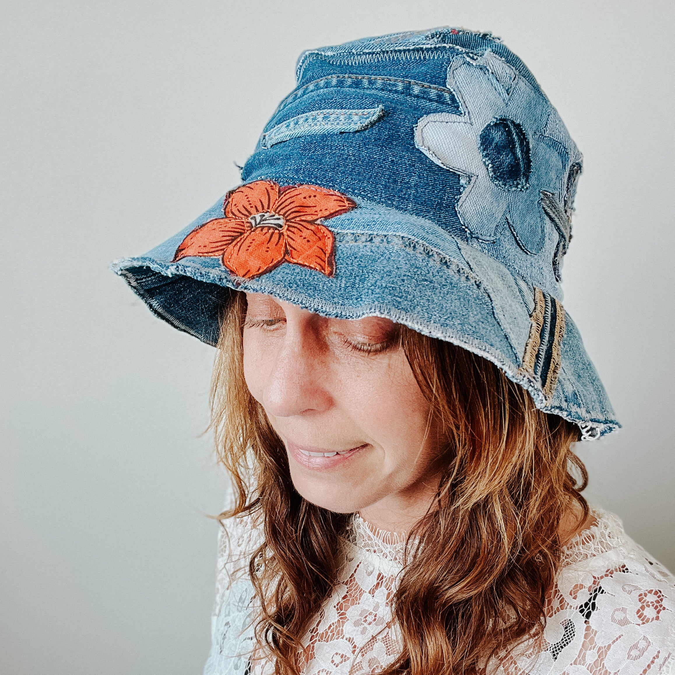 Handmade upcycled bucket hat is crafted from scrap denim, giving new life to discarded fabric. Each upcycled hat is one-of-a-kind. Patchwork denim Hat.