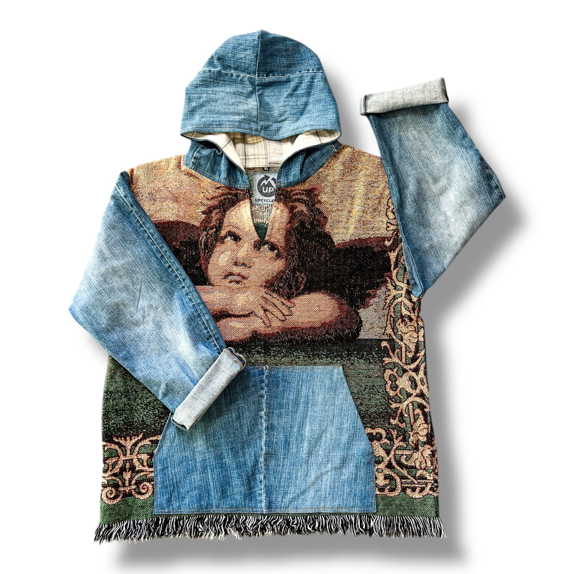 Stay stylish and sustainable with our one-of-a-kind Upcycled Denim Tapestry Hoodies! Made entirely from secondhand textiles, each hoodie is an eco-conscious design.