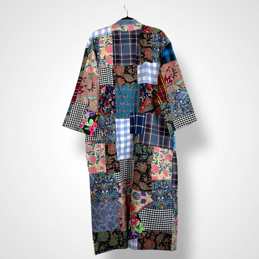 Cover up sustainably with an upcycled denim patchwork kimono. Each is handmade from reclaimed denim pockets, waistbands, and cotton scrap fabrics salvaged from a local sewer. Designed for slow fashion lovers, each kimono diverts textile waste from landfills while creating a bold, wearable statement piece.