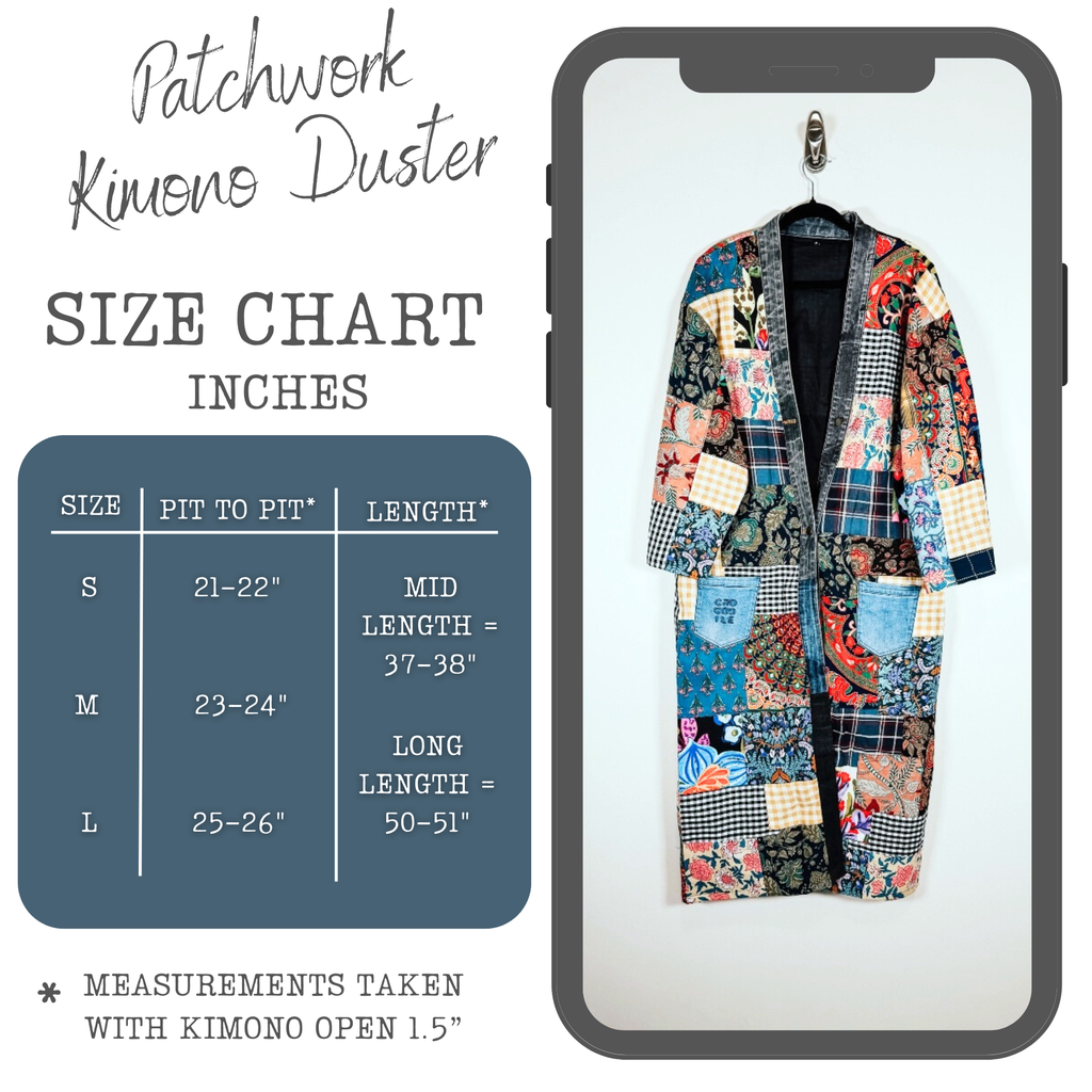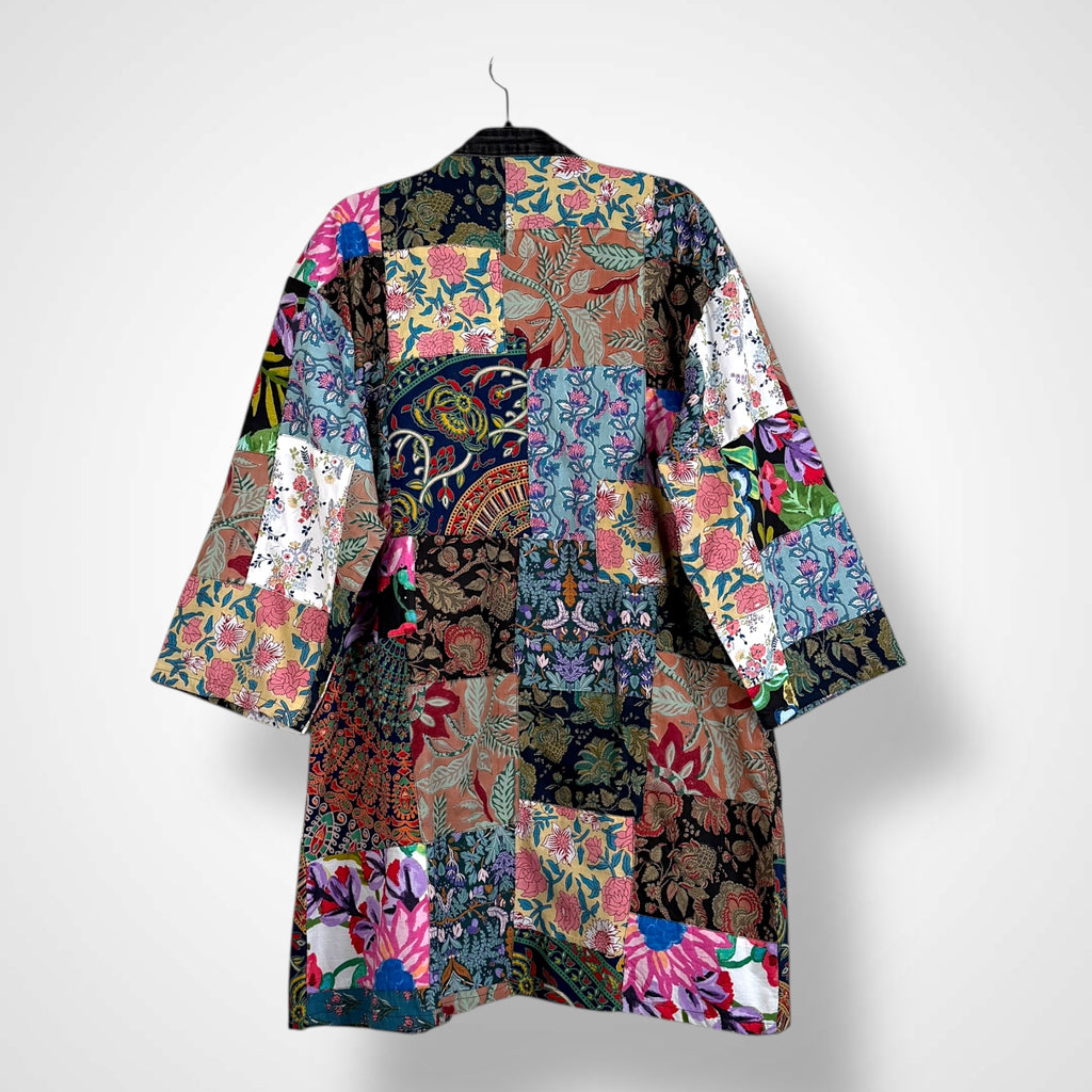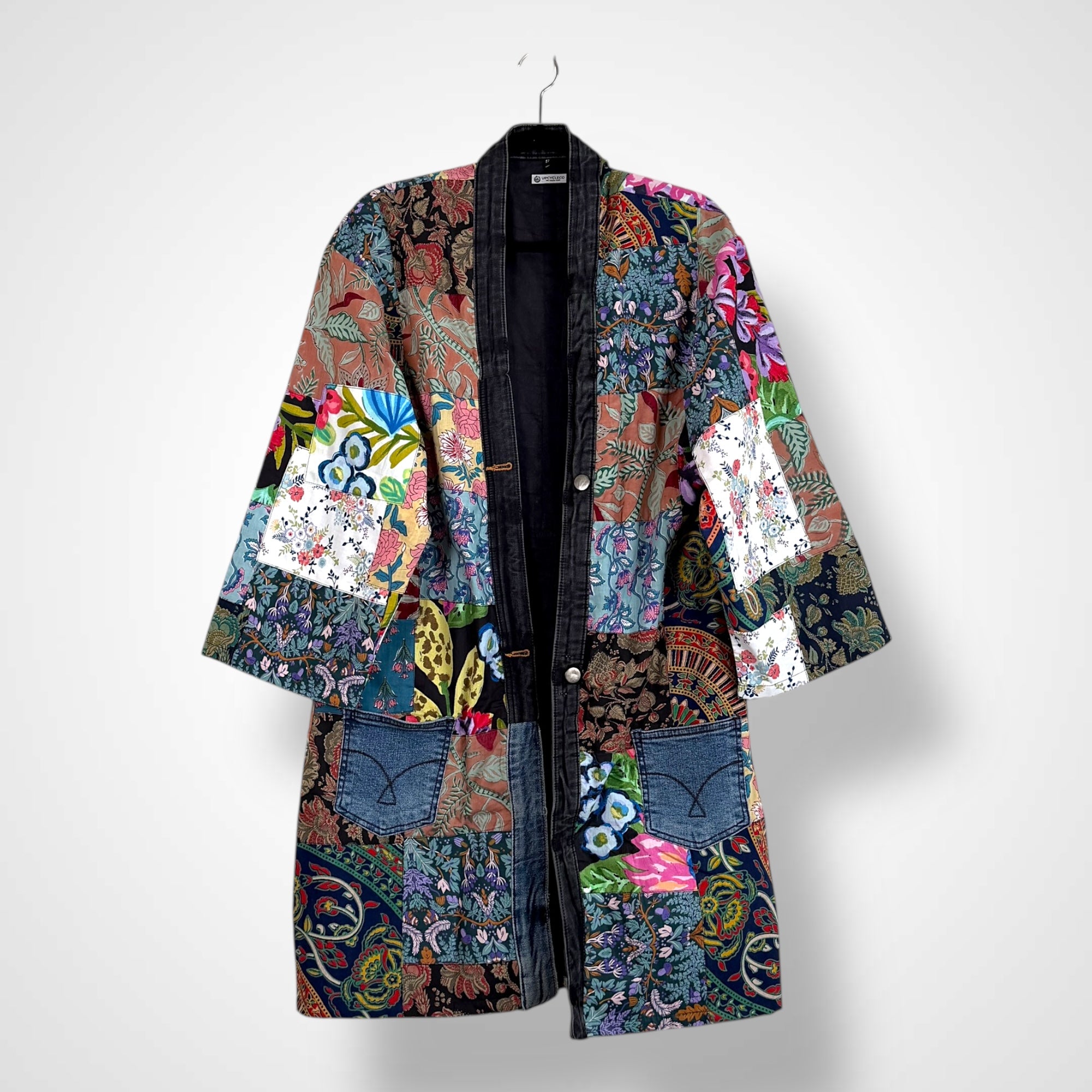 Cover up sustainably with an upcycled denim patchwork kimono. Each is handmade from reclaimed denim pockets, waistbands, and cotton scrap fabrics salvaged from a local sewer. Designed for slow fashion lovers, each kimono diverts textile waste from landfills while creating a bold, wearable statement piece.