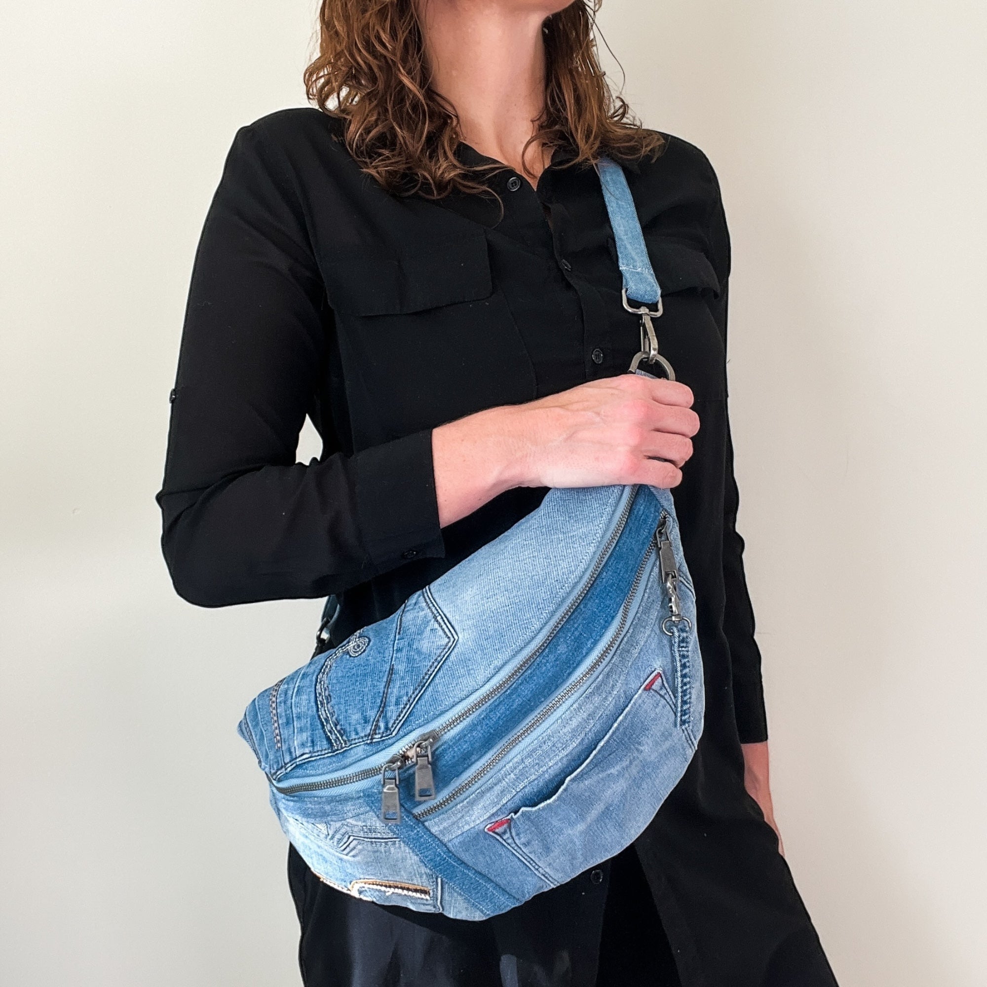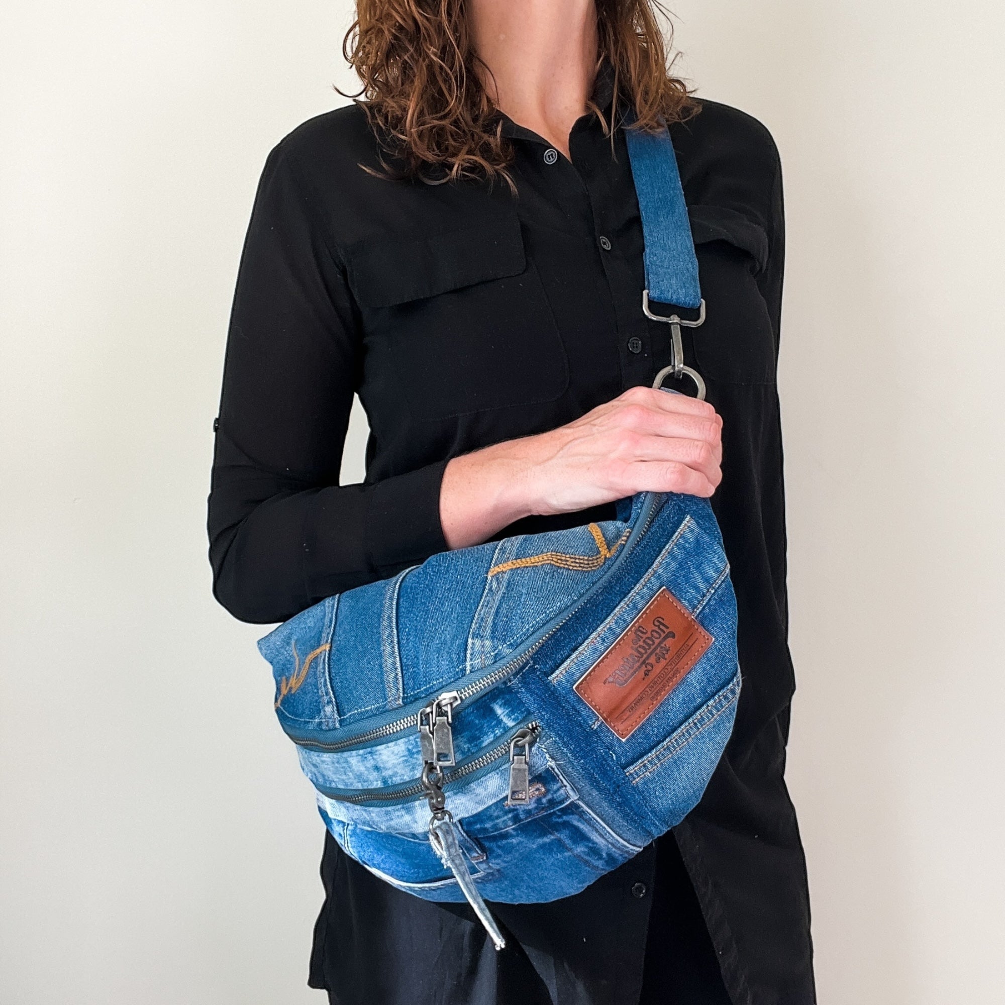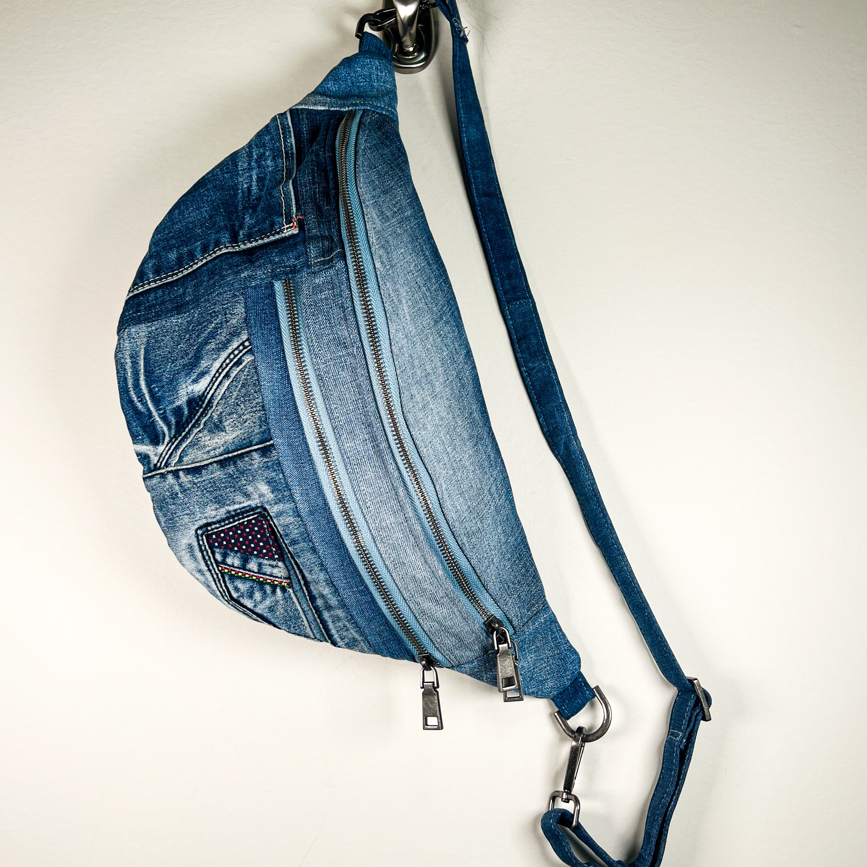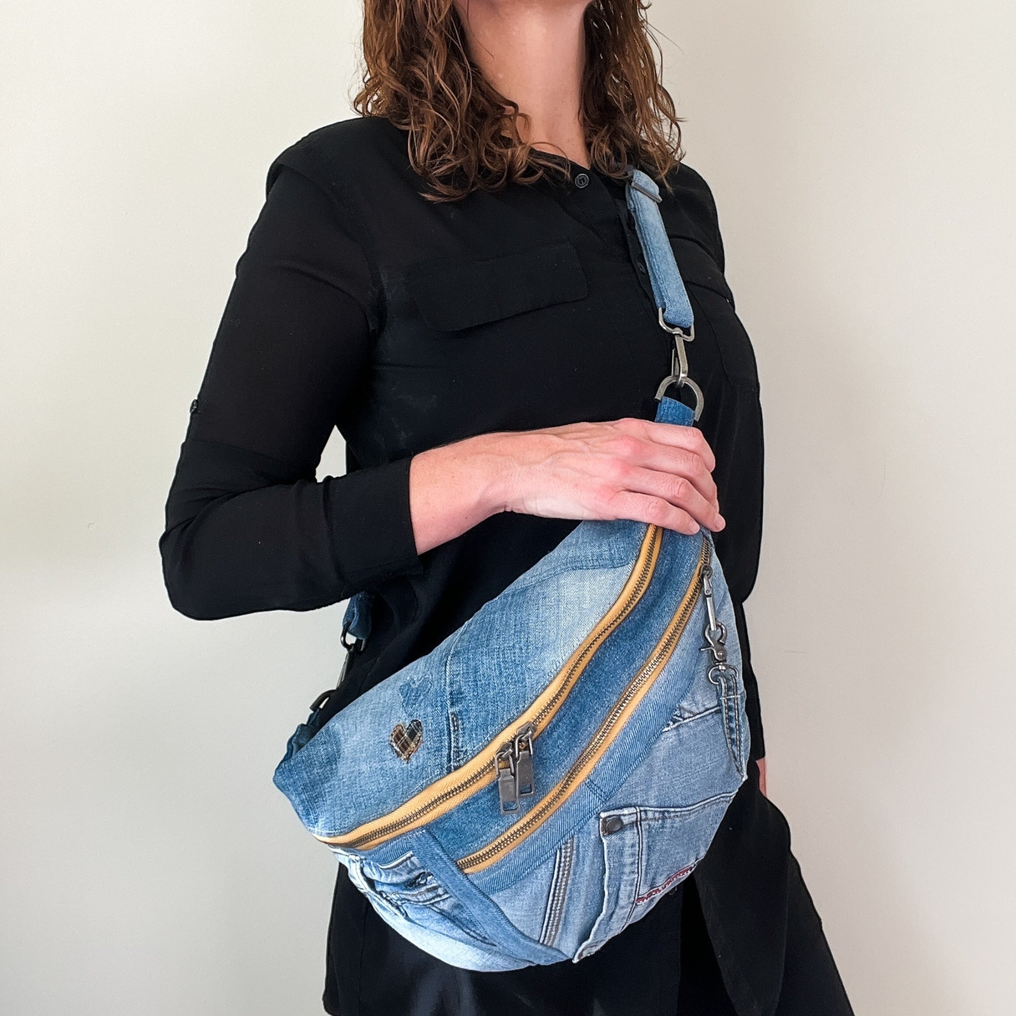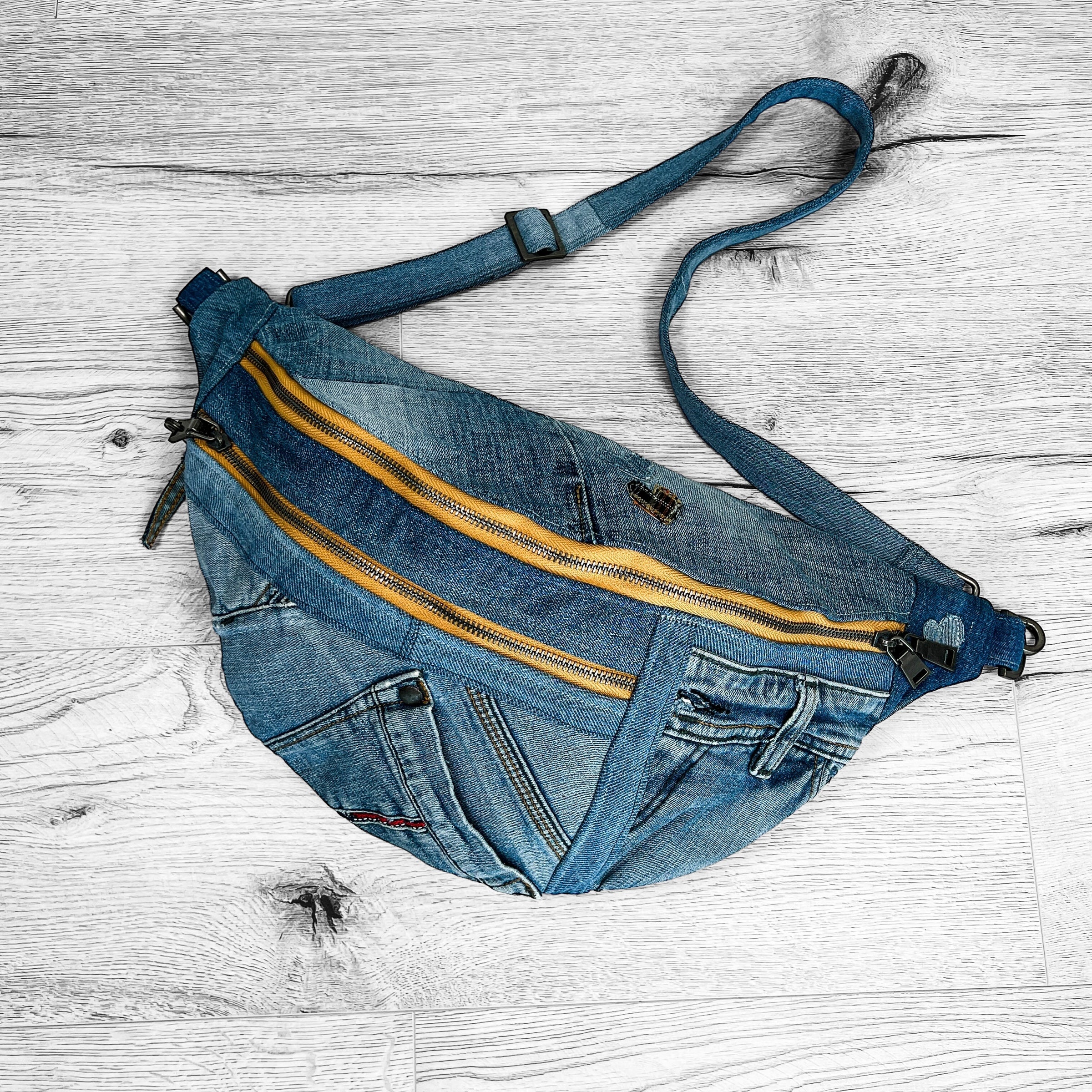 Check out our upcycled denim bag collection. Sling bags. Crossbody bags.