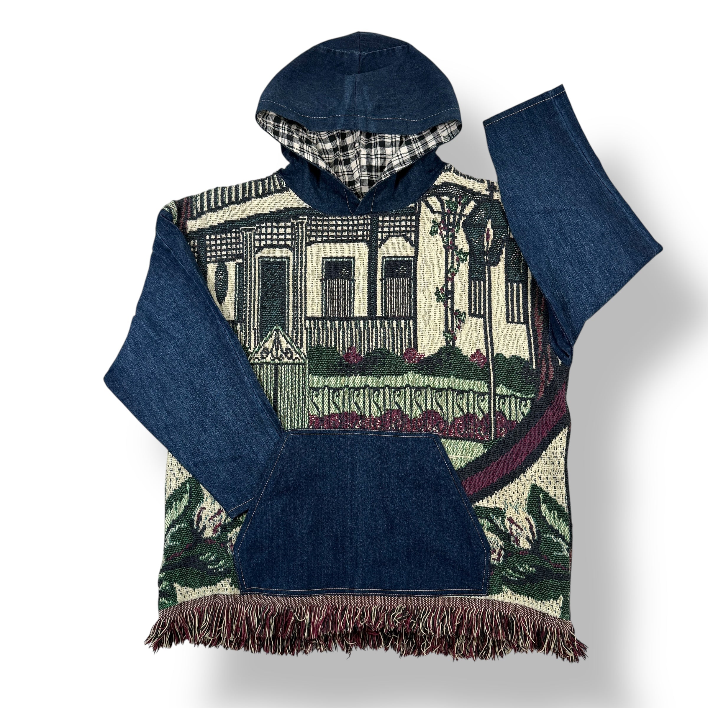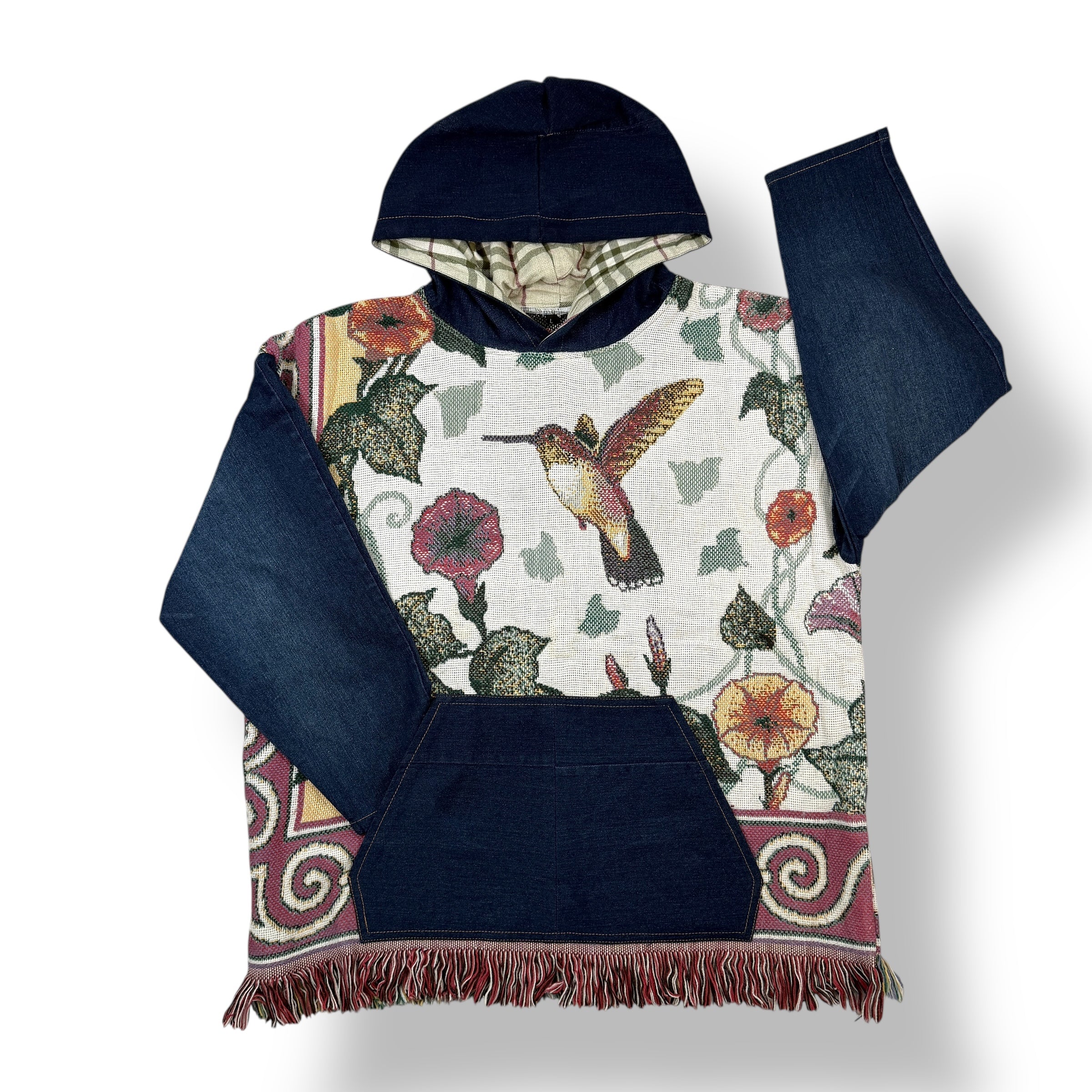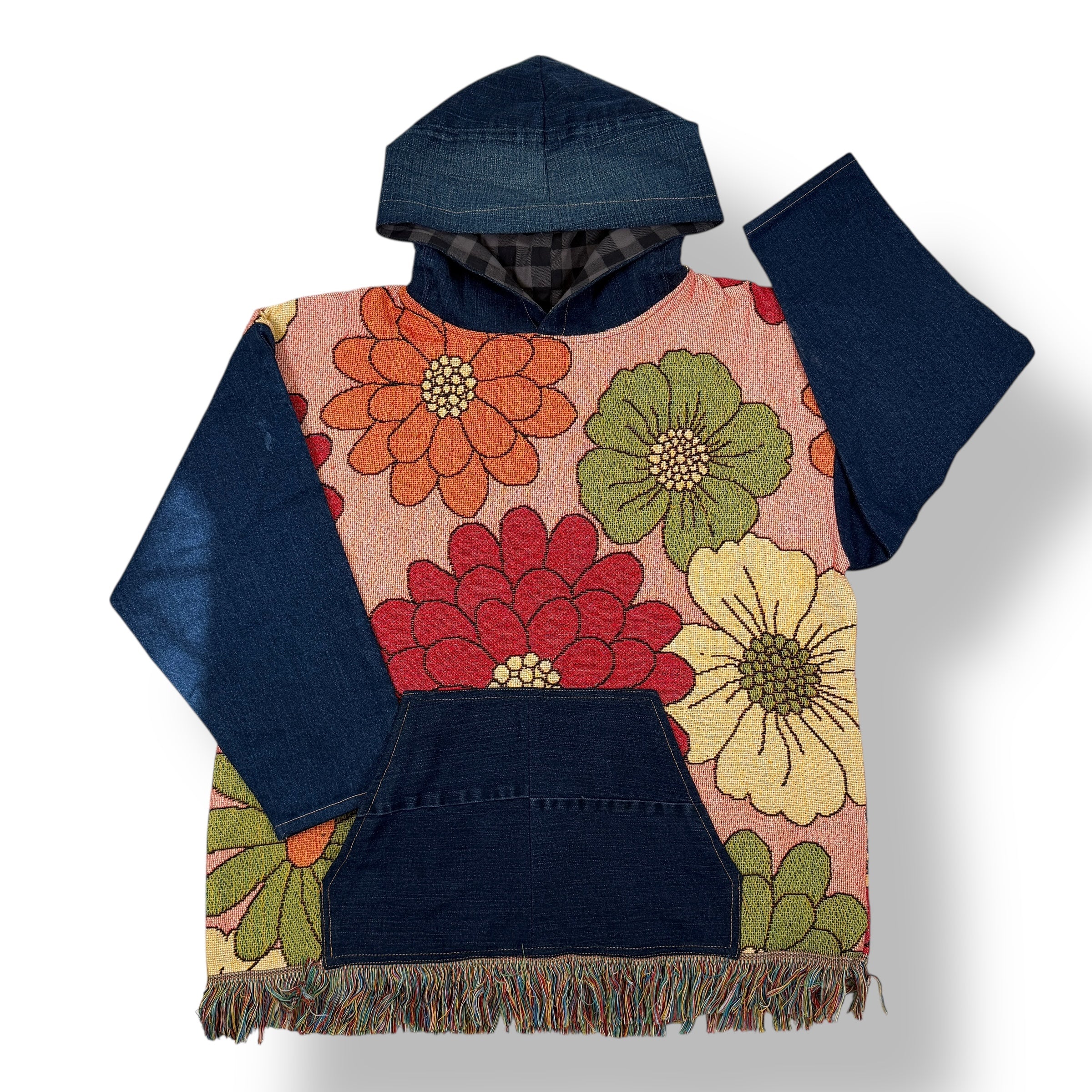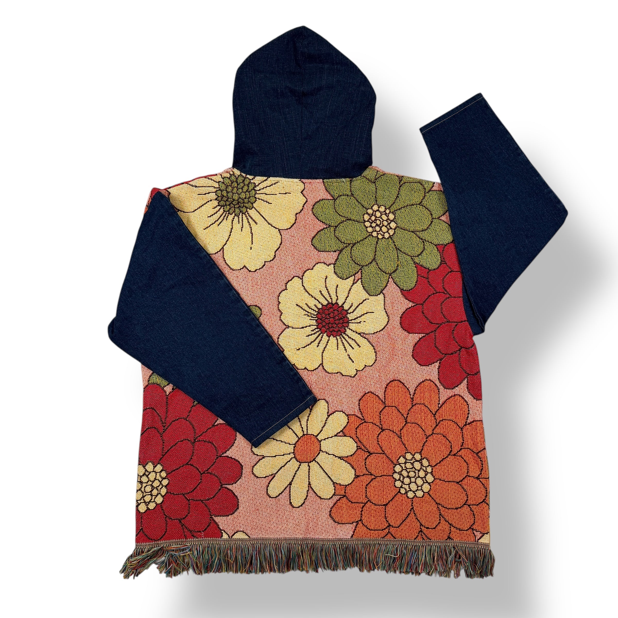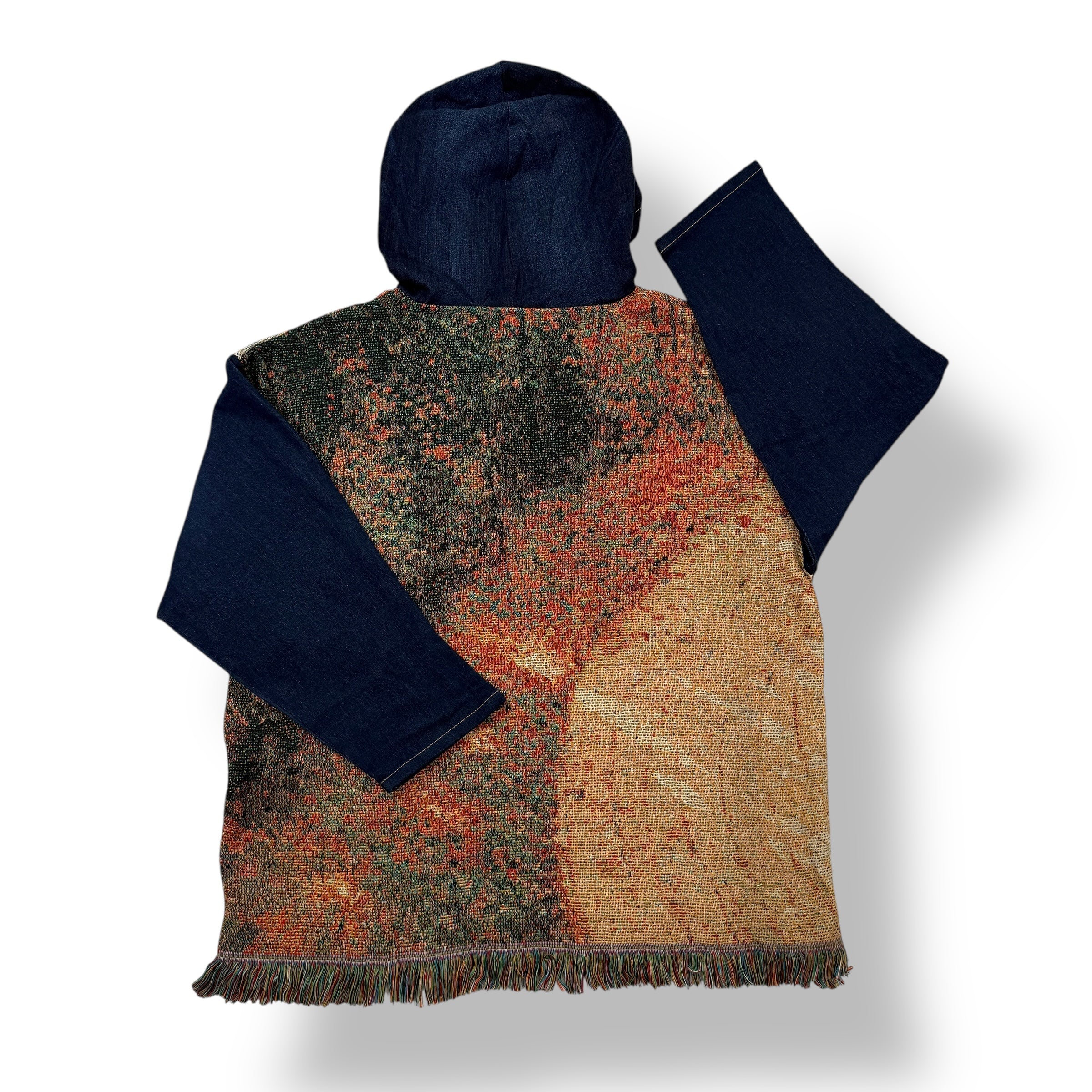 Stay stylish and sustainable with our one-of-a-kind Upcycled Denim Tapestry Hoodies from 100% secondhand textiles. Upcycled clothing. Denim Sleeve. Vintage tapestry body.