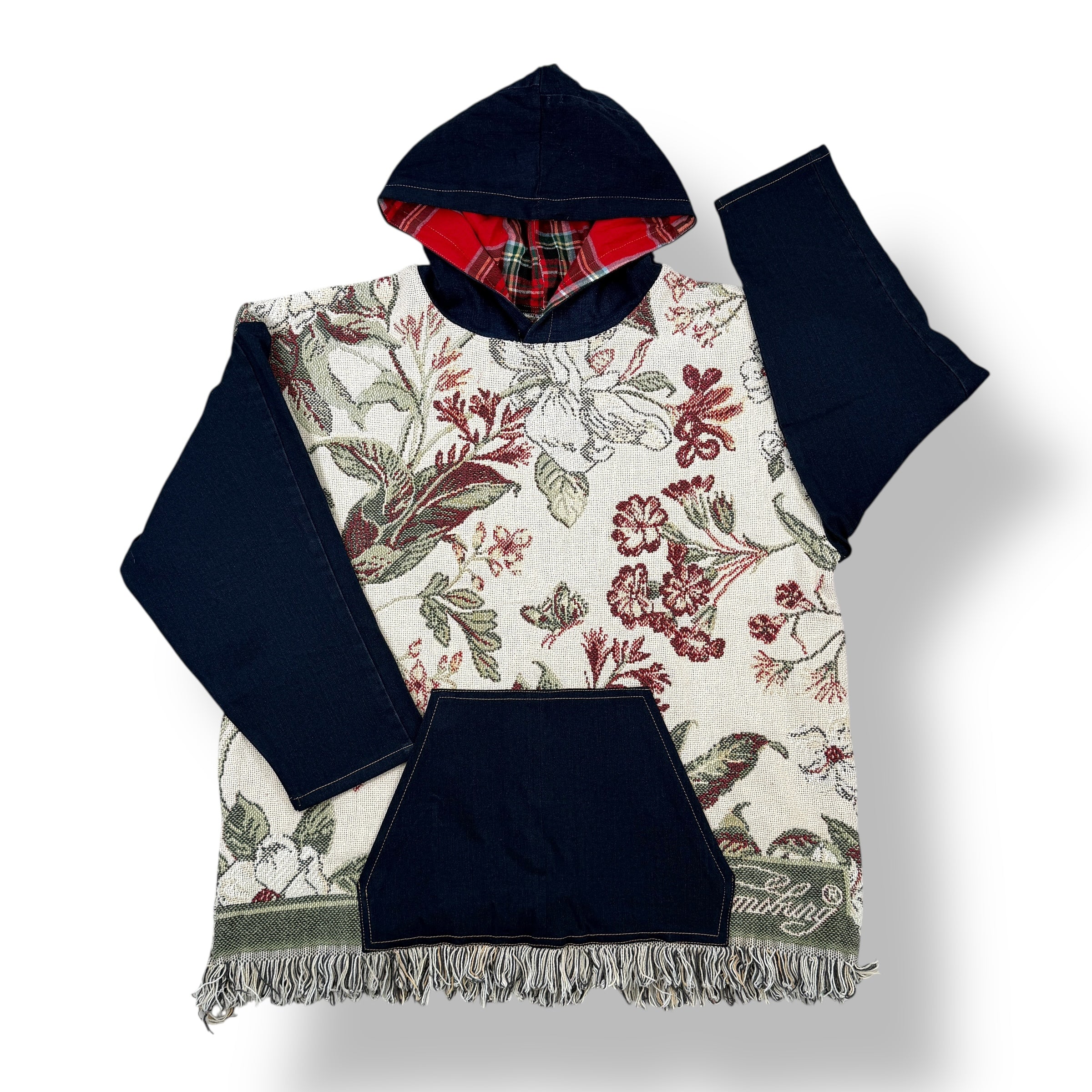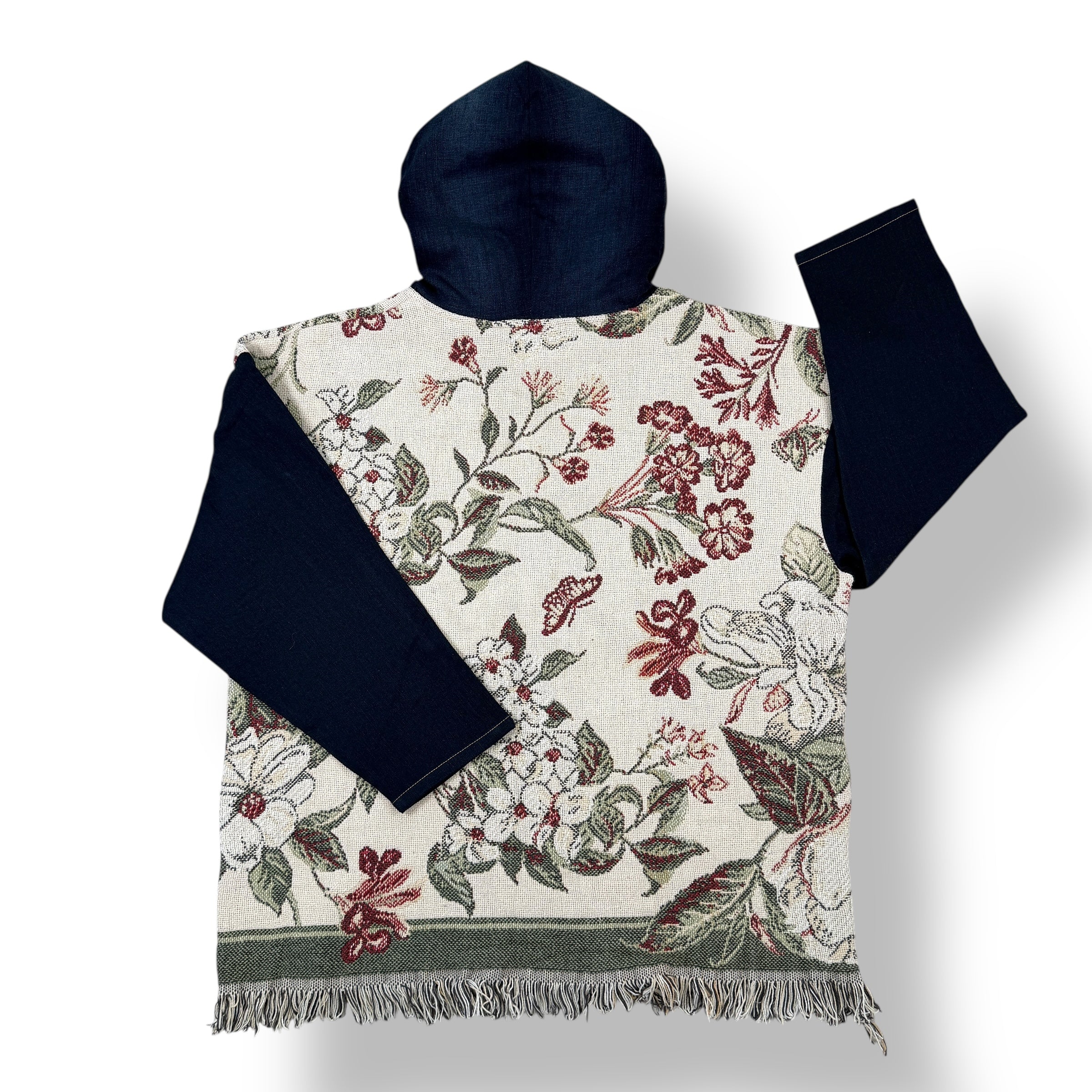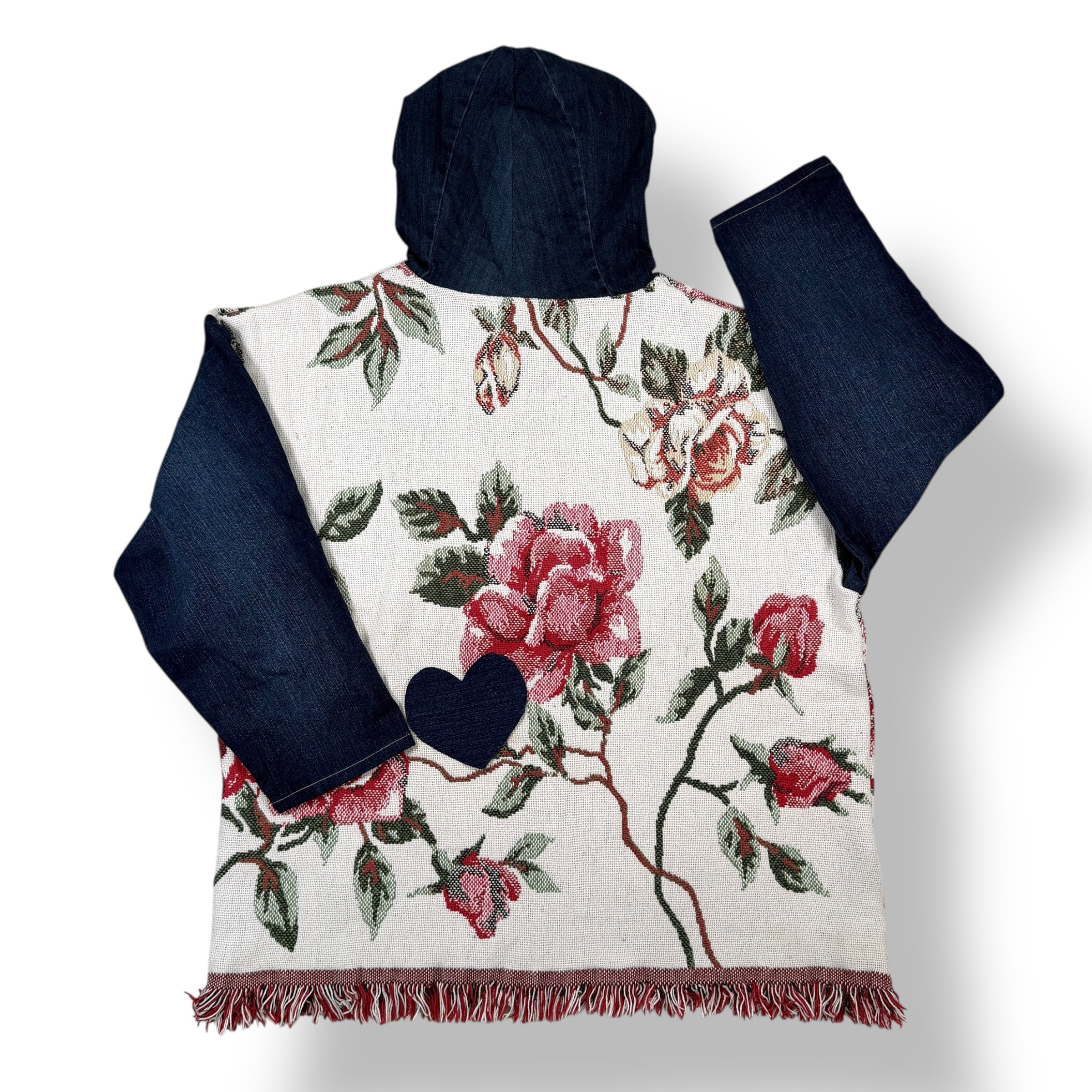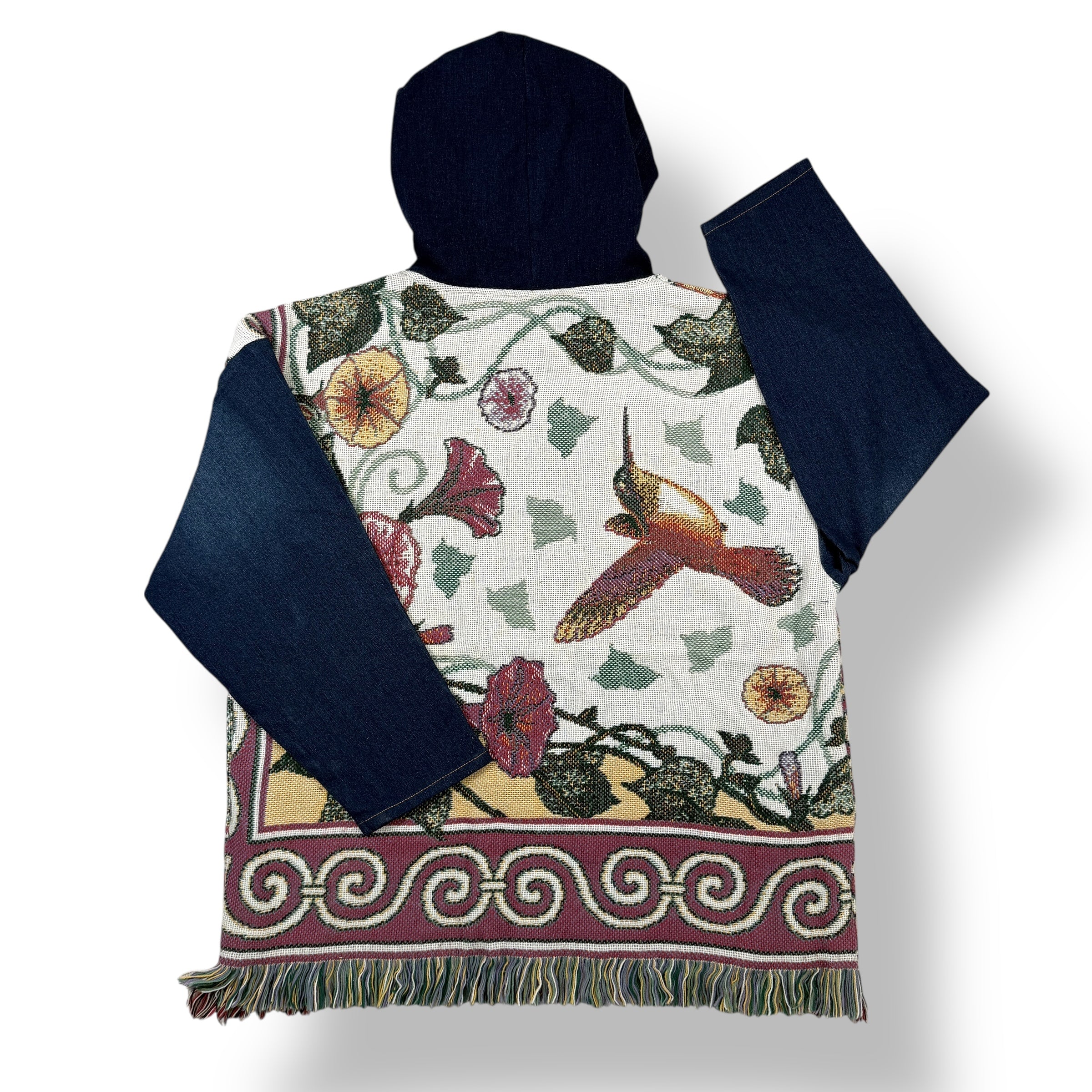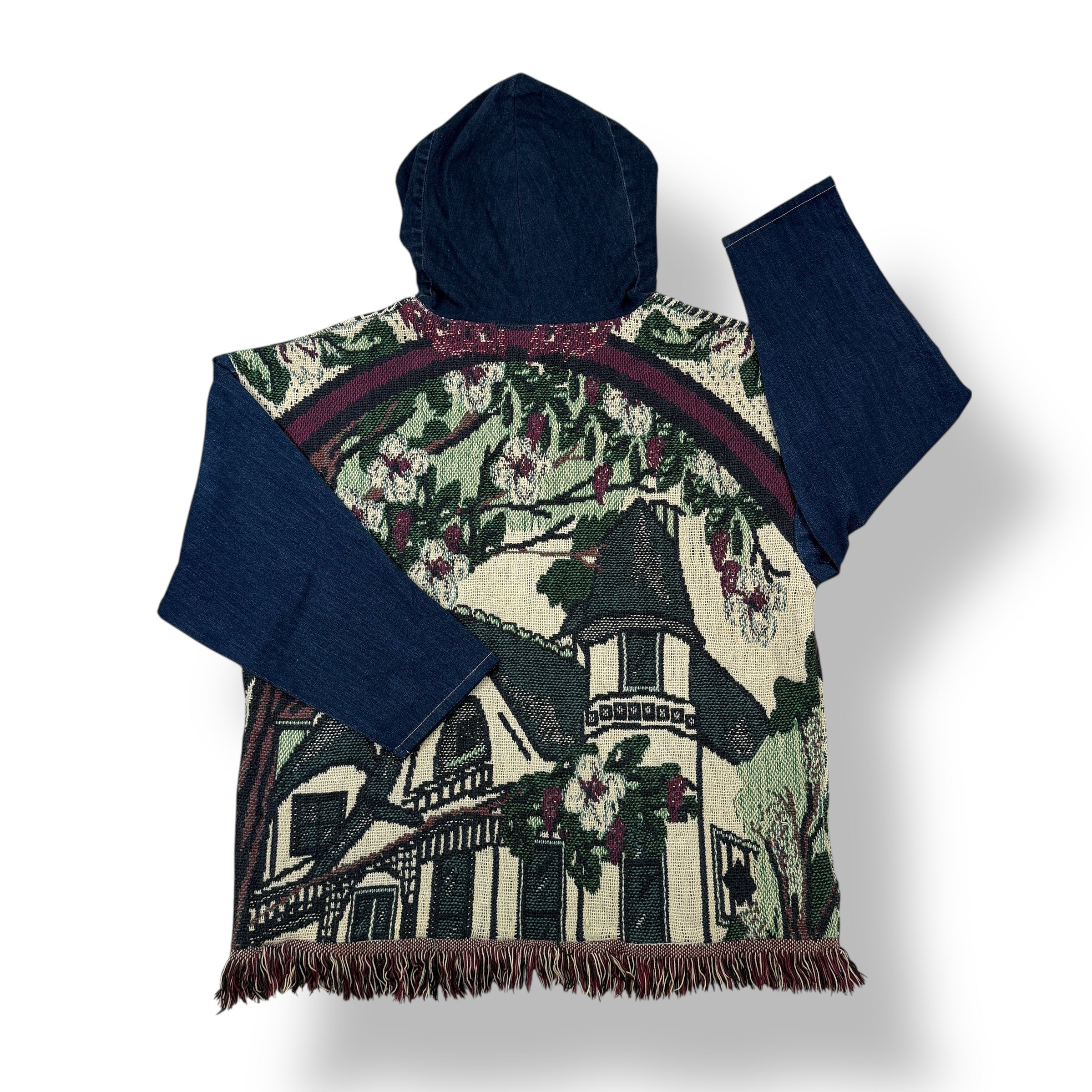 Stay stylish and sustainable with our one-of-a-kind Upcycled Denim Tapestry Hoodies from 100% secondhand textiles. Upcycled clothing. Denim Sleeve. Vintage tapestry body.
