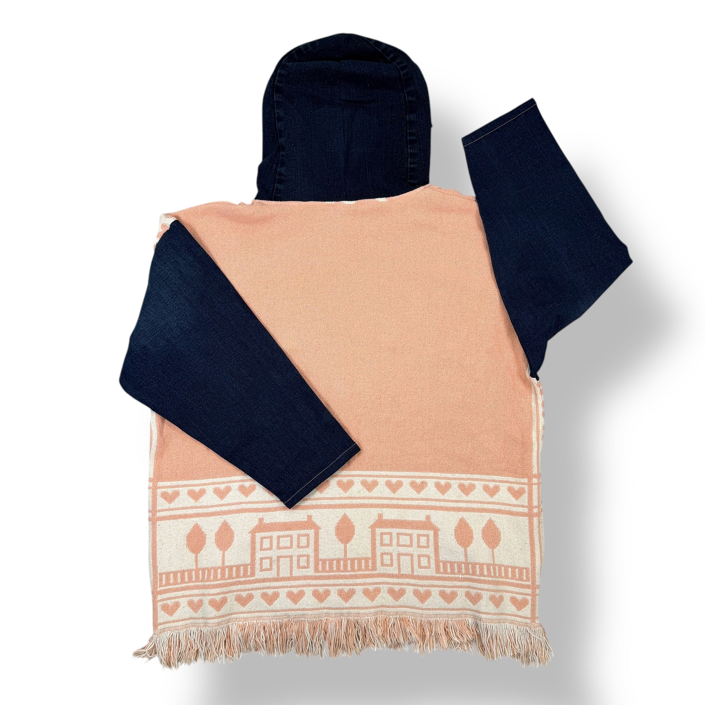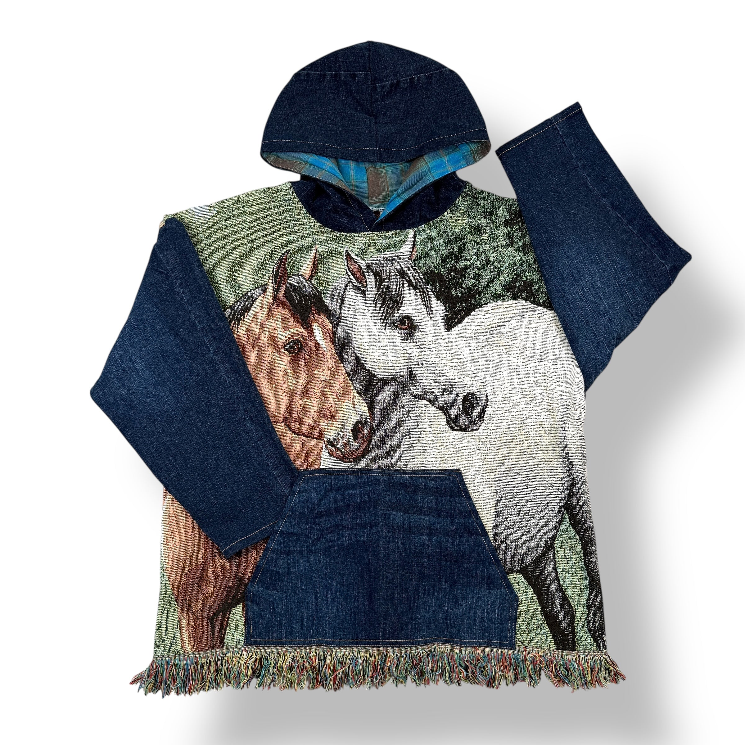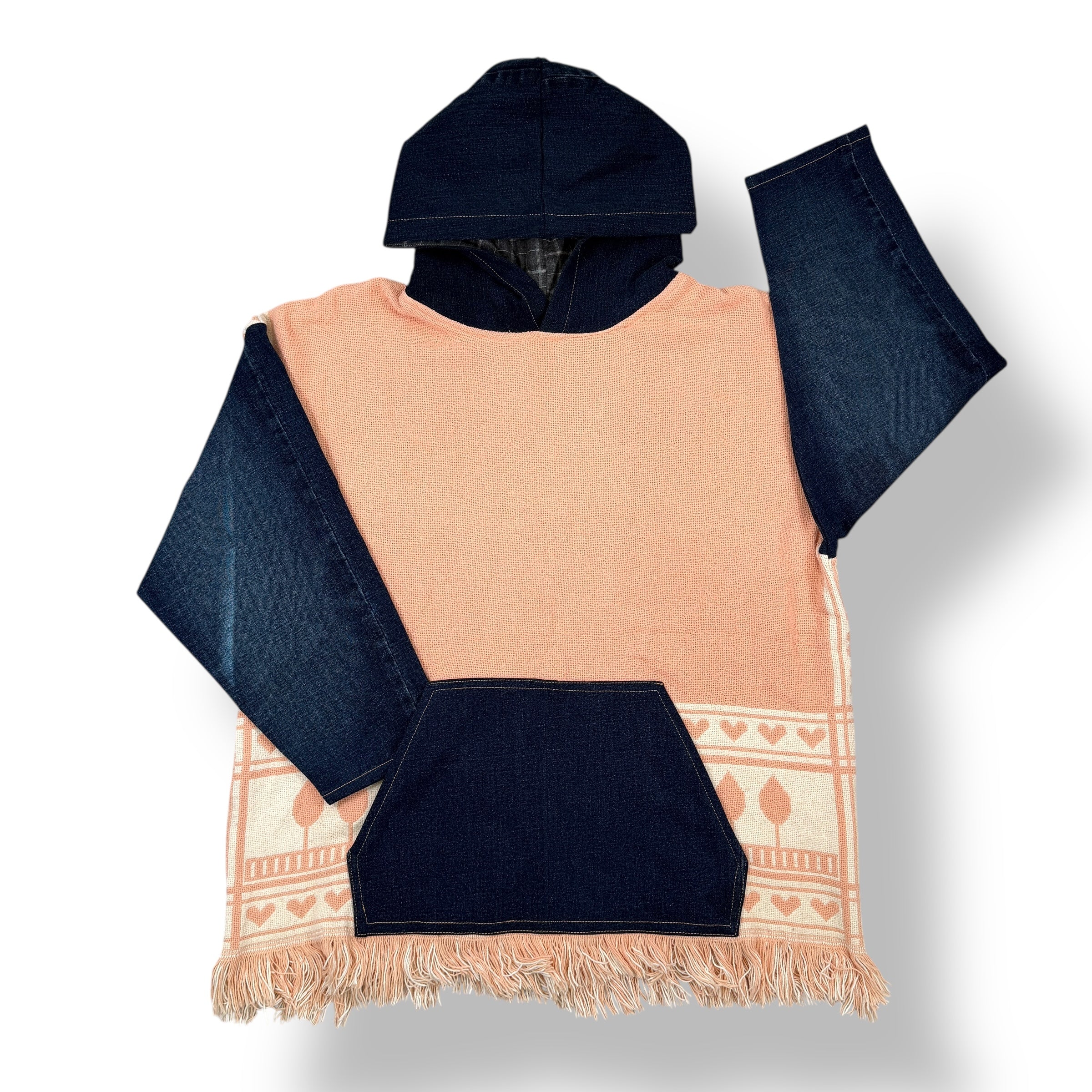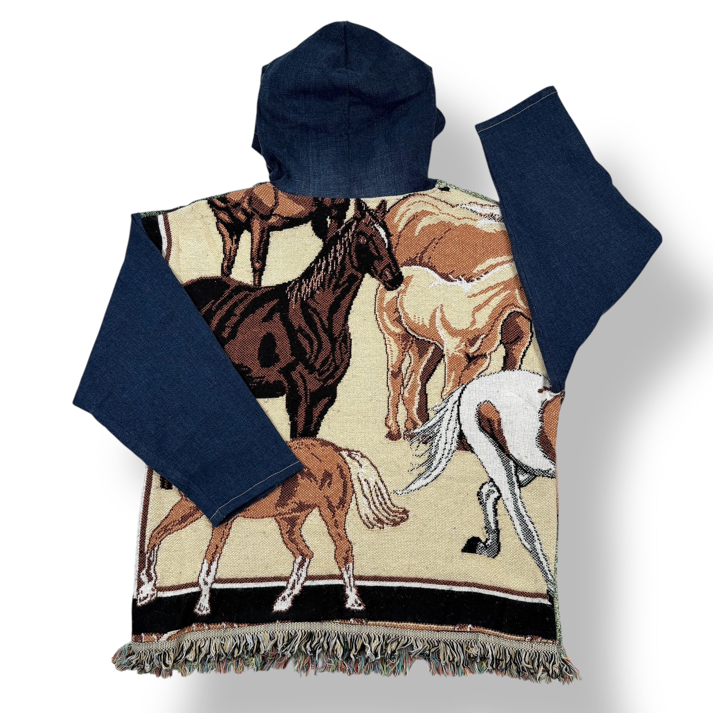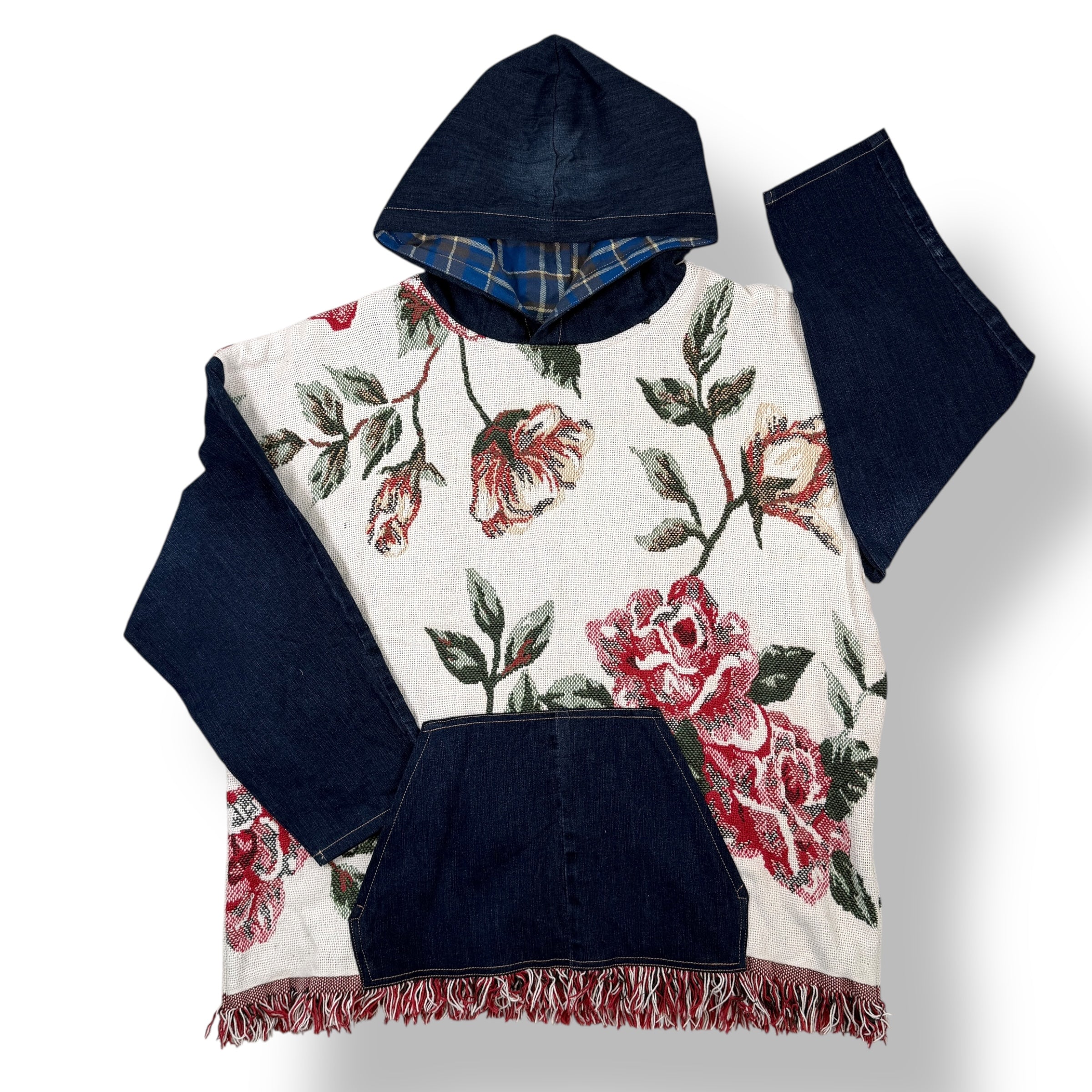 Stay stylish and sustainable with our one-of-a-kind Upcycled Denim Tapestry Hoodies from 100% secondhand textiles. Upcycled clothing. Denim Sleeve. Vintage tapestry body.