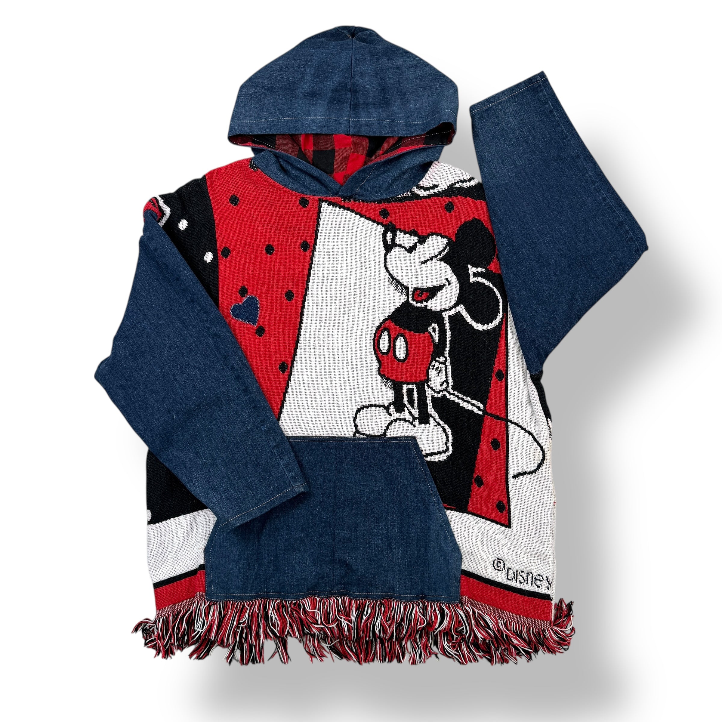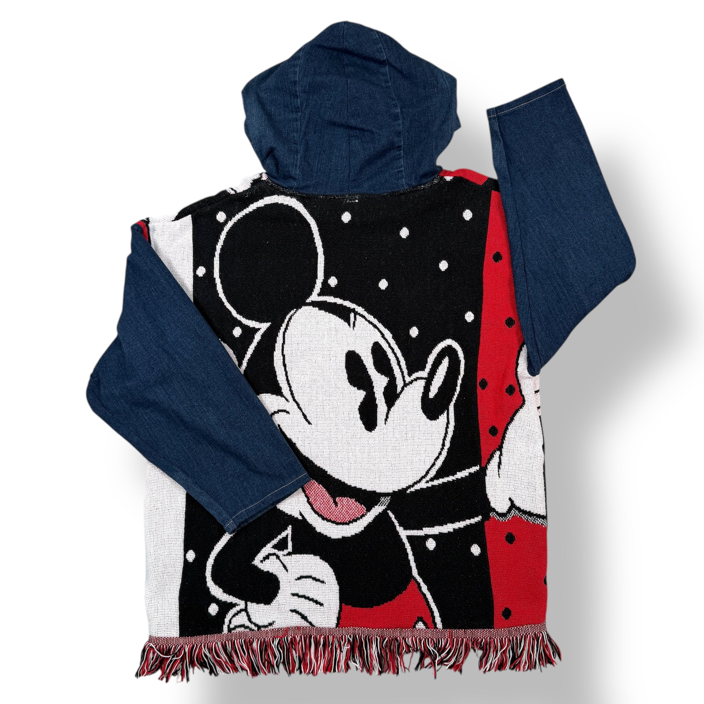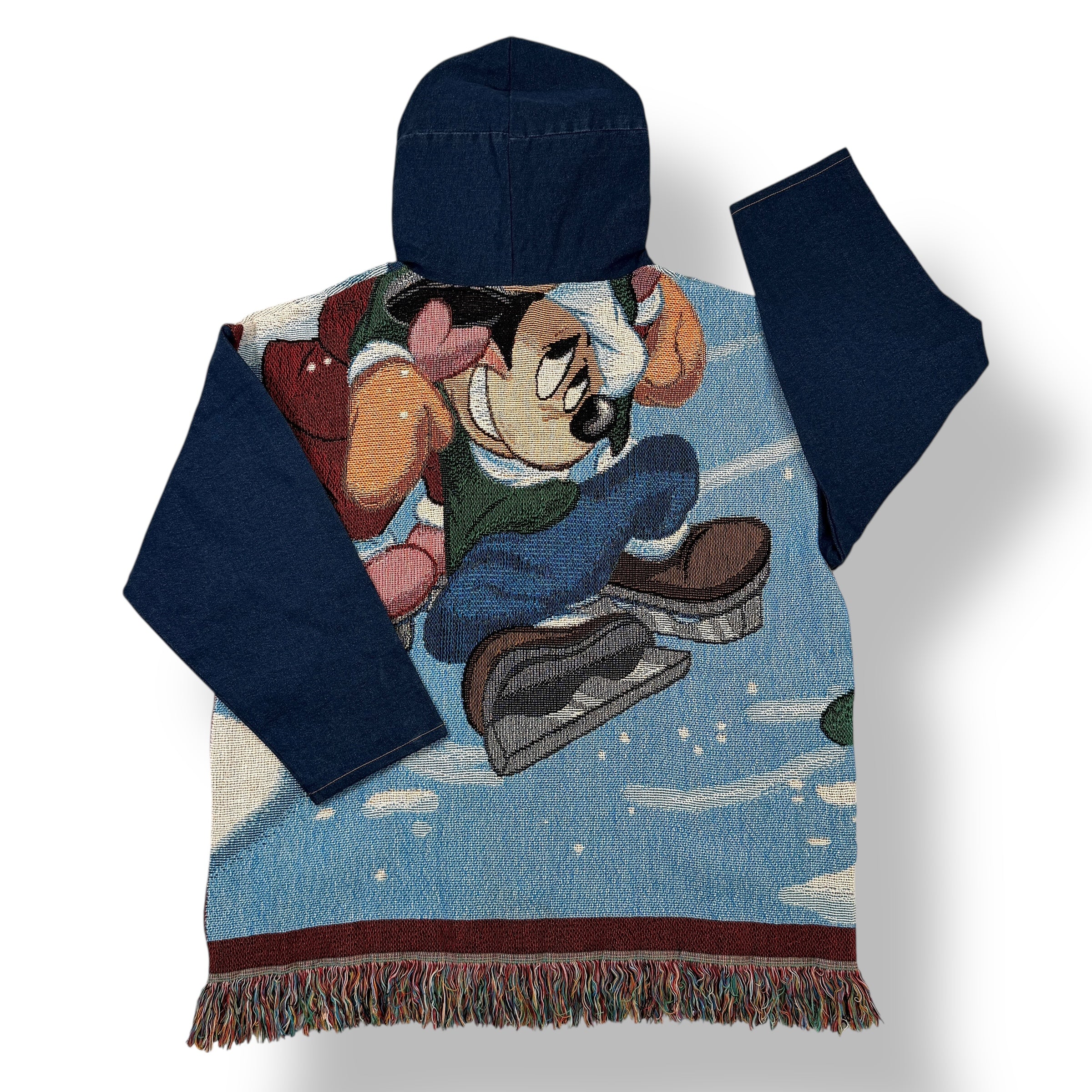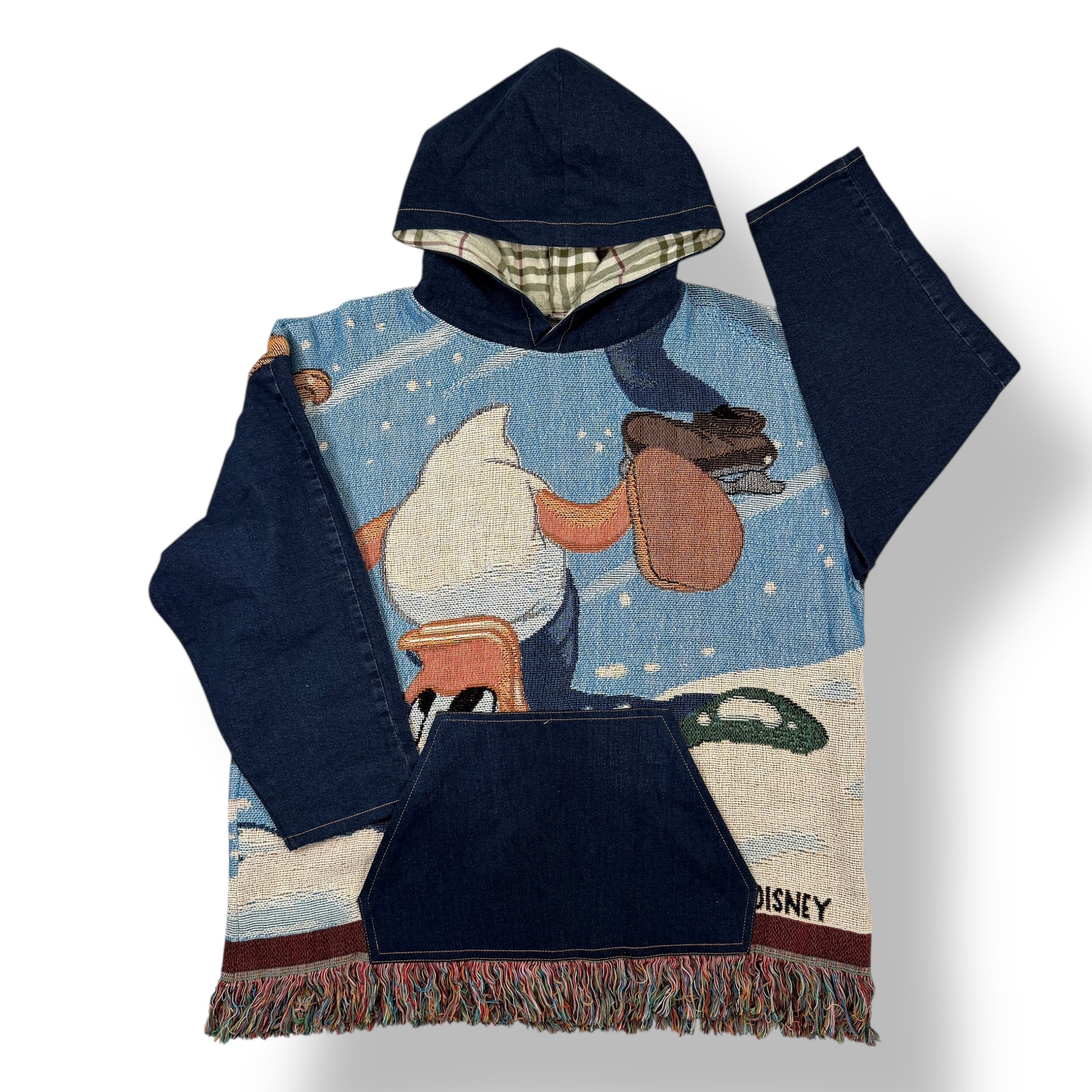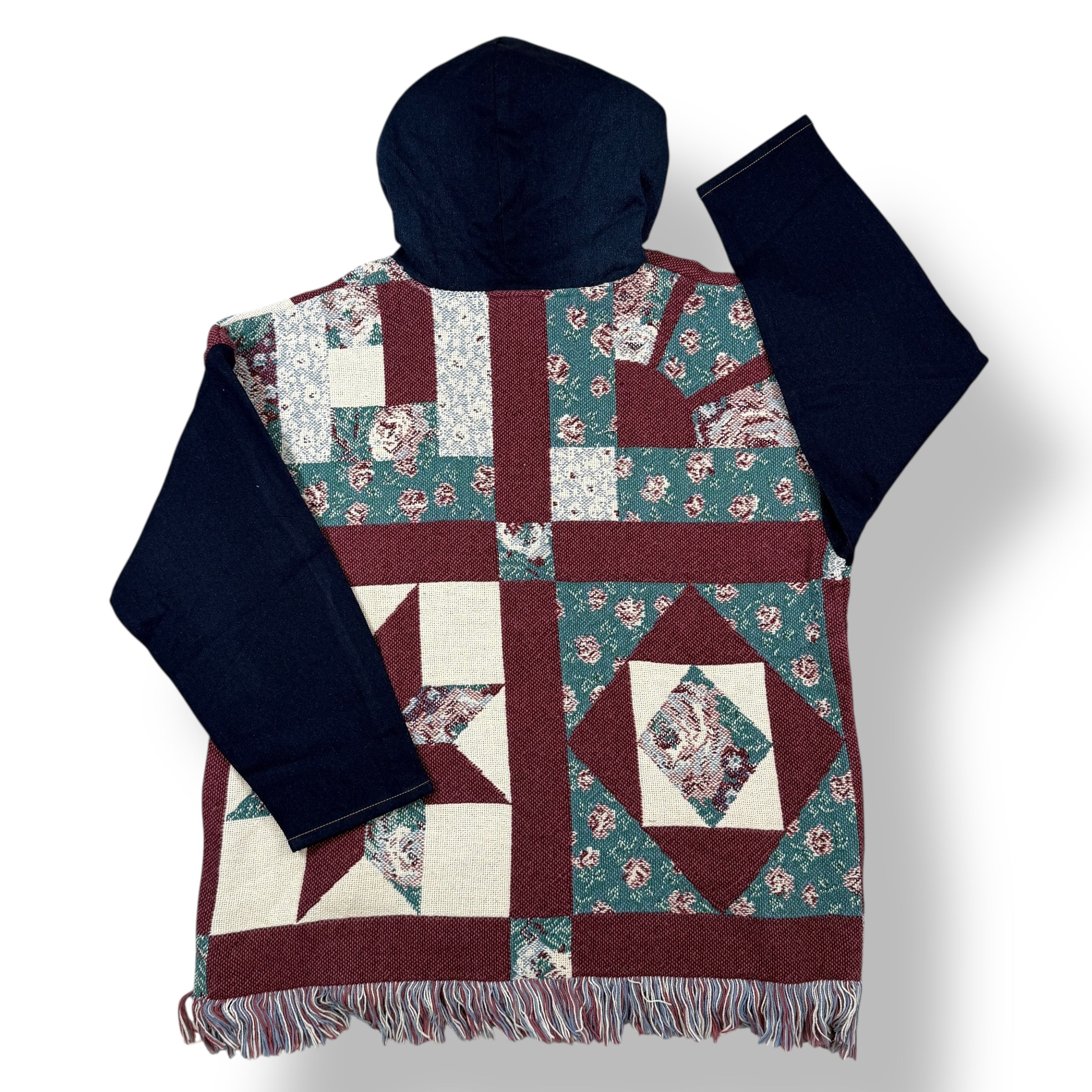 Stay stylish and sustainable with our one-of-a-kind Upcycled Denim Tapestry Hoodies from 100% secondhand textiles. Upcycled clothing. Denim Sleeve. Vintage tapestry body.