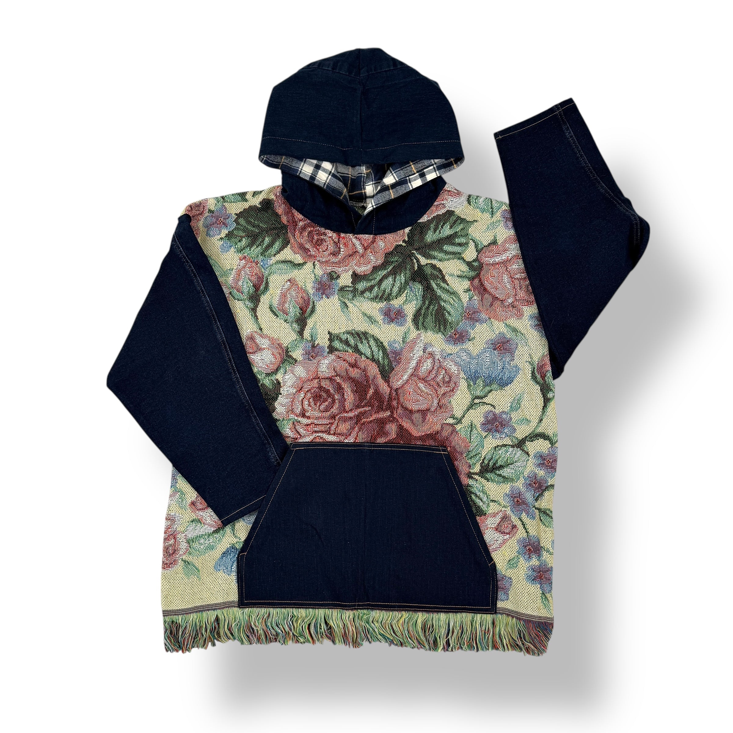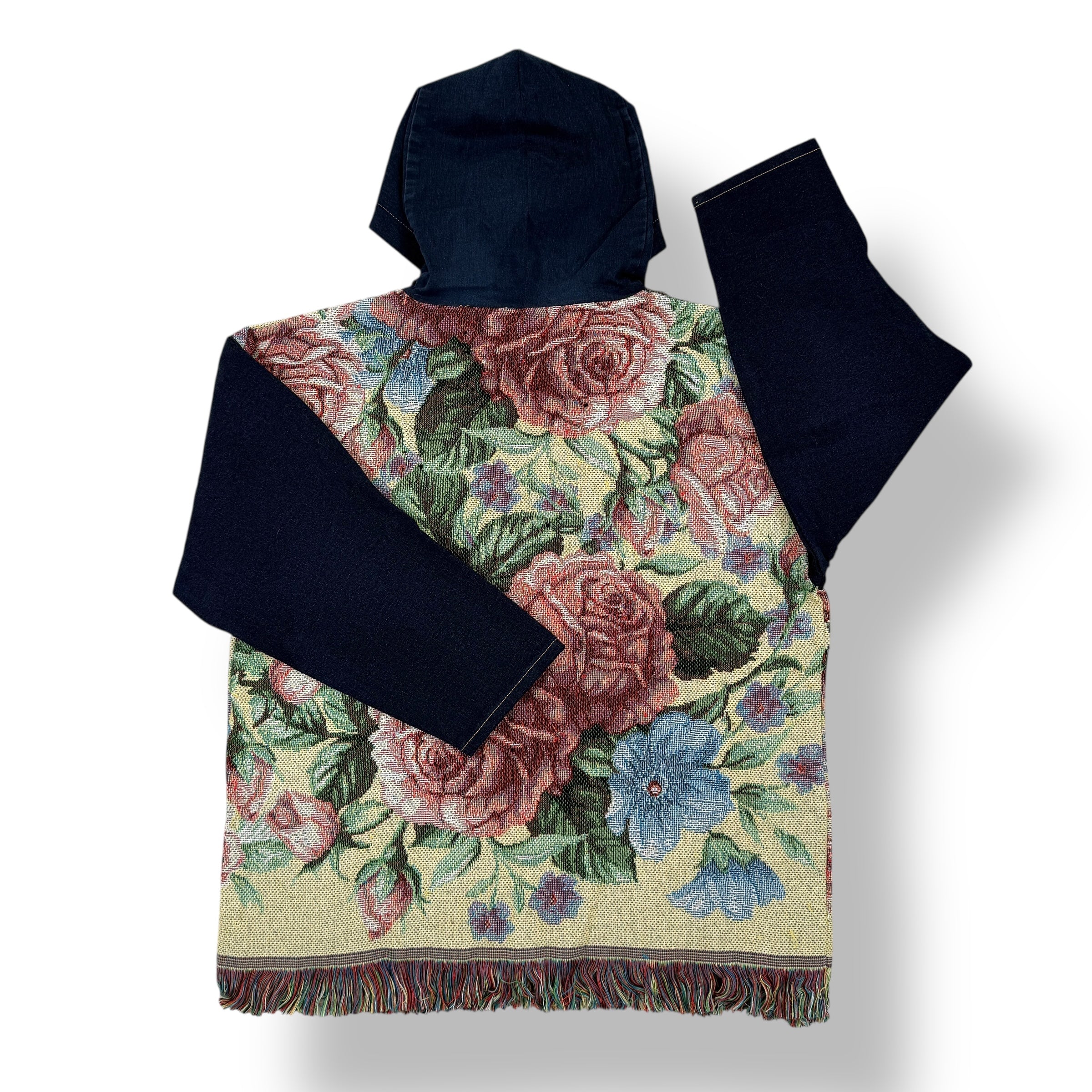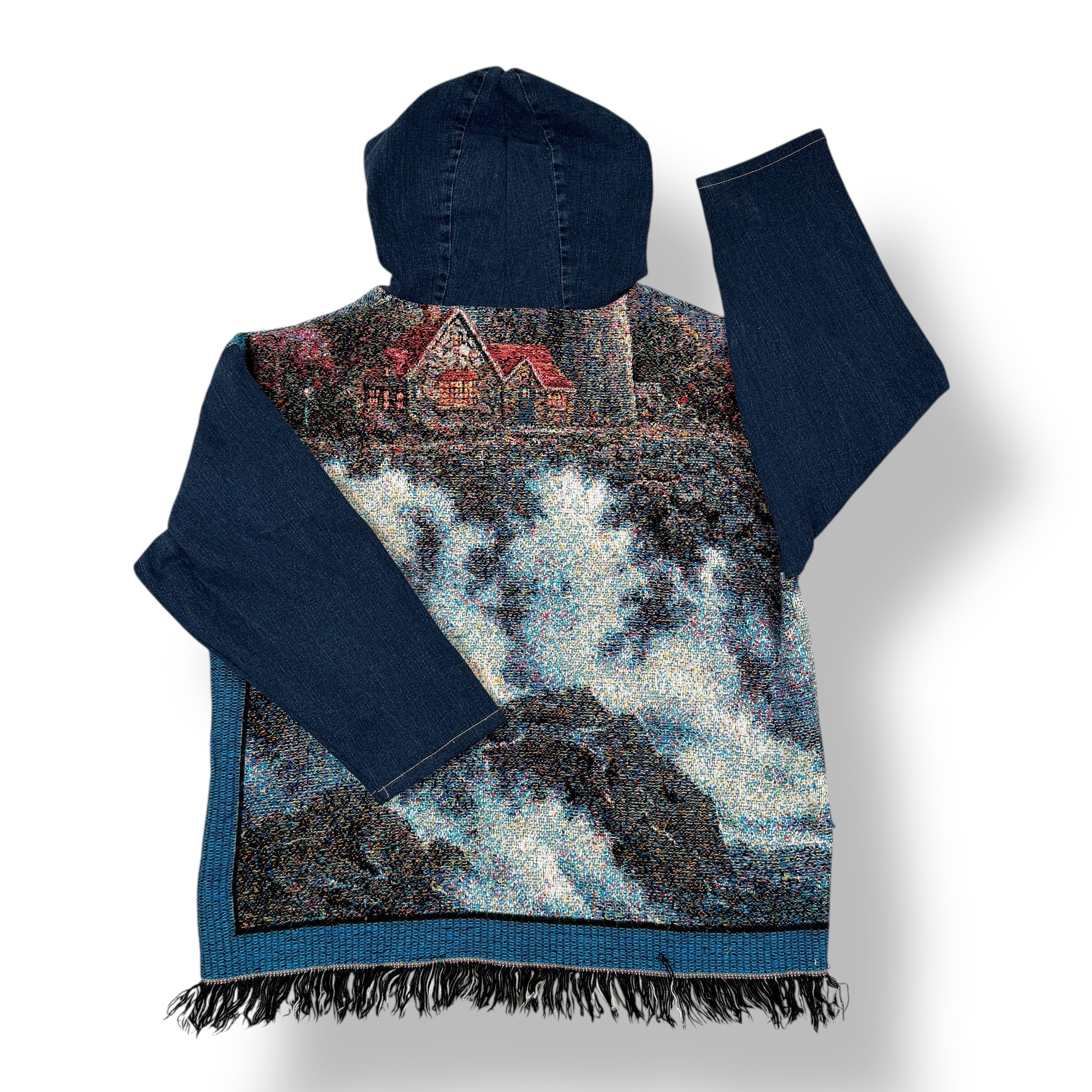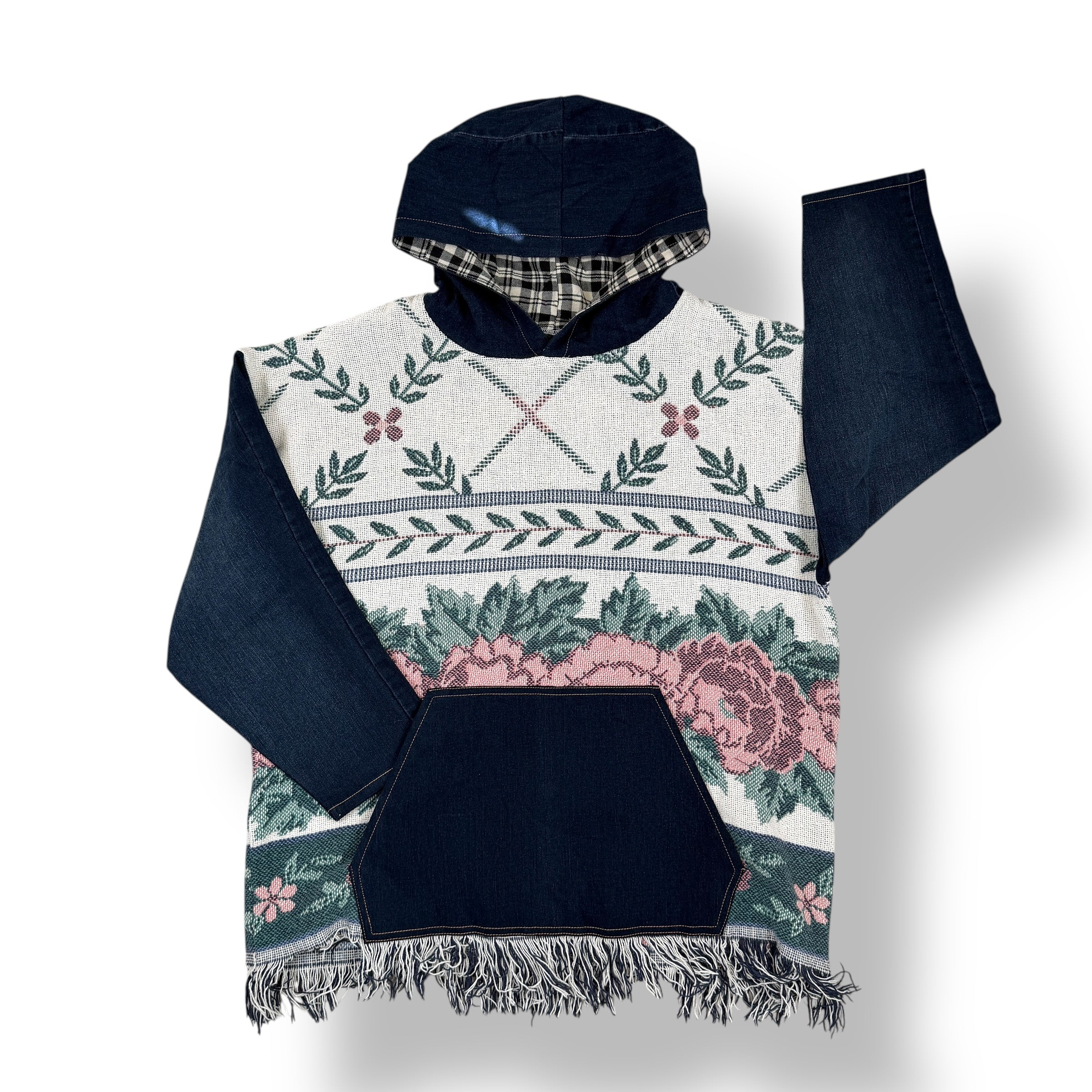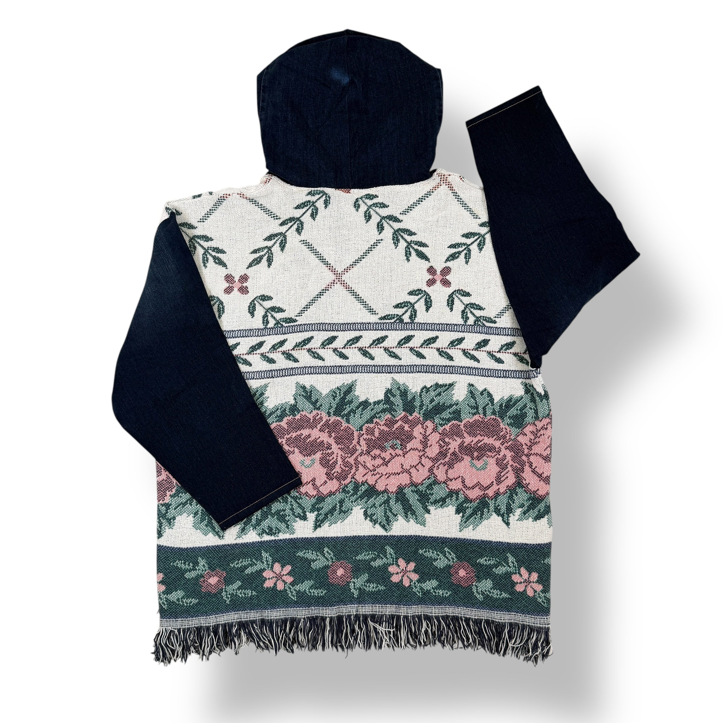 Stay stylish and sustainable with our one-of-a-kind Upcycled Denim Tapestry Hoodies from 100% secondhand textiles. Upcycled clothing. Denim Sleeve. Vintage tapestry body.