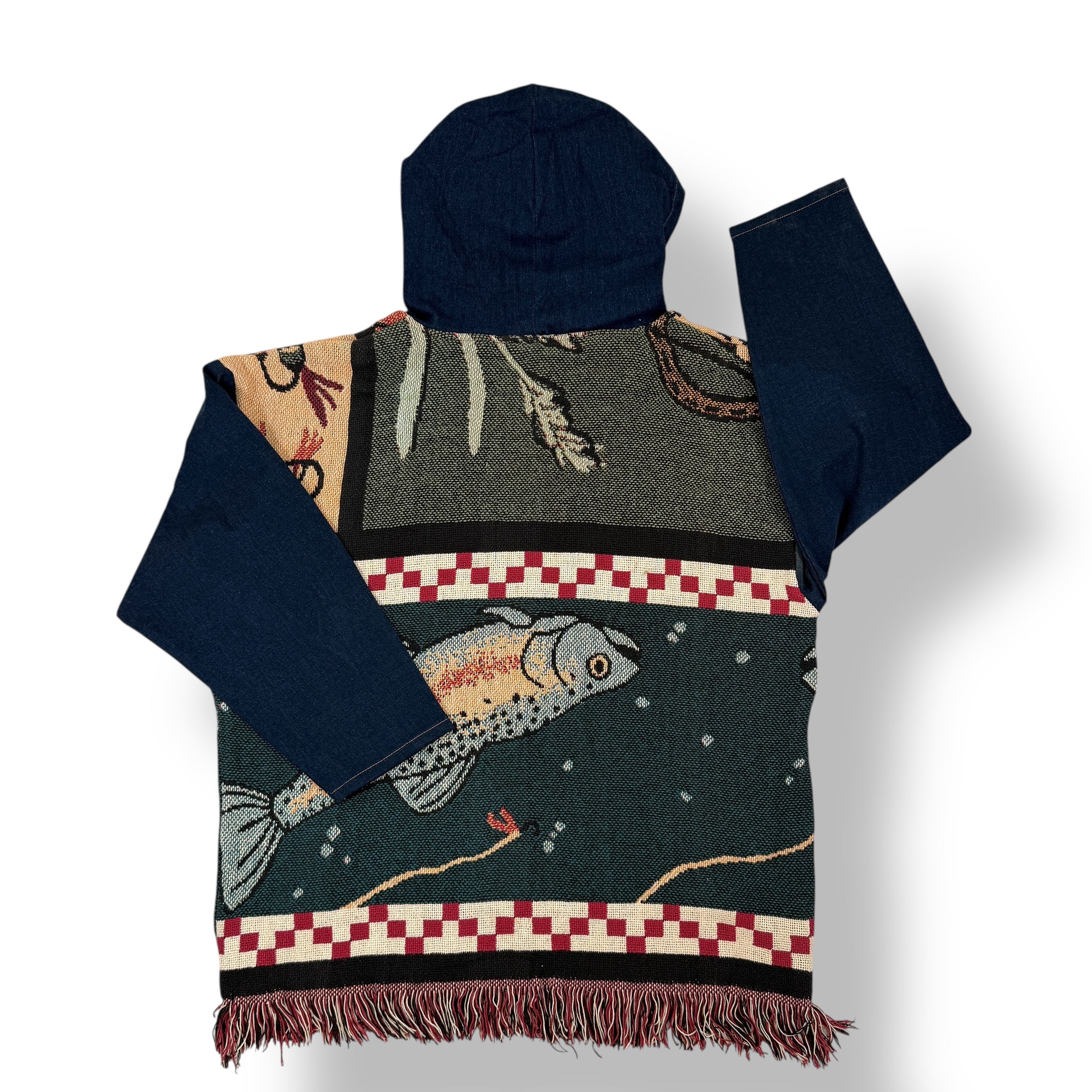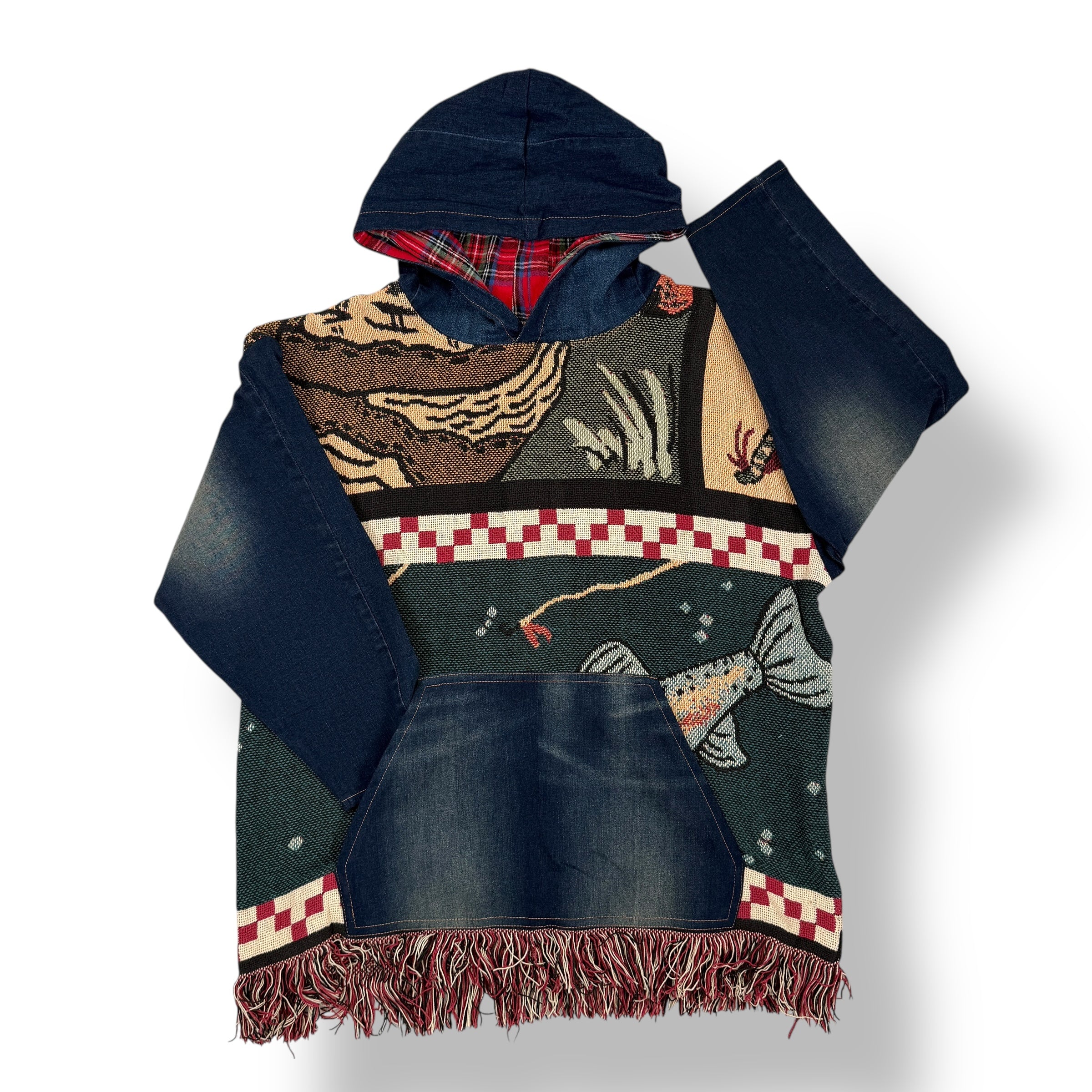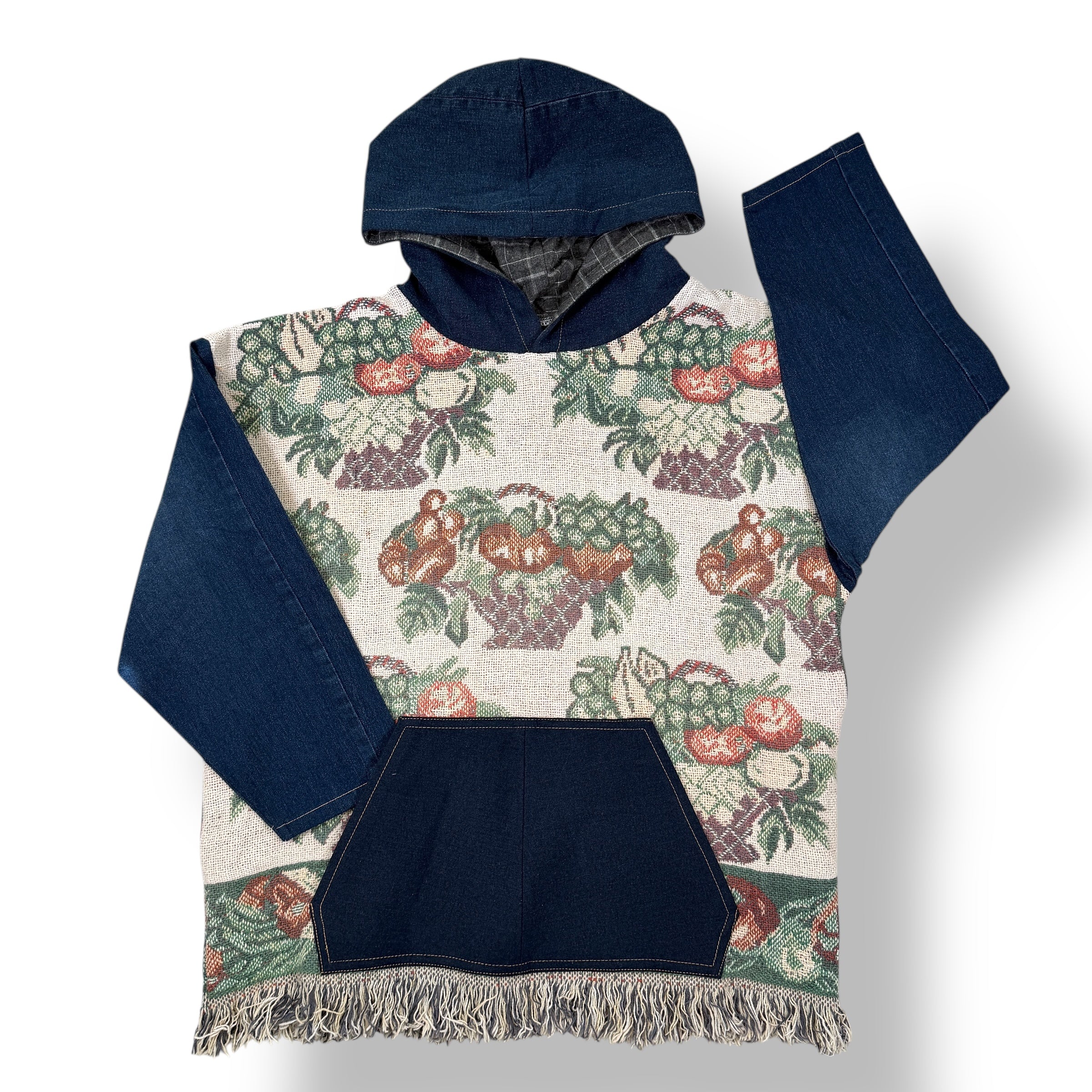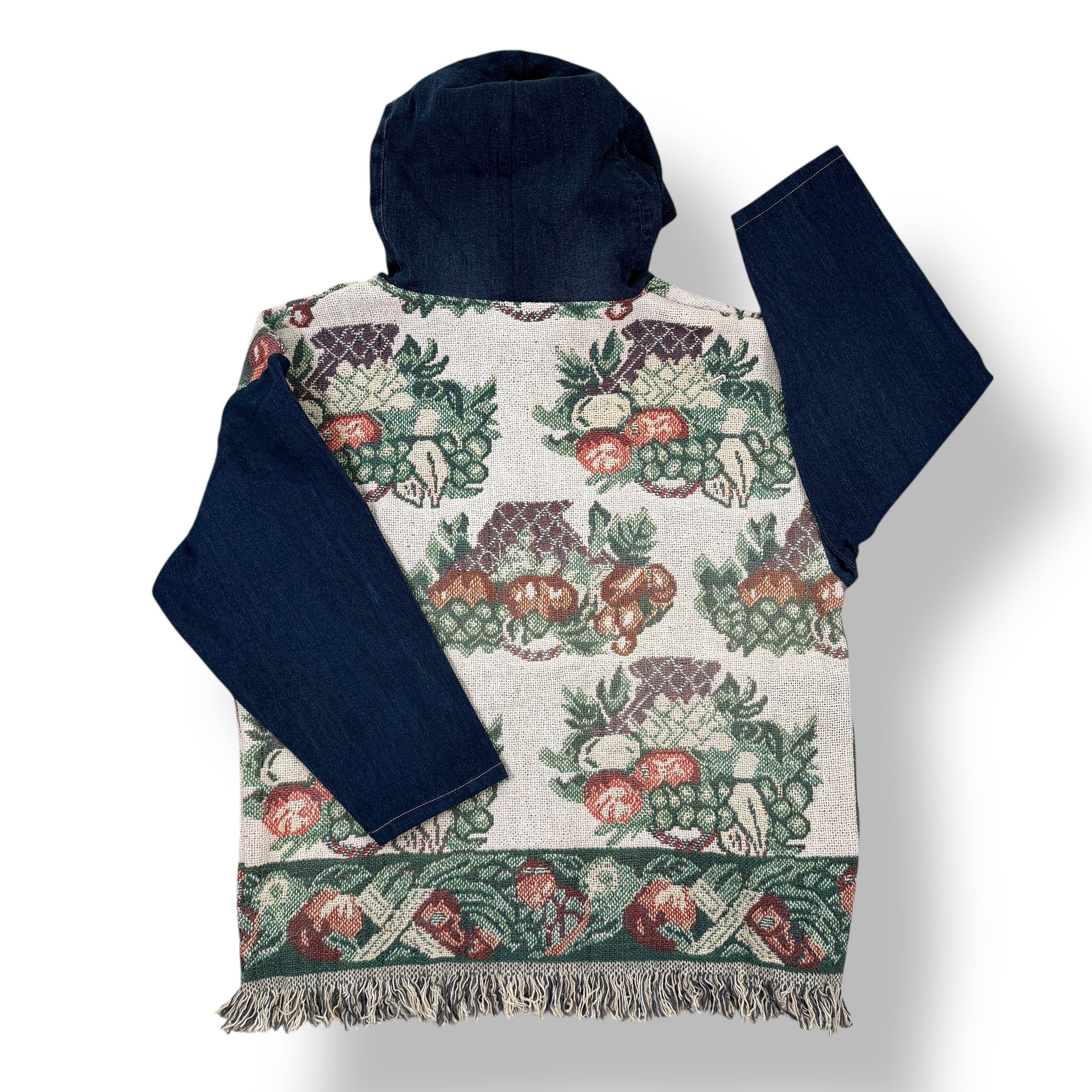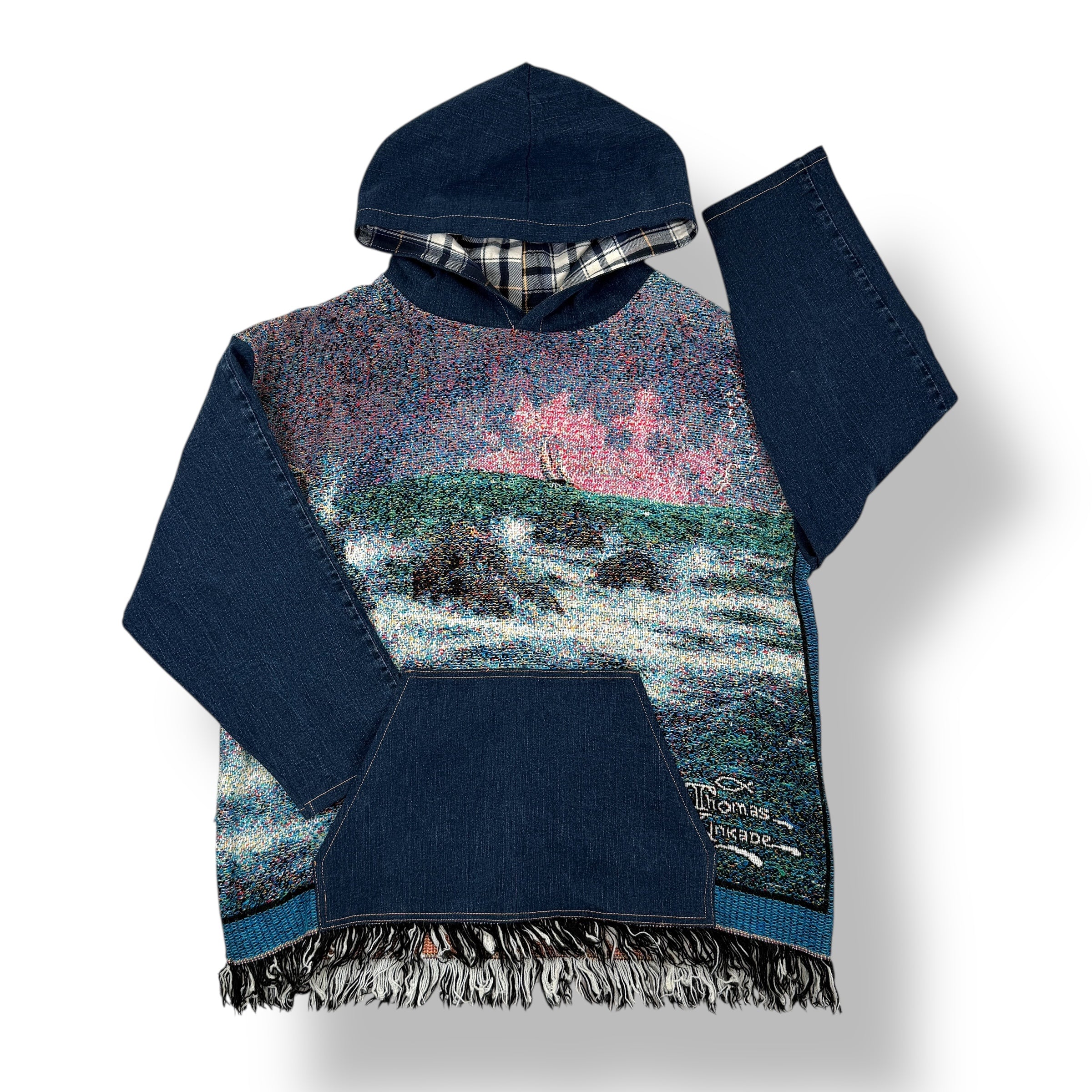 Stay stylish and sustainable with our one-of-a-kind Upcycled Denim Tapestry Hoodies from 100% secondhand textiles. Upcycled clothing. Denim Sleeve. Vintage tapestry body.