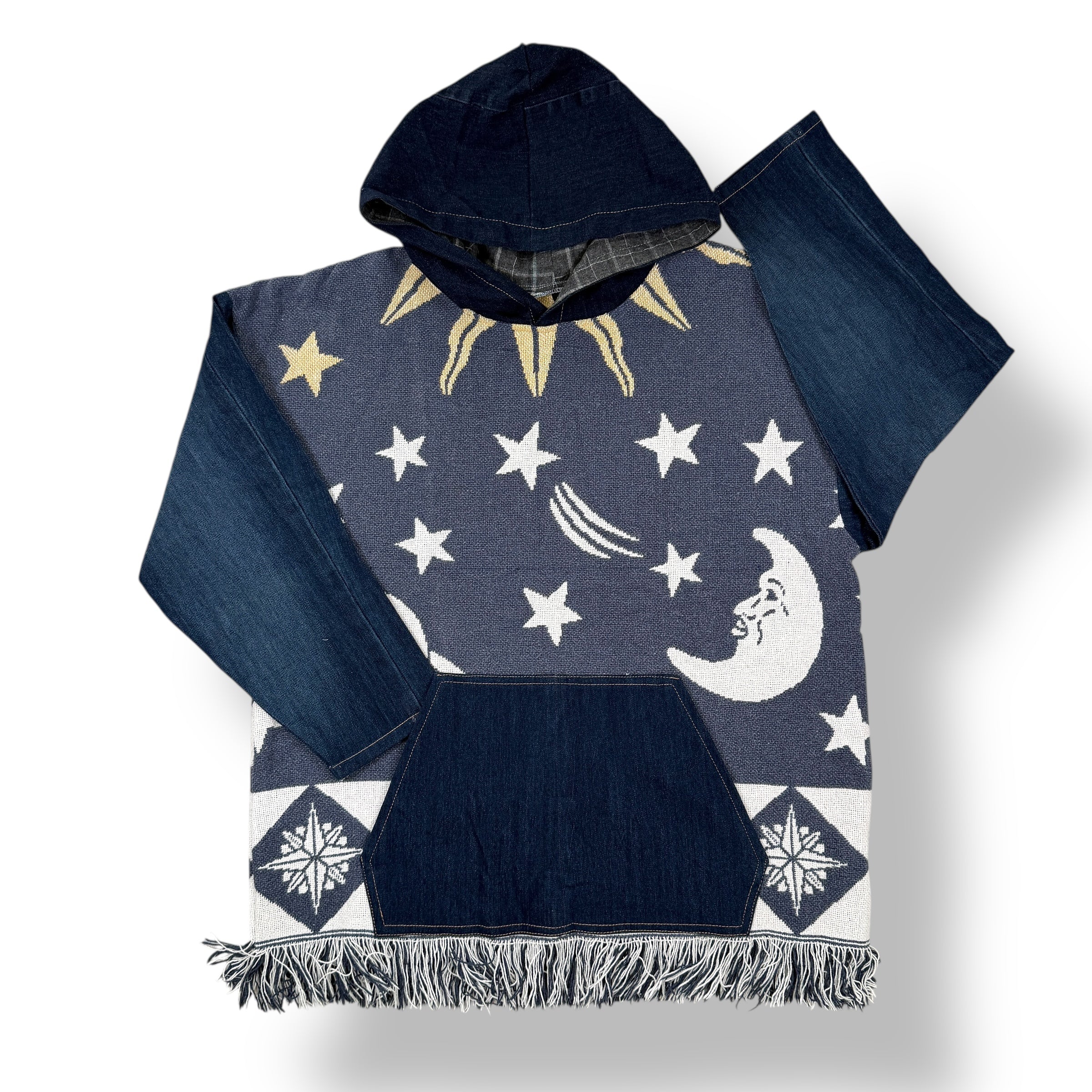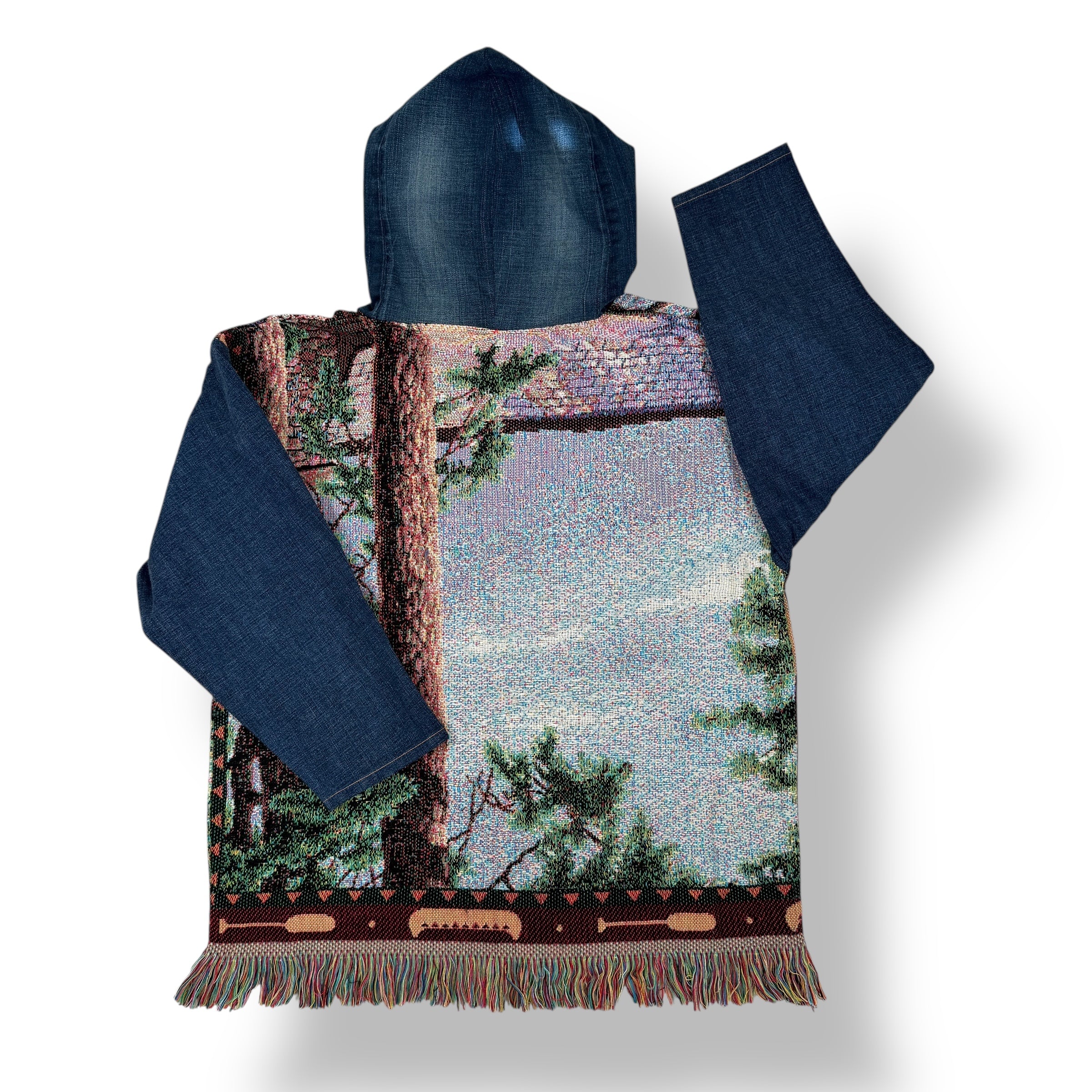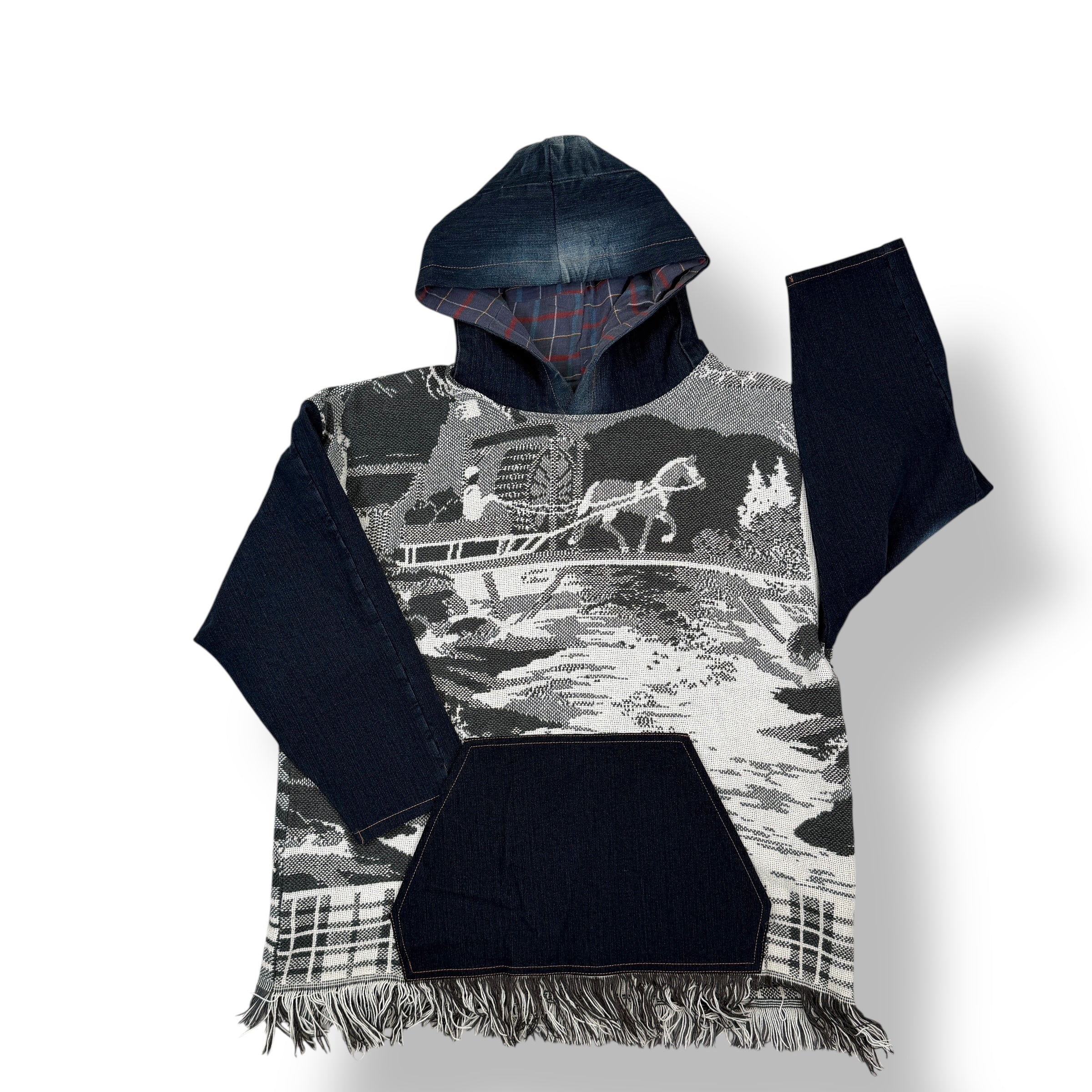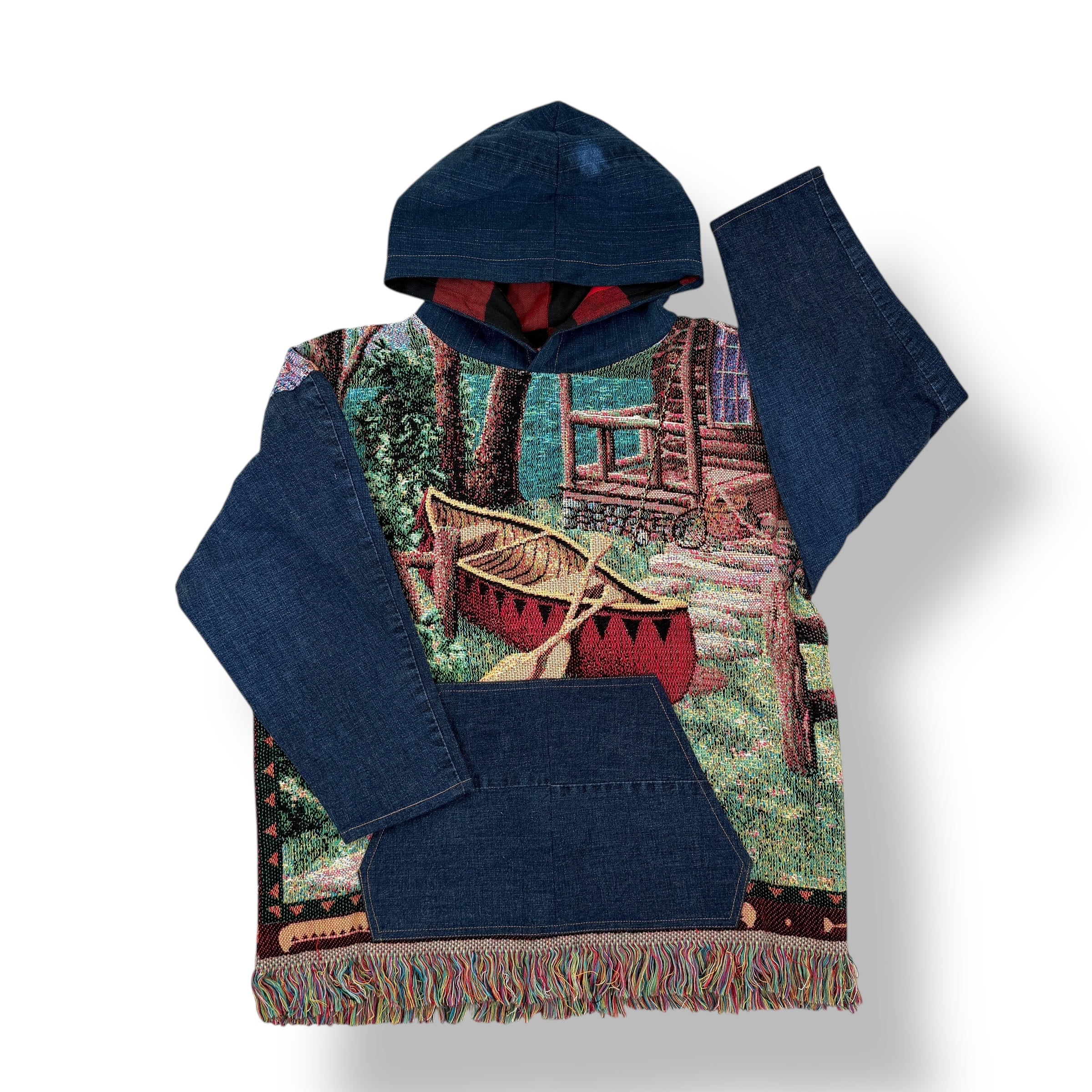 Stay stylish and sustainable with our one-of-a-kind Upcycled Denim Tapestry Hoodies from 100% secondhand textiles. Upcycled clothing. Denim Sleeve. Vintage tapestry body.