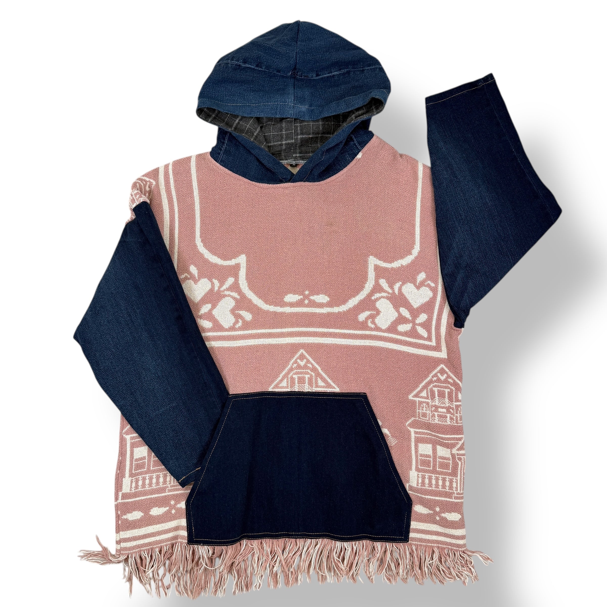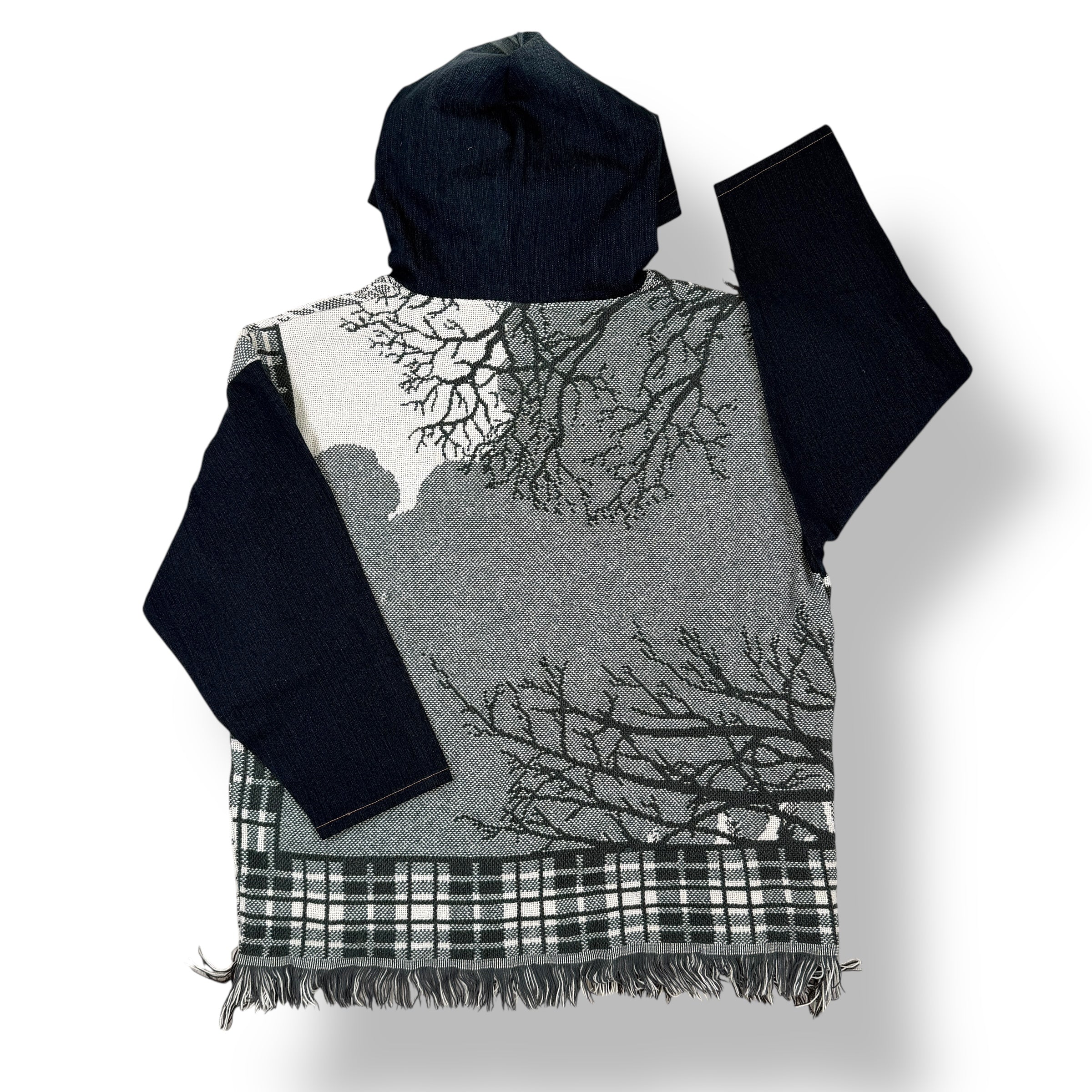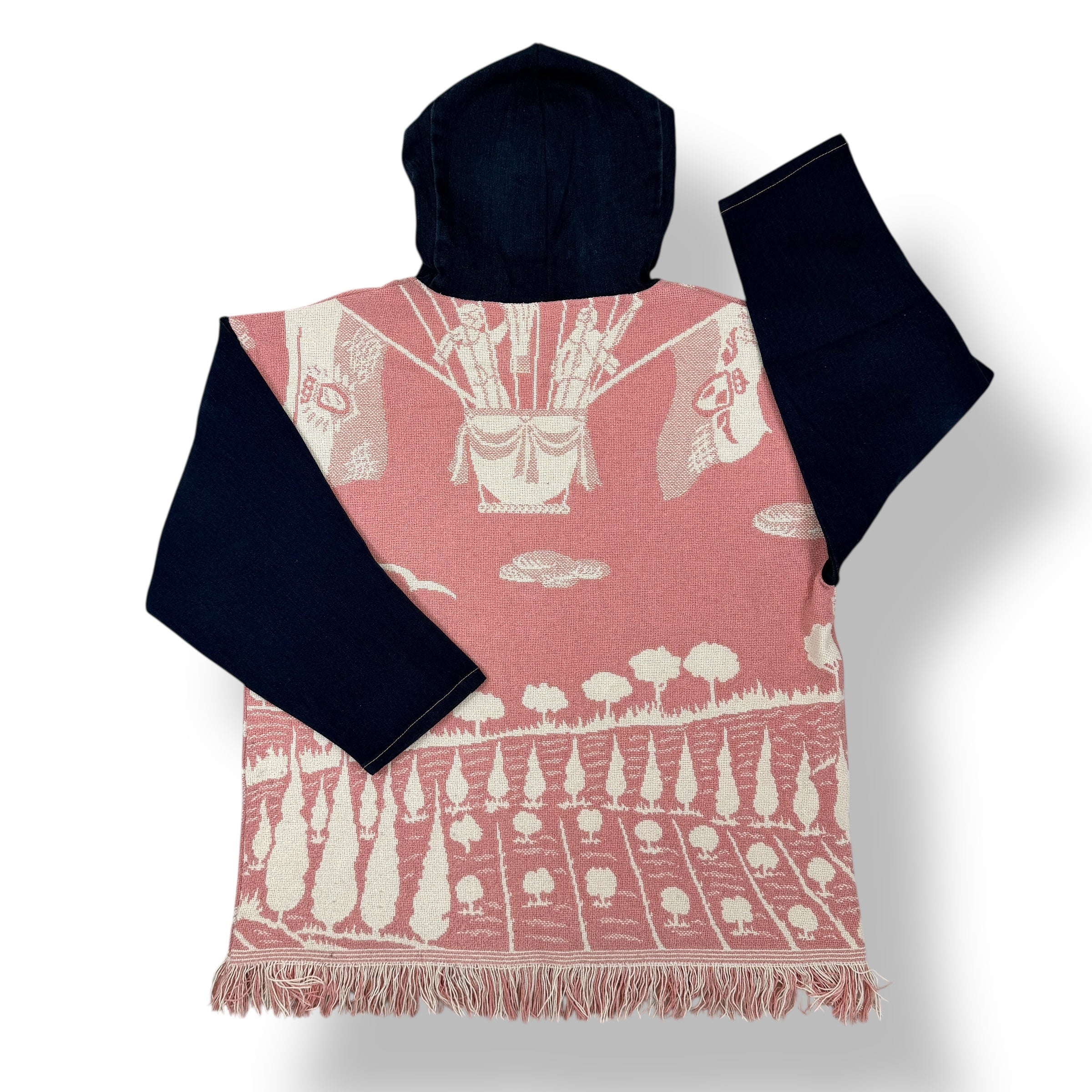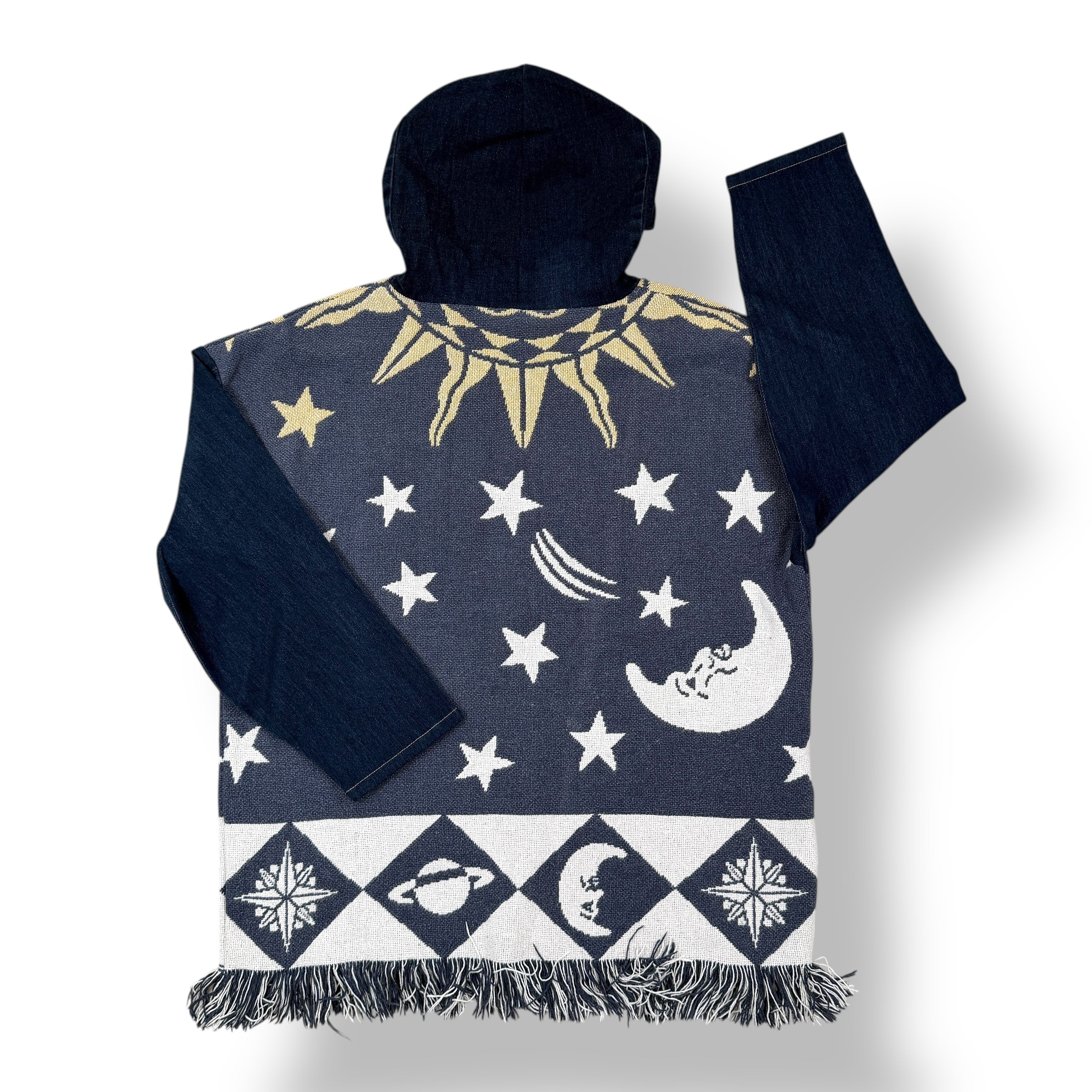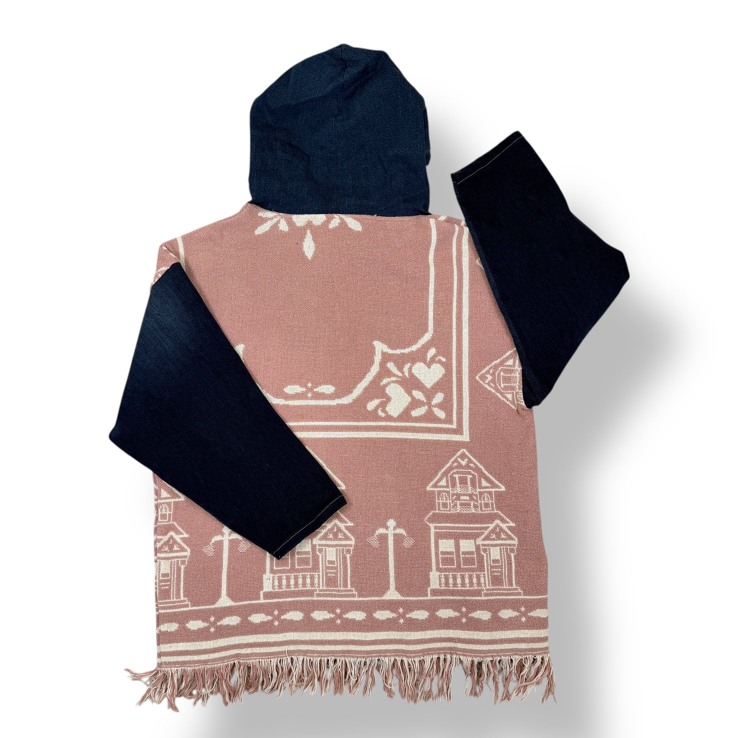 Stay stylish and sustainable with our one-of-a-kind Upcycled Denim Tapestry Hoodies from 100% secondhand textiles. Upcycled clothing. Denim Sleeve. Vintage tapestry body.