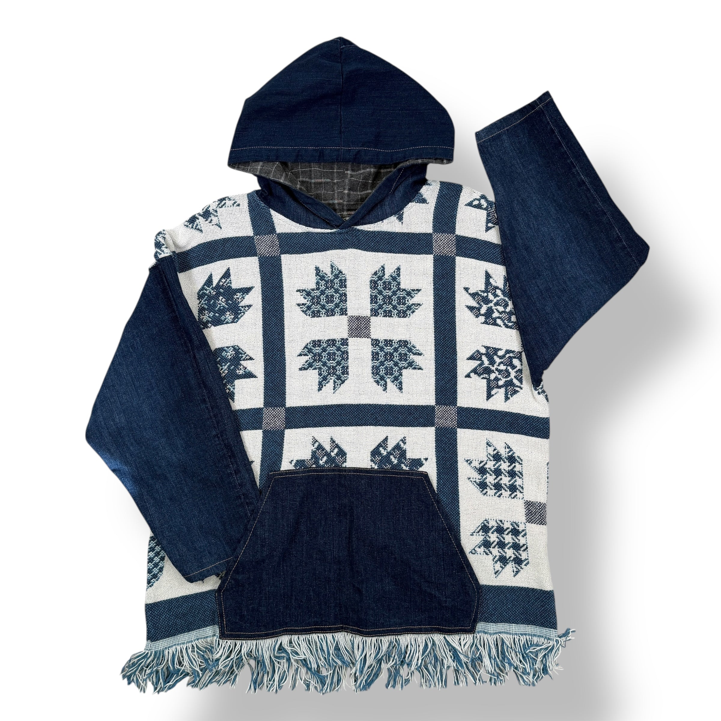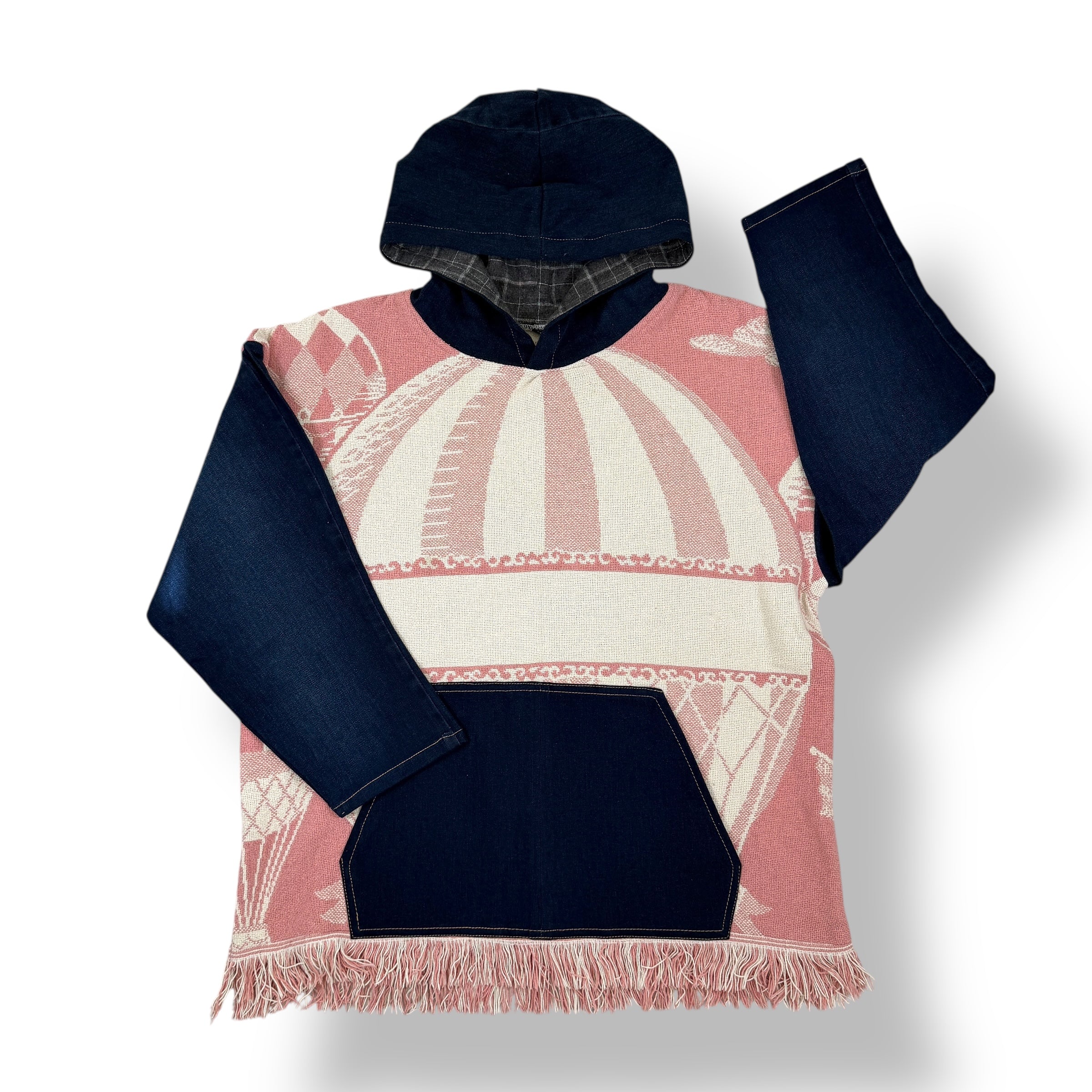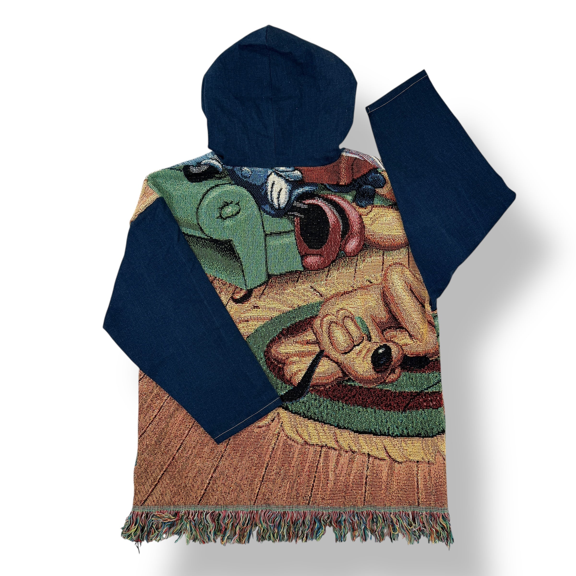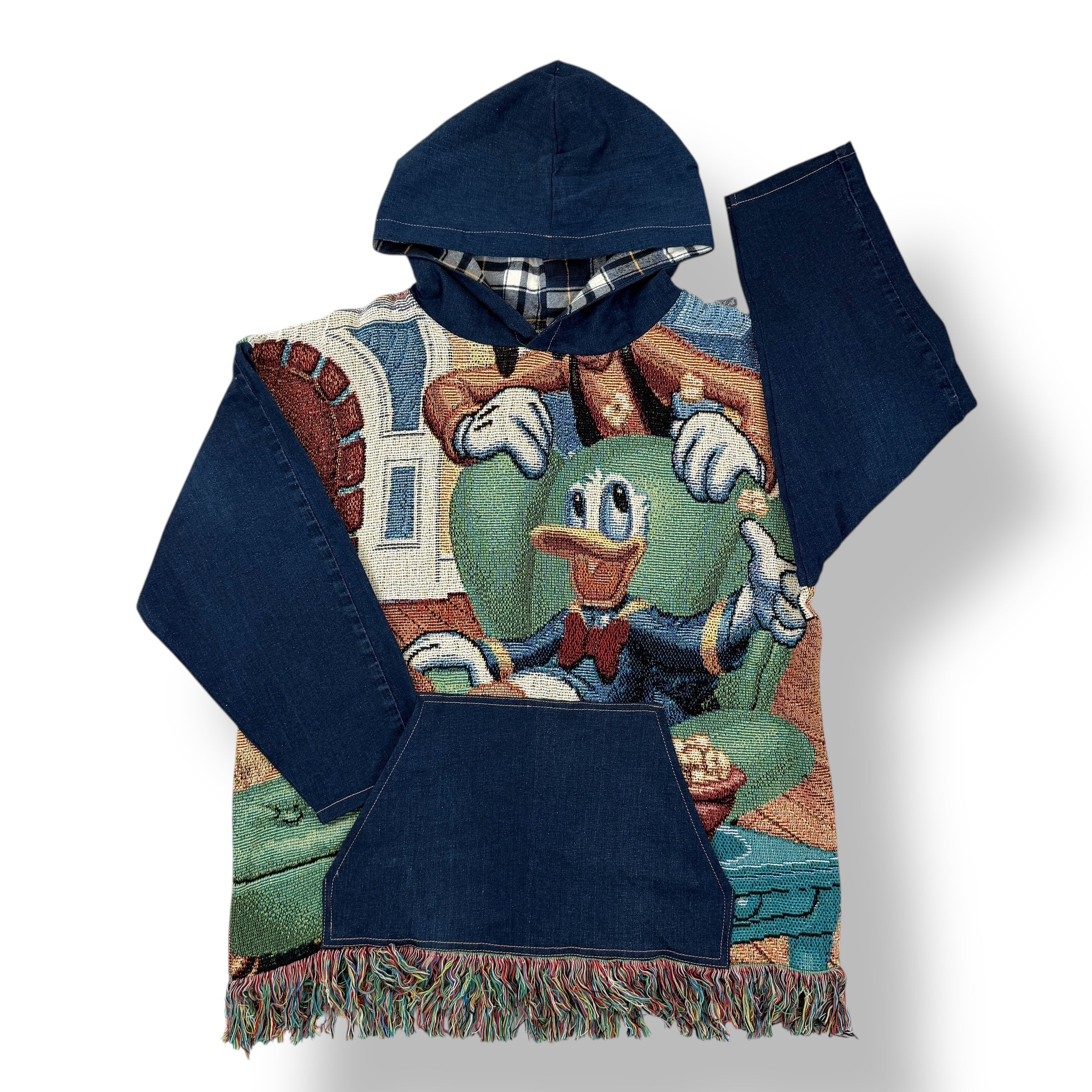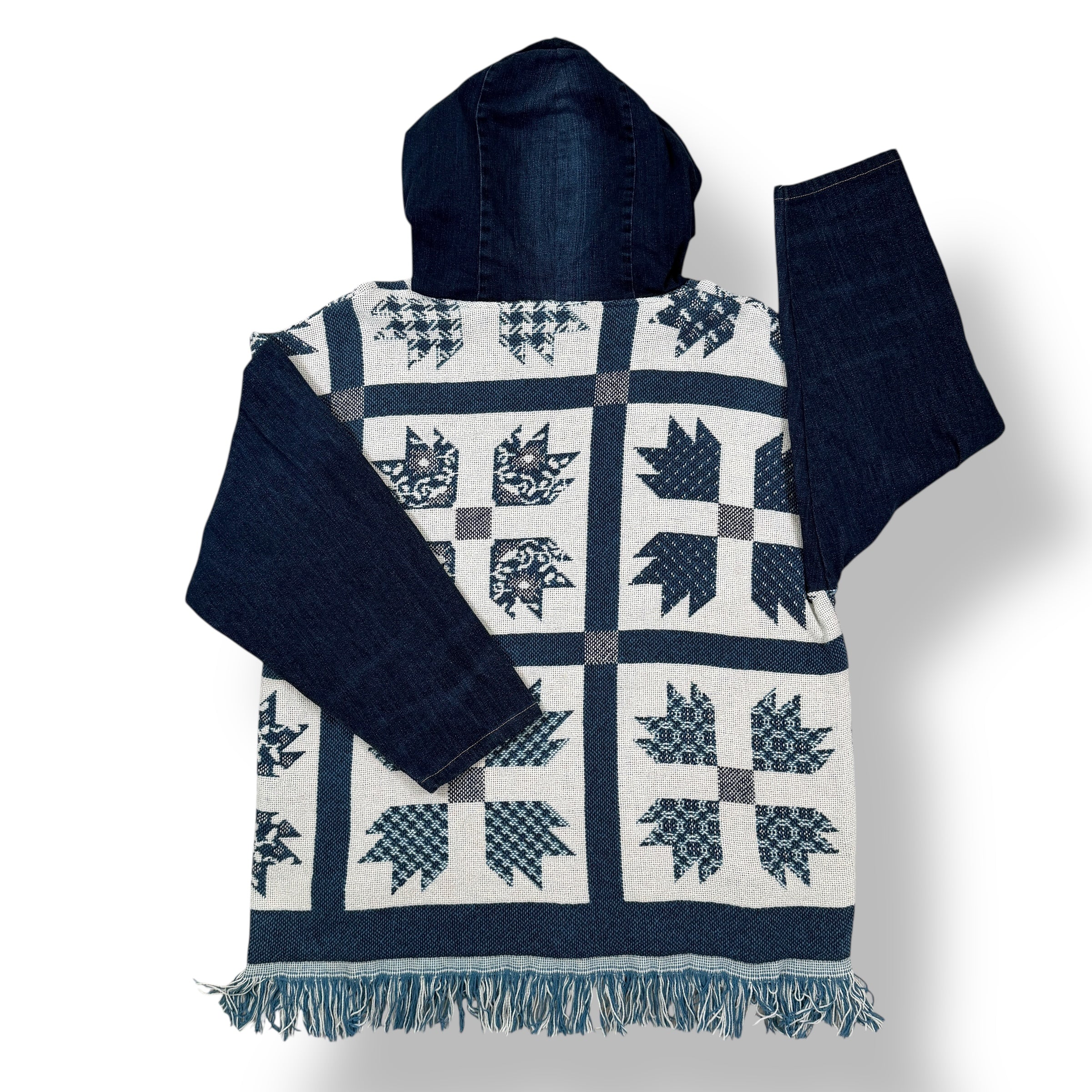Stay stylish and sustainable with our one-of-a-kind Upcycled Denim Tapestry Hoodies from 100% secondhand textiles. Upcycled clothing. Denim Sleeve. Vintage tapestry body.