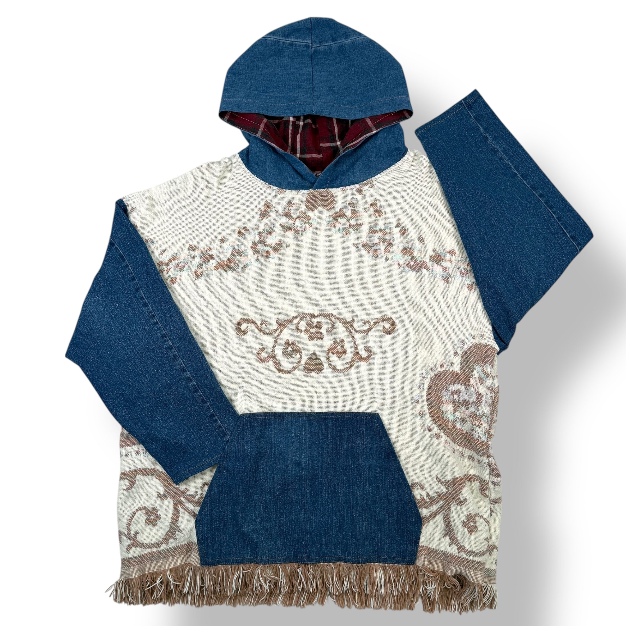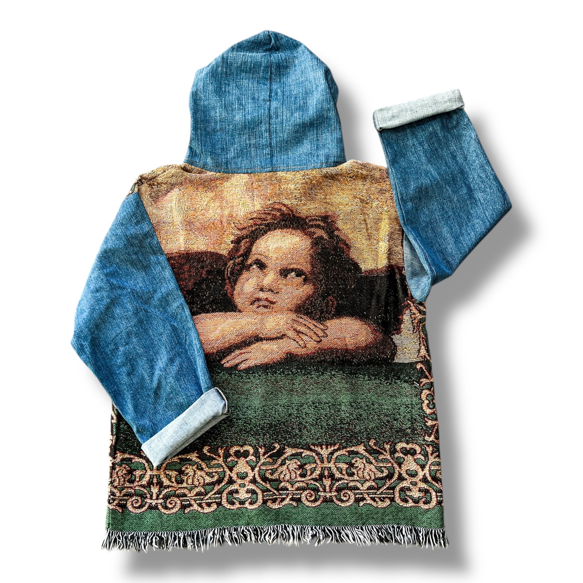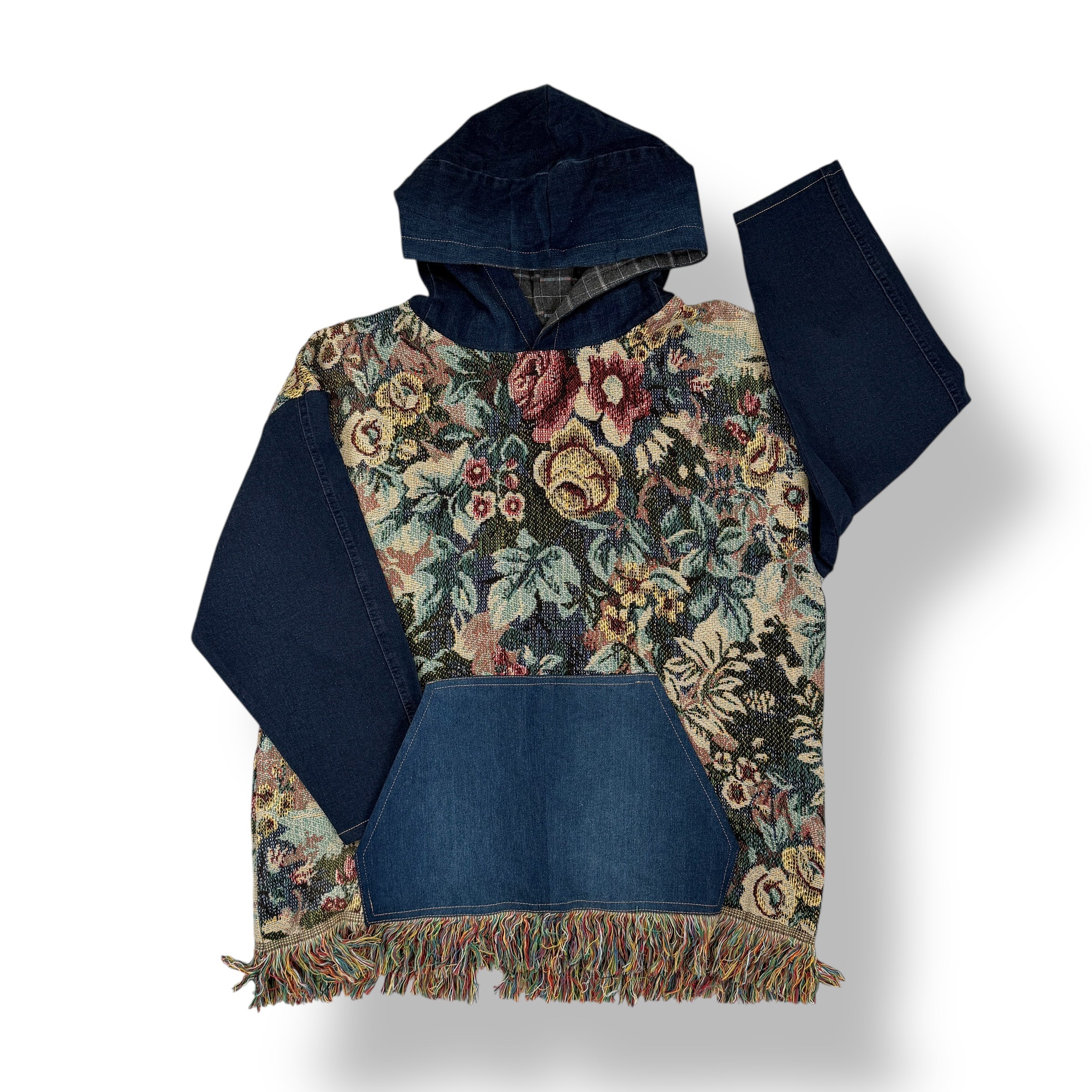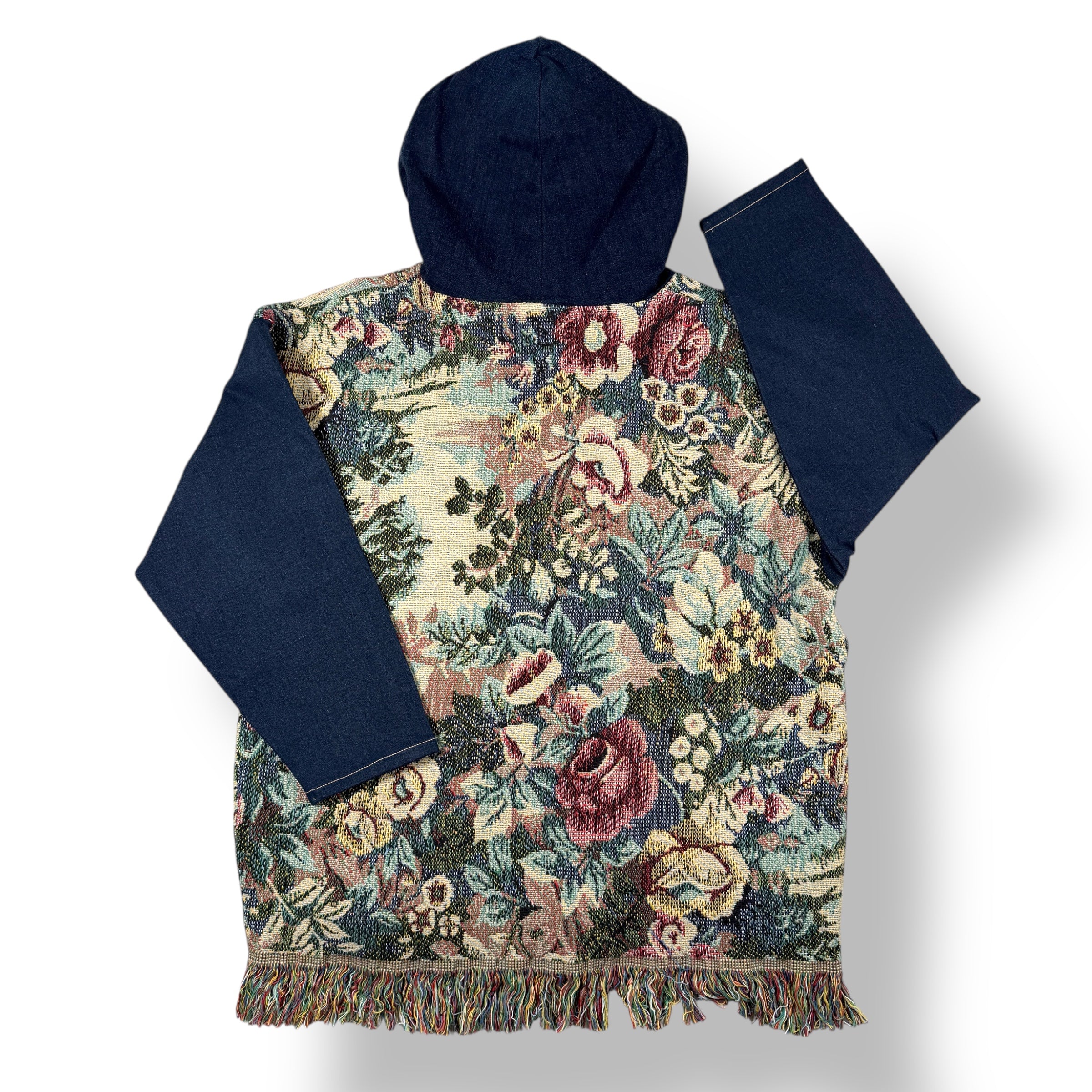 Stay stylish and sustainable with our one-of-a-kind Upcycled Denim Tapestry Hoodies from 100% secondhand textiles. Upcycled clothing. Denim Sleeve. Vintage tapestry body.