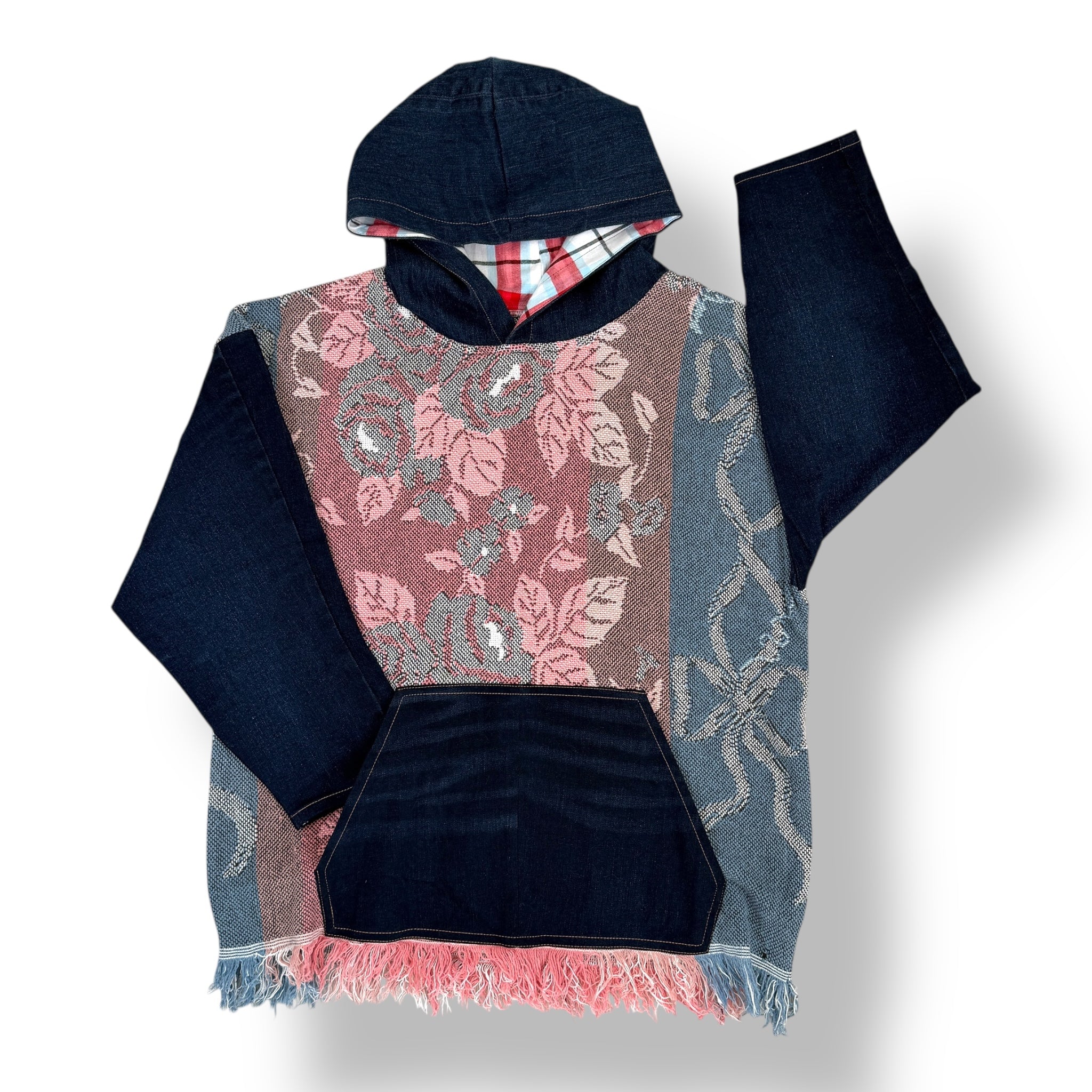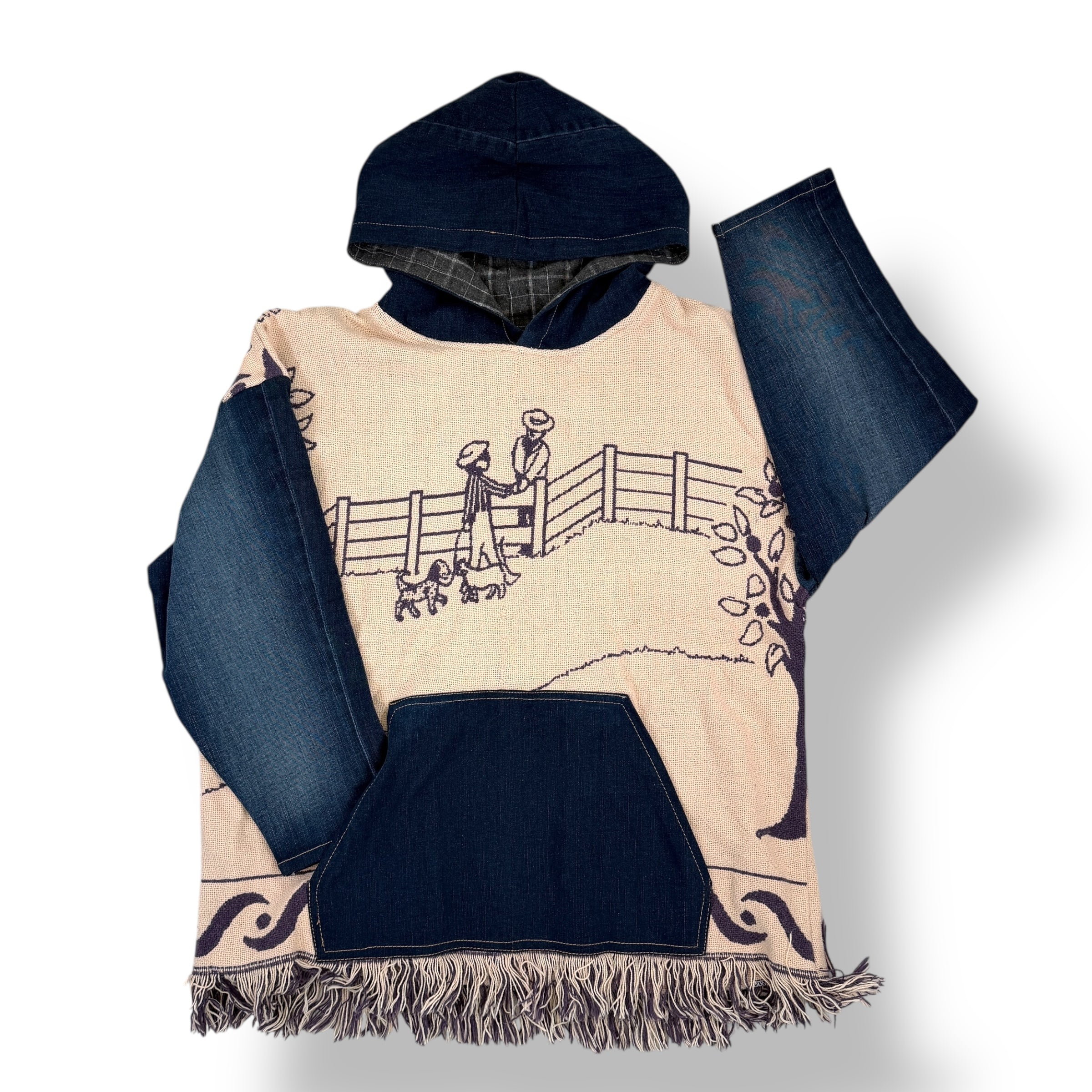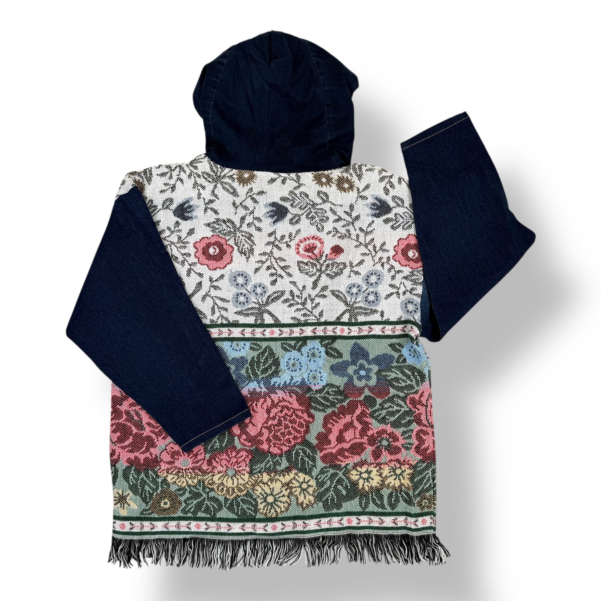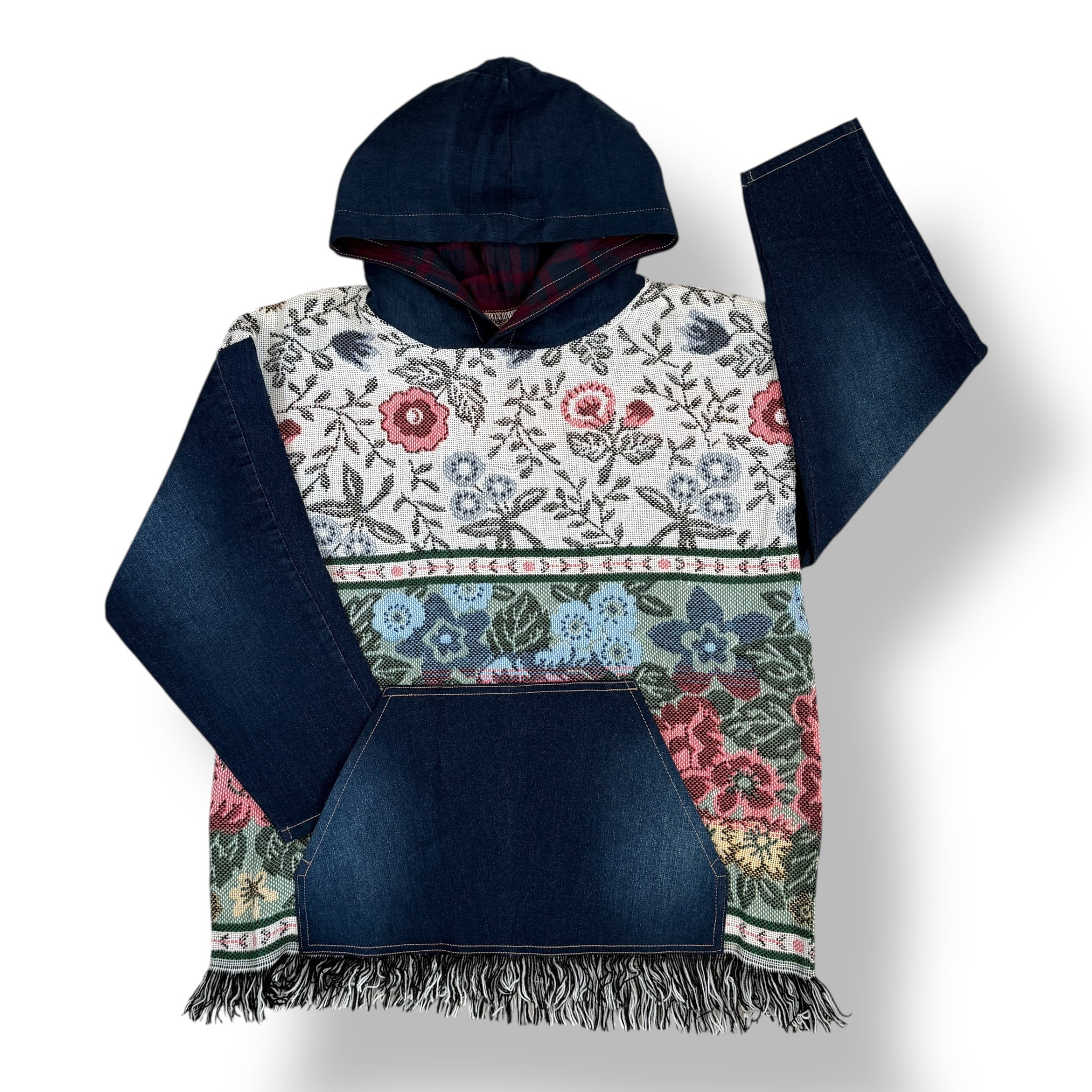 Stay stylish and sustainable with our one-of-a-kind Upcycled Denim Tapestry Hoodies from 100% secondhand textiles. Upcycled clothing. Denim Sleeve. Vintage tapestry body.