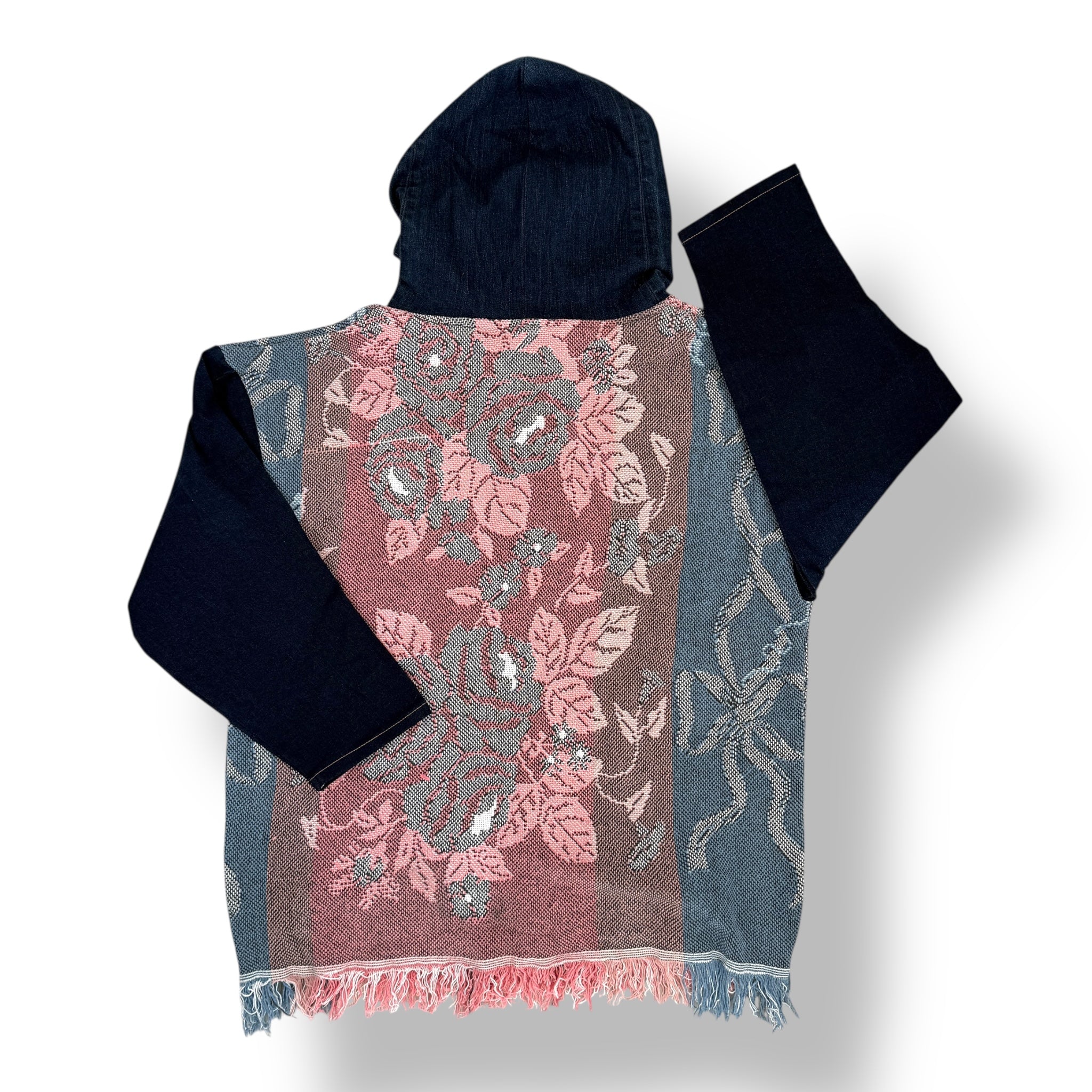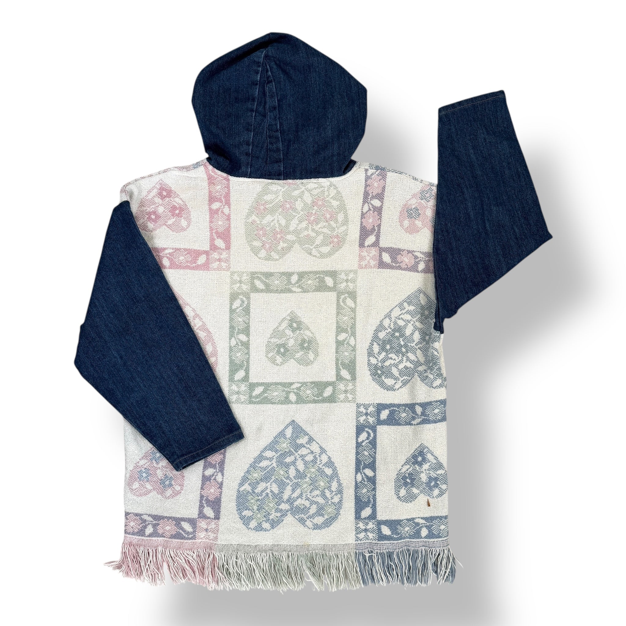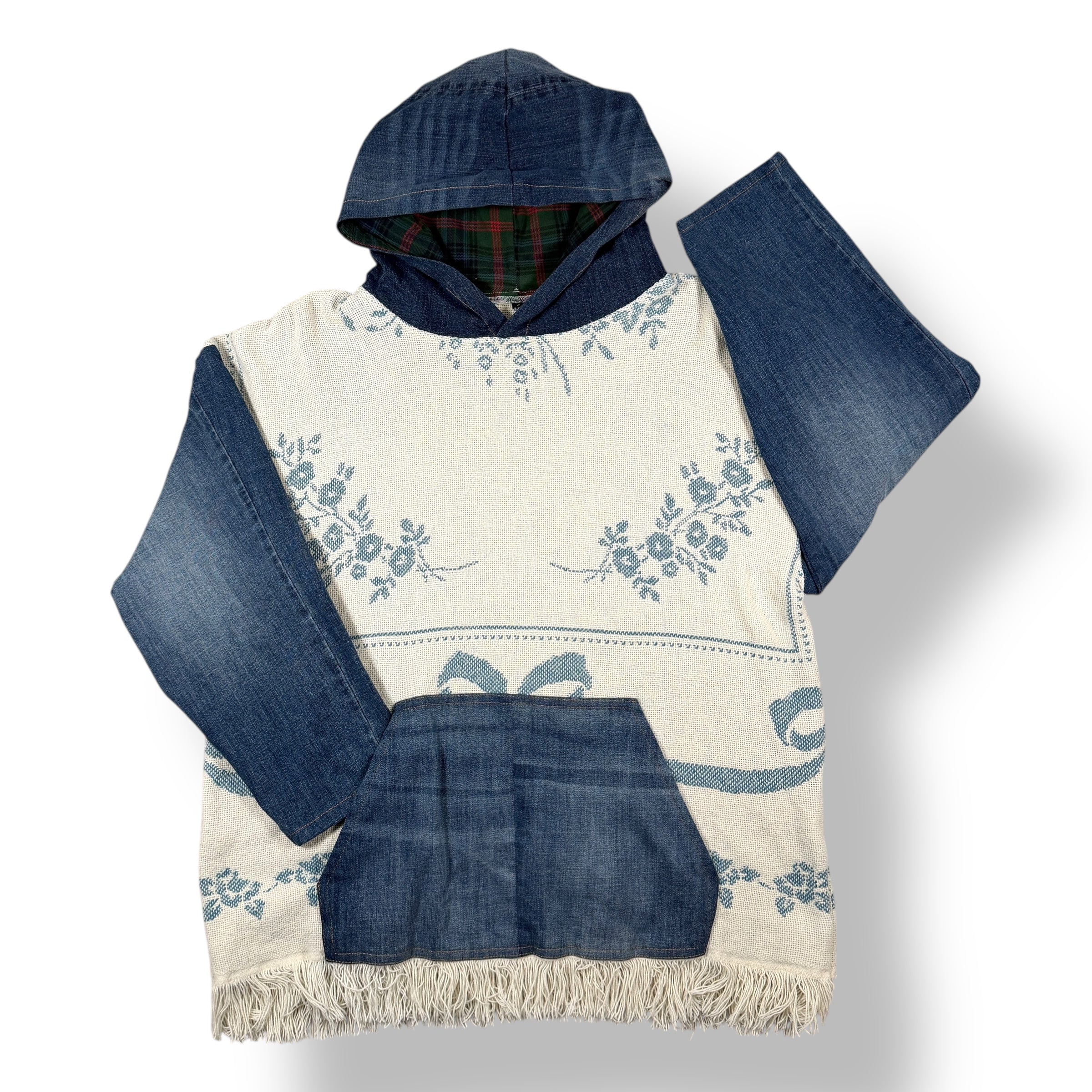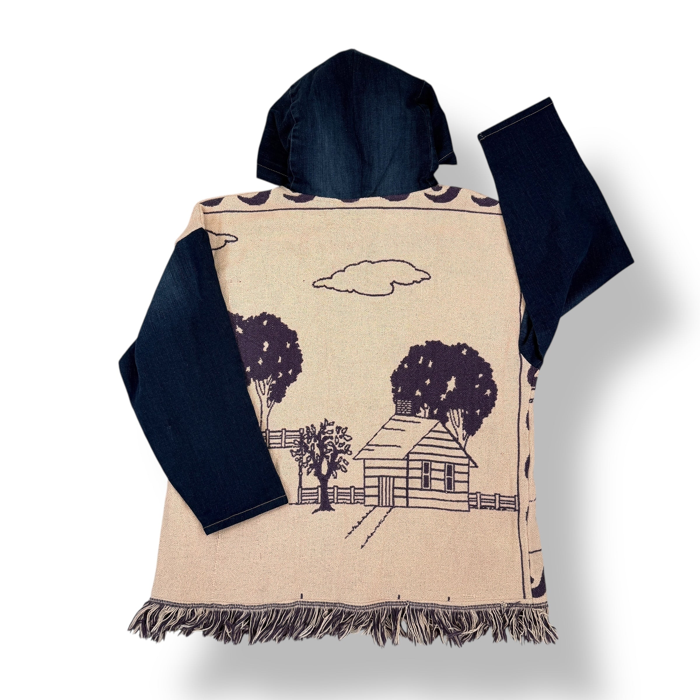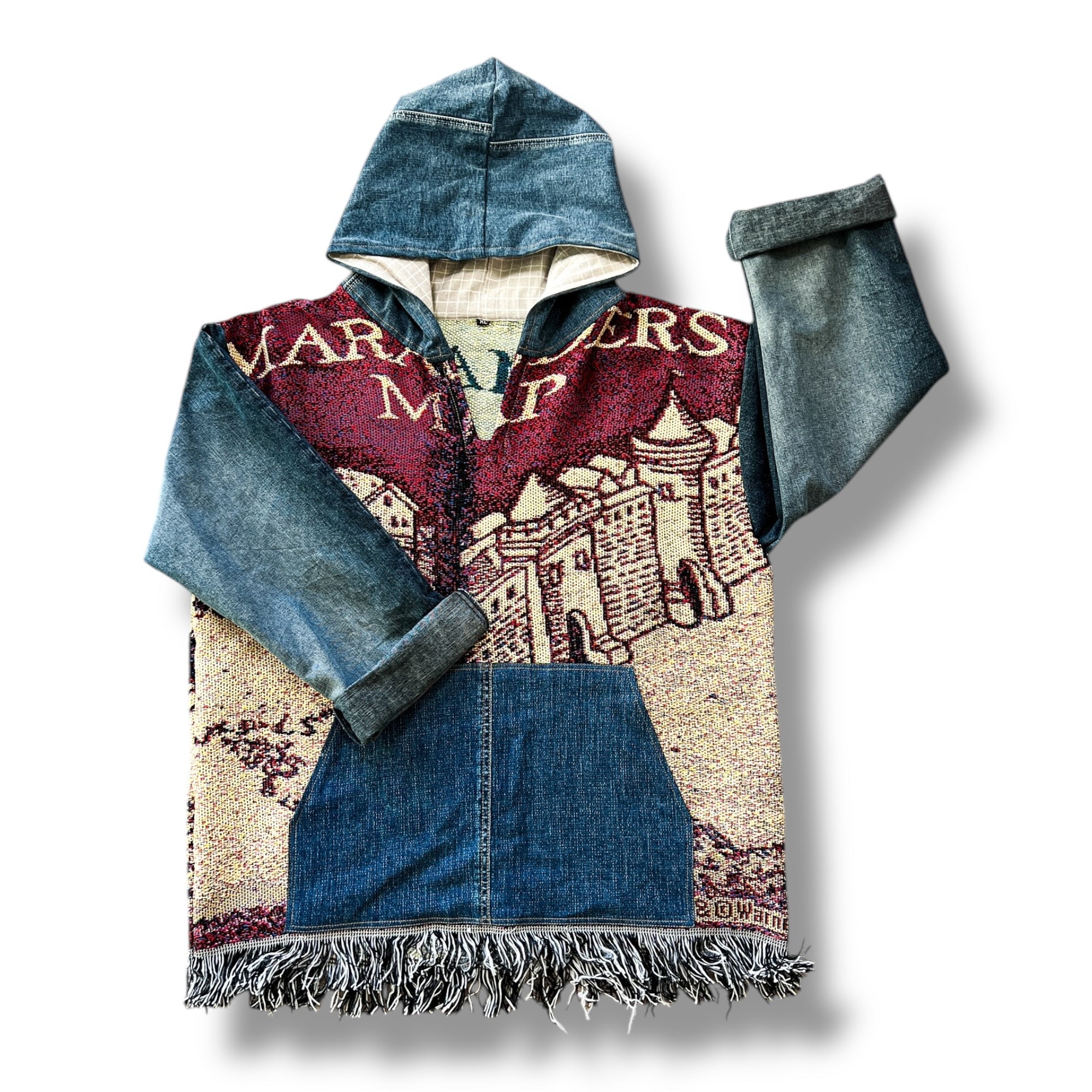 Stay stylish and sustainable with our one-of-a-kind Upcycled Denim Tapestry Hoodies from 100% secondhand textiles. Upcycled clothing. Denim Sleeve. Vintage tapestry body.