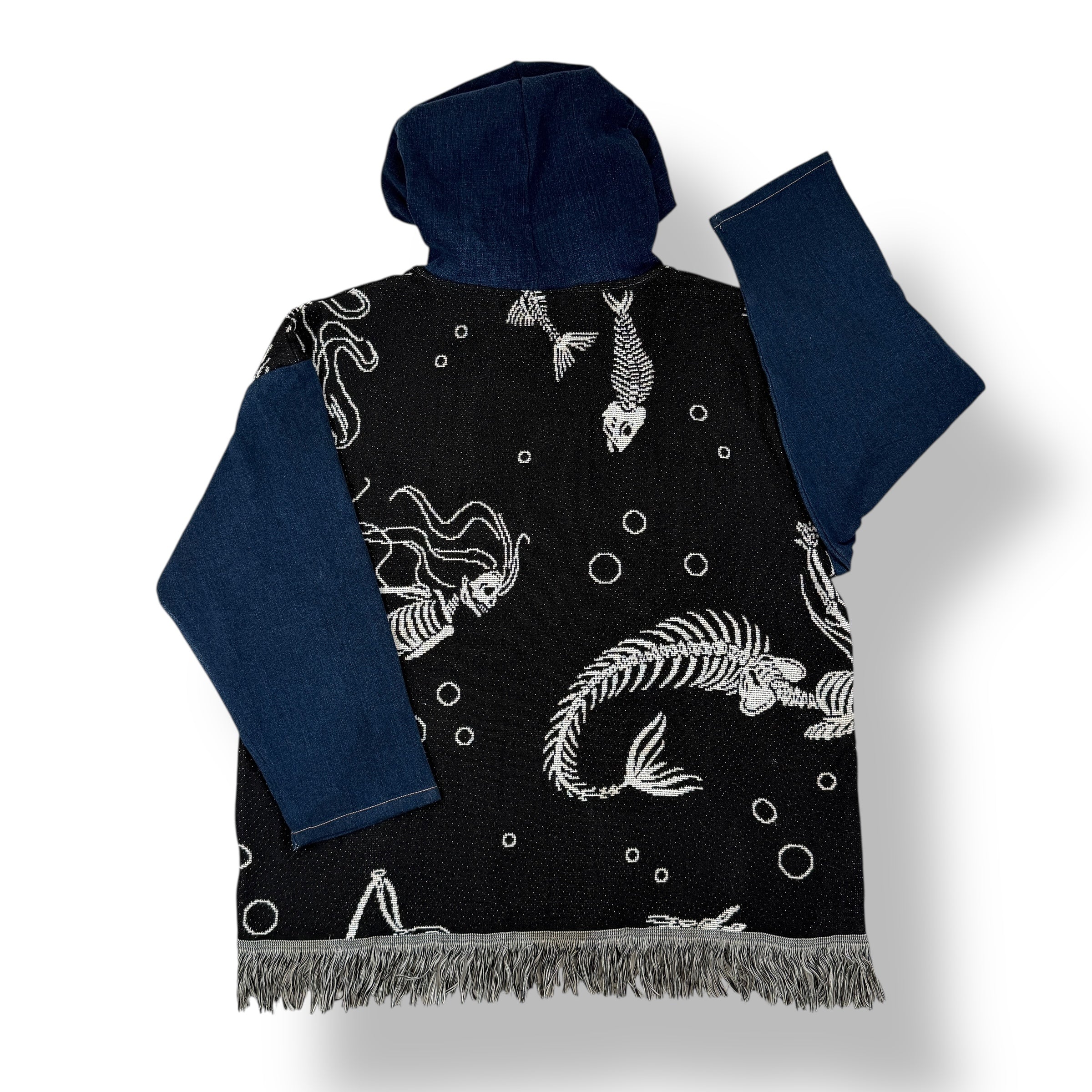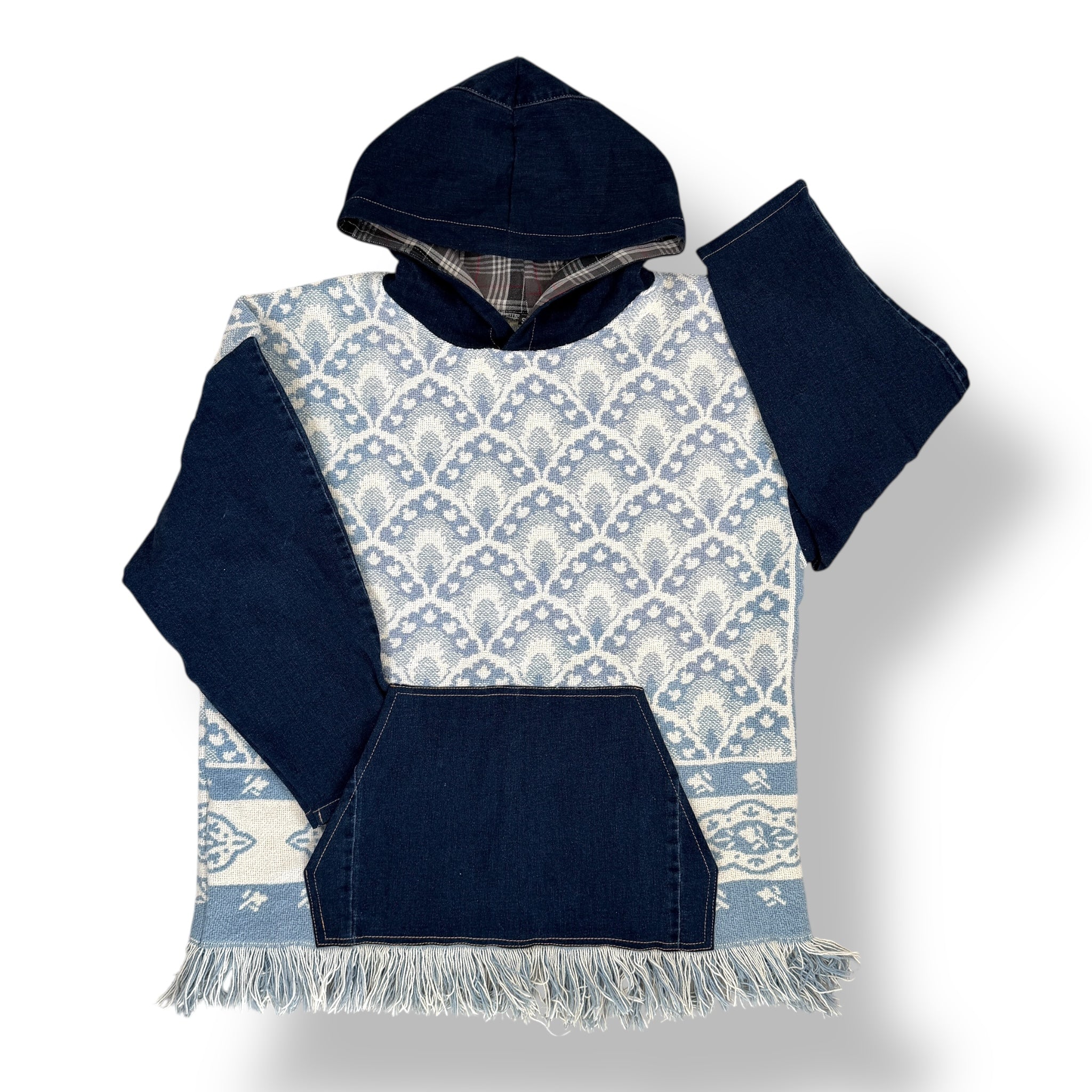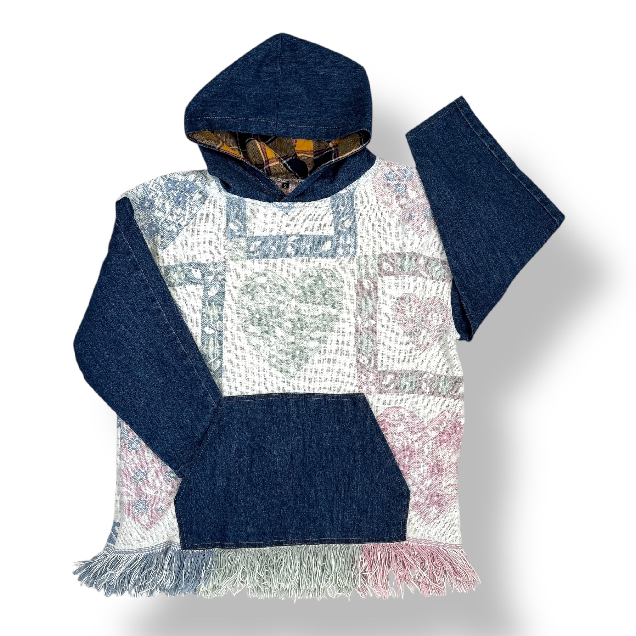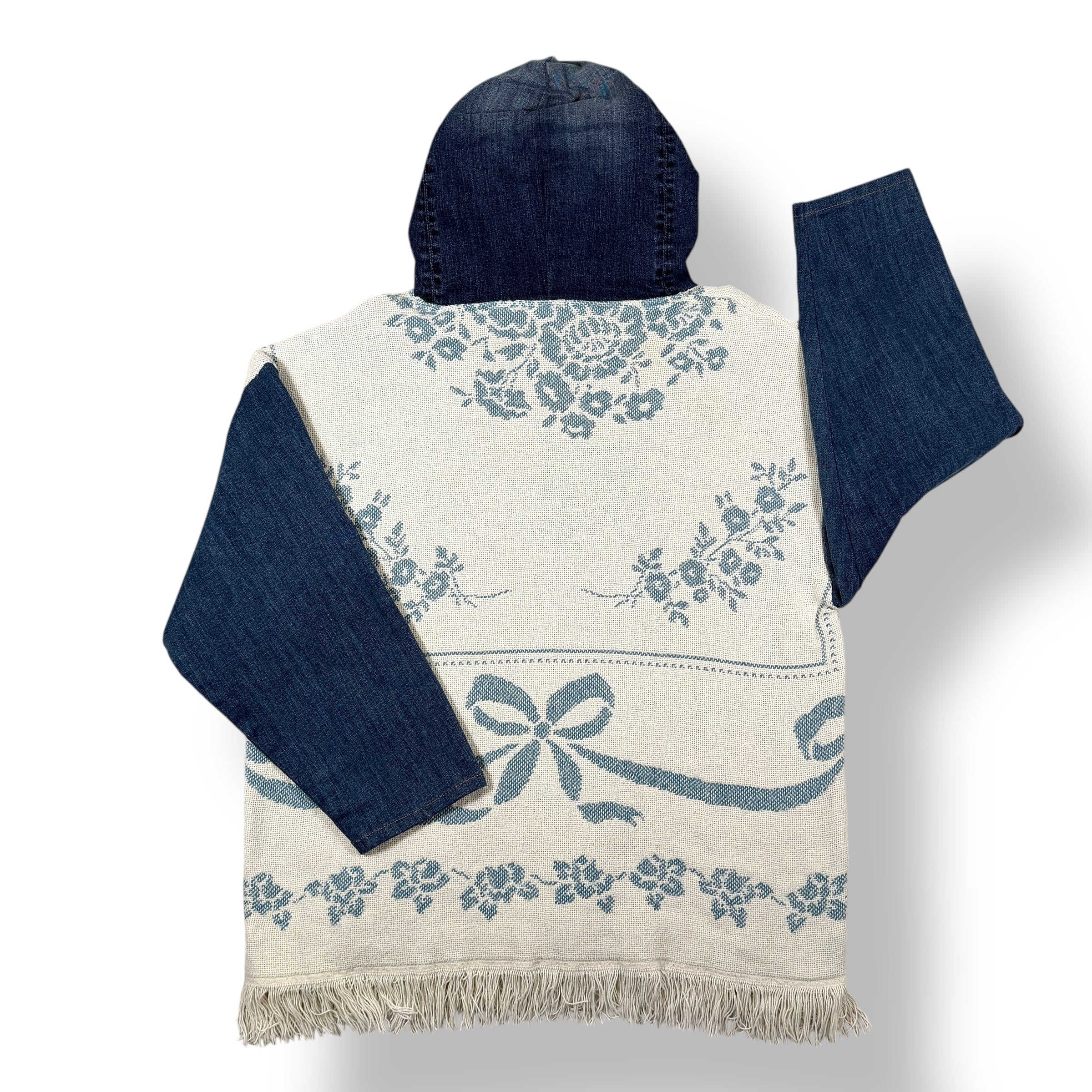Stay stylish and sustainable with our one-of-a-kind Upcycled Denim Tapestry Hoodies from 100% secondhand textiles. Upcycled clothing. Denim Sleeve. Vintage tapestry body.