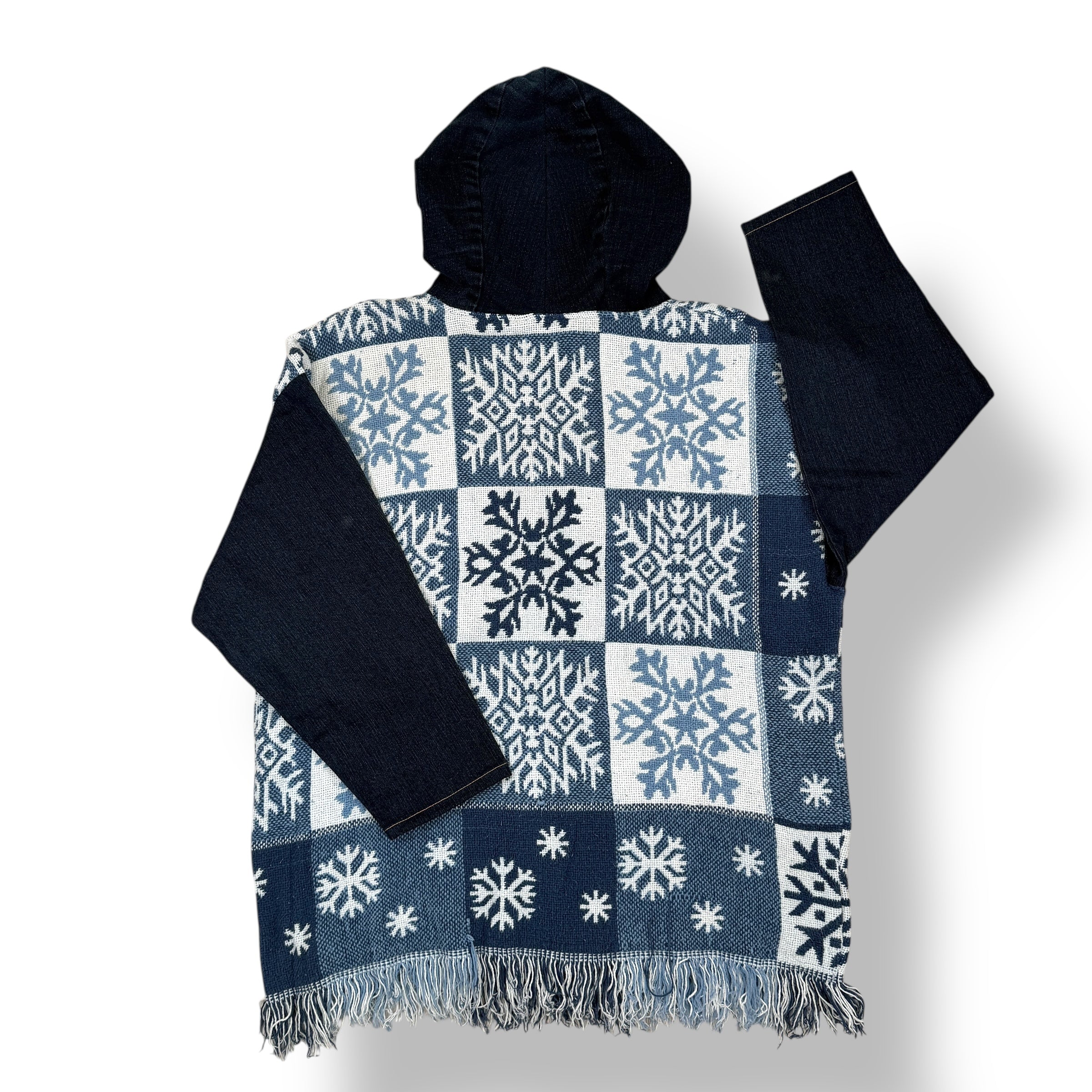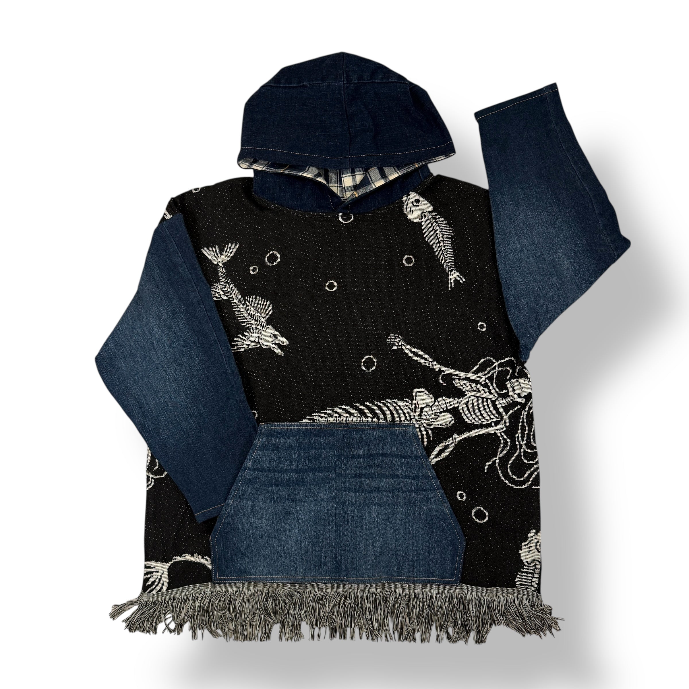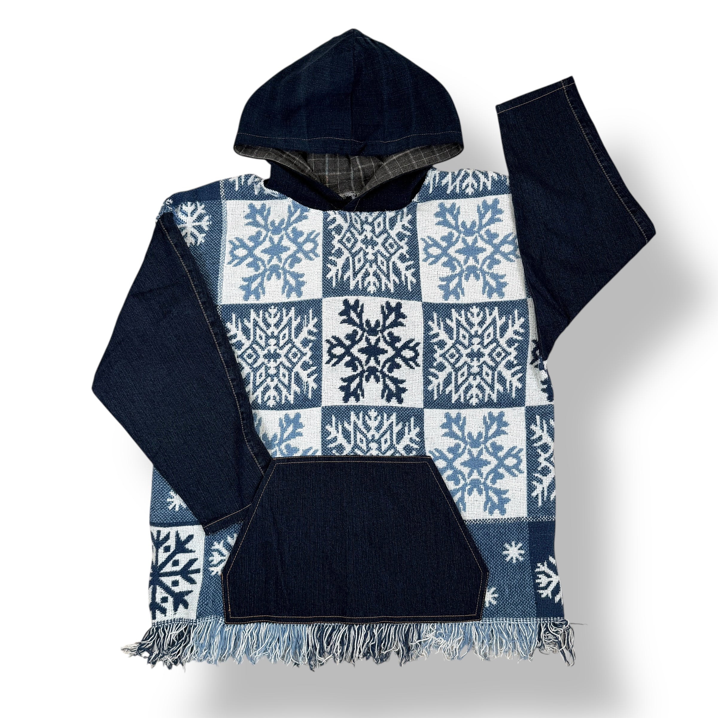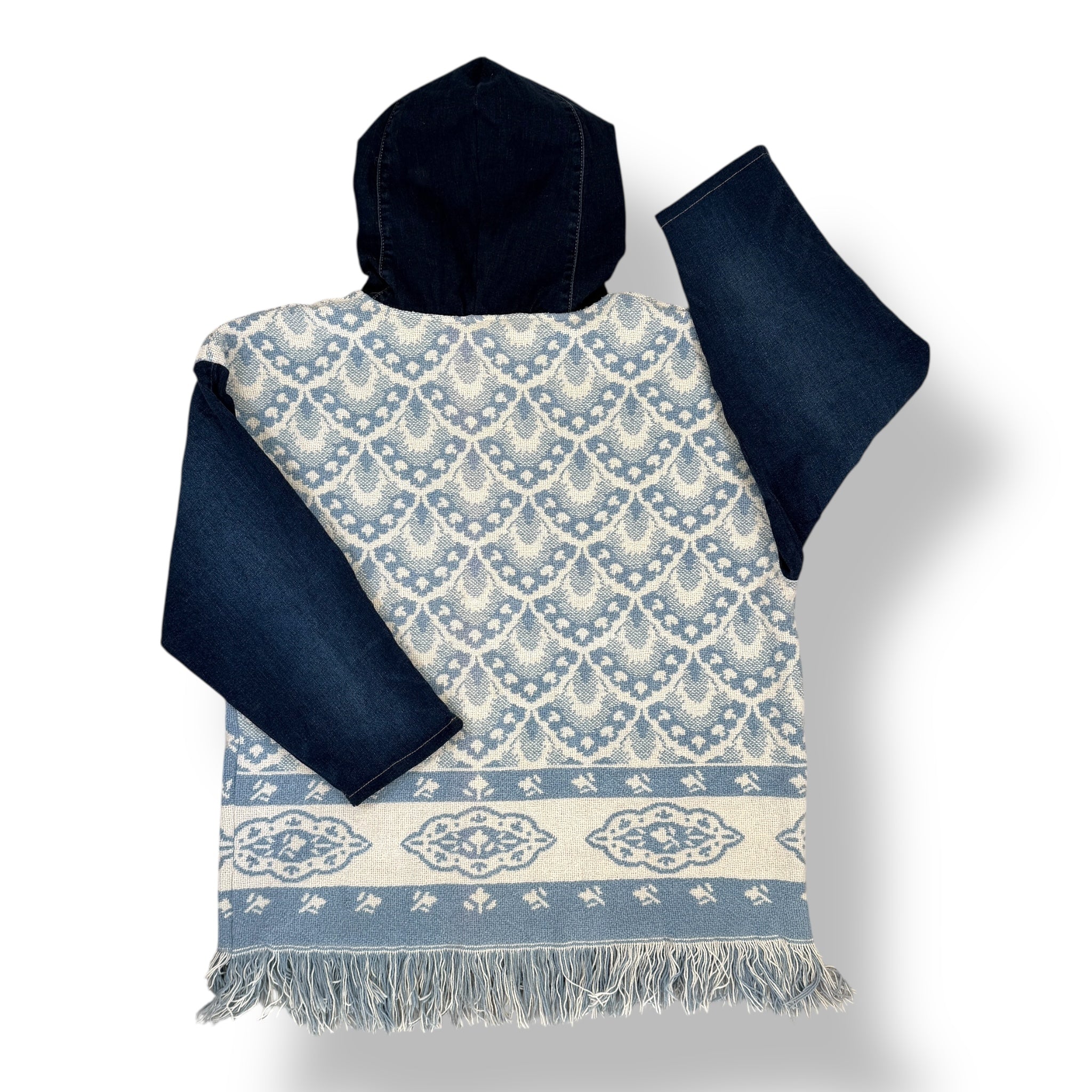 Stay stylish and sustainable with our one-of-a-kind Upcycled Denim Tapestry Hoodies from 100% secondhand textiles. Upcycled clothing. Denim Sleeve. Vintage tapestry body.