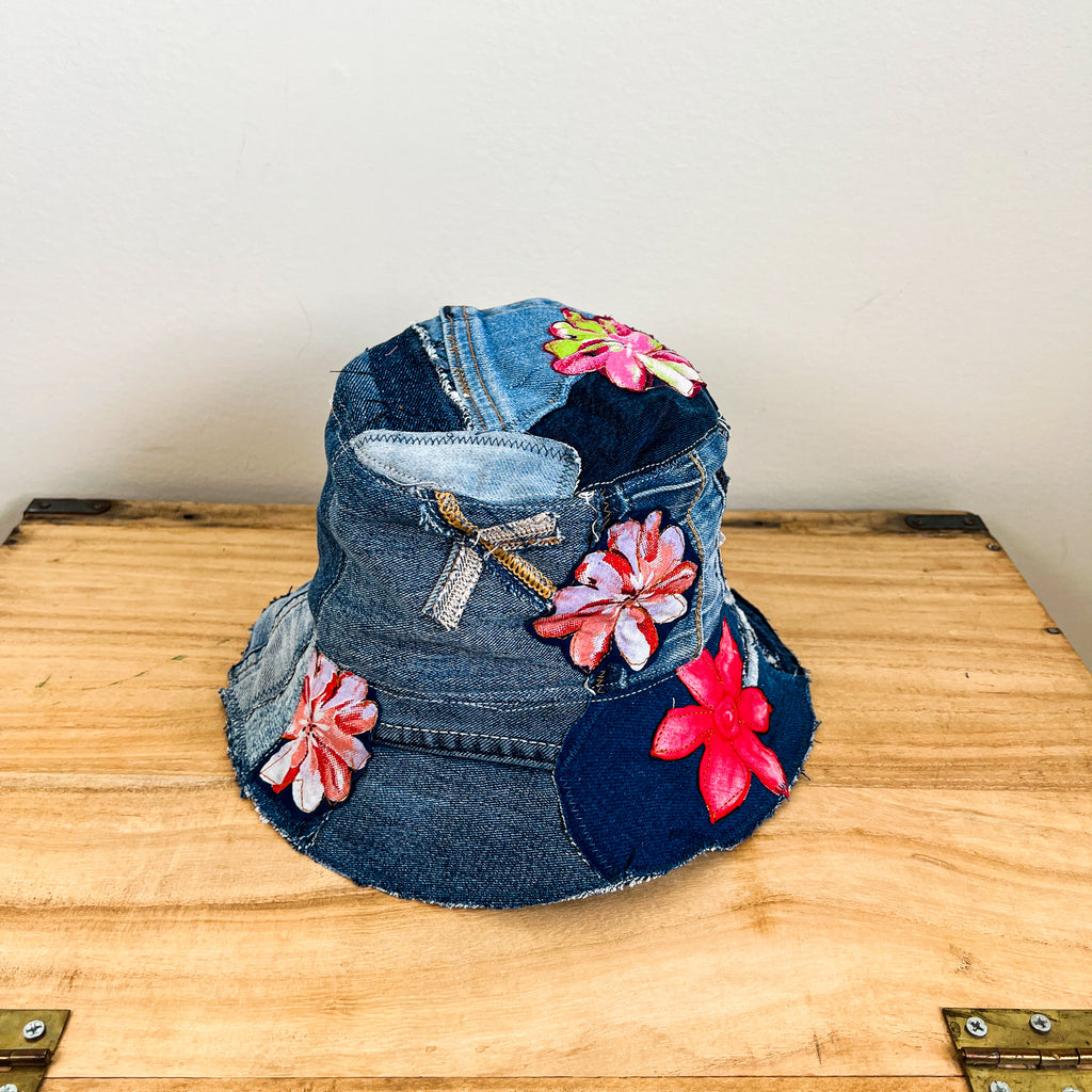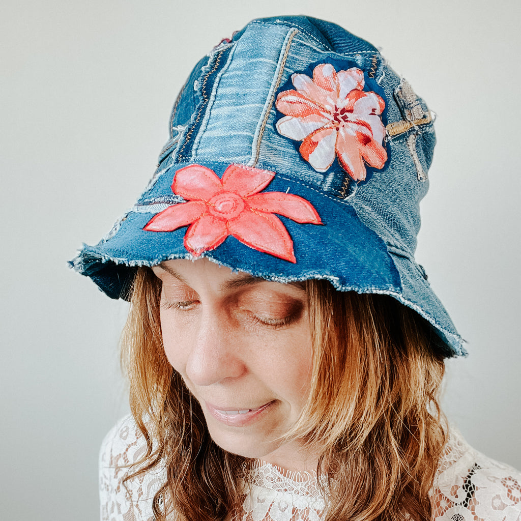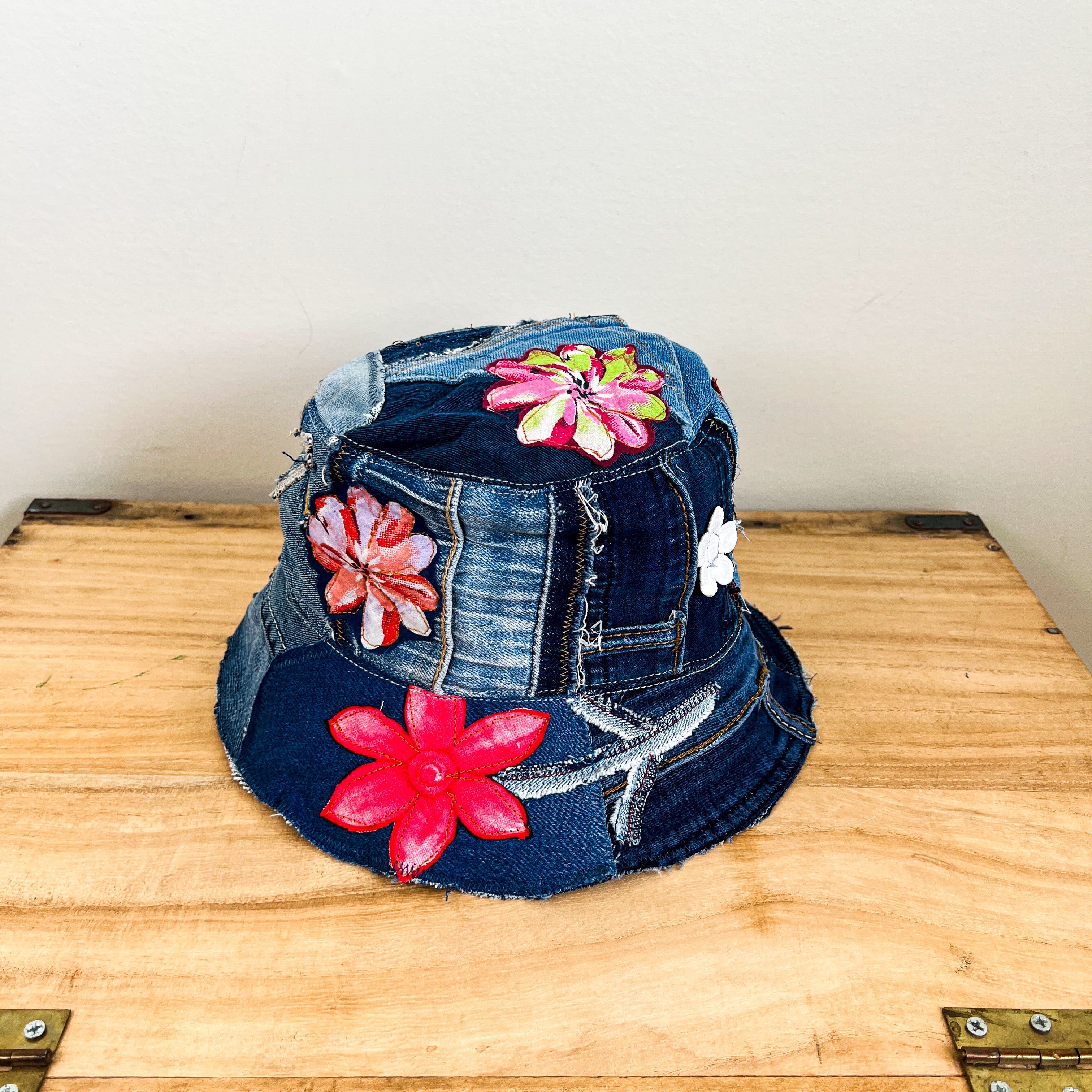 Handmade upcycled bucket hat is crafted from scrap denim, giving new life to discarded fabric. Each upcycled hat is one-of-a-kind. Patchwork denim Hat.