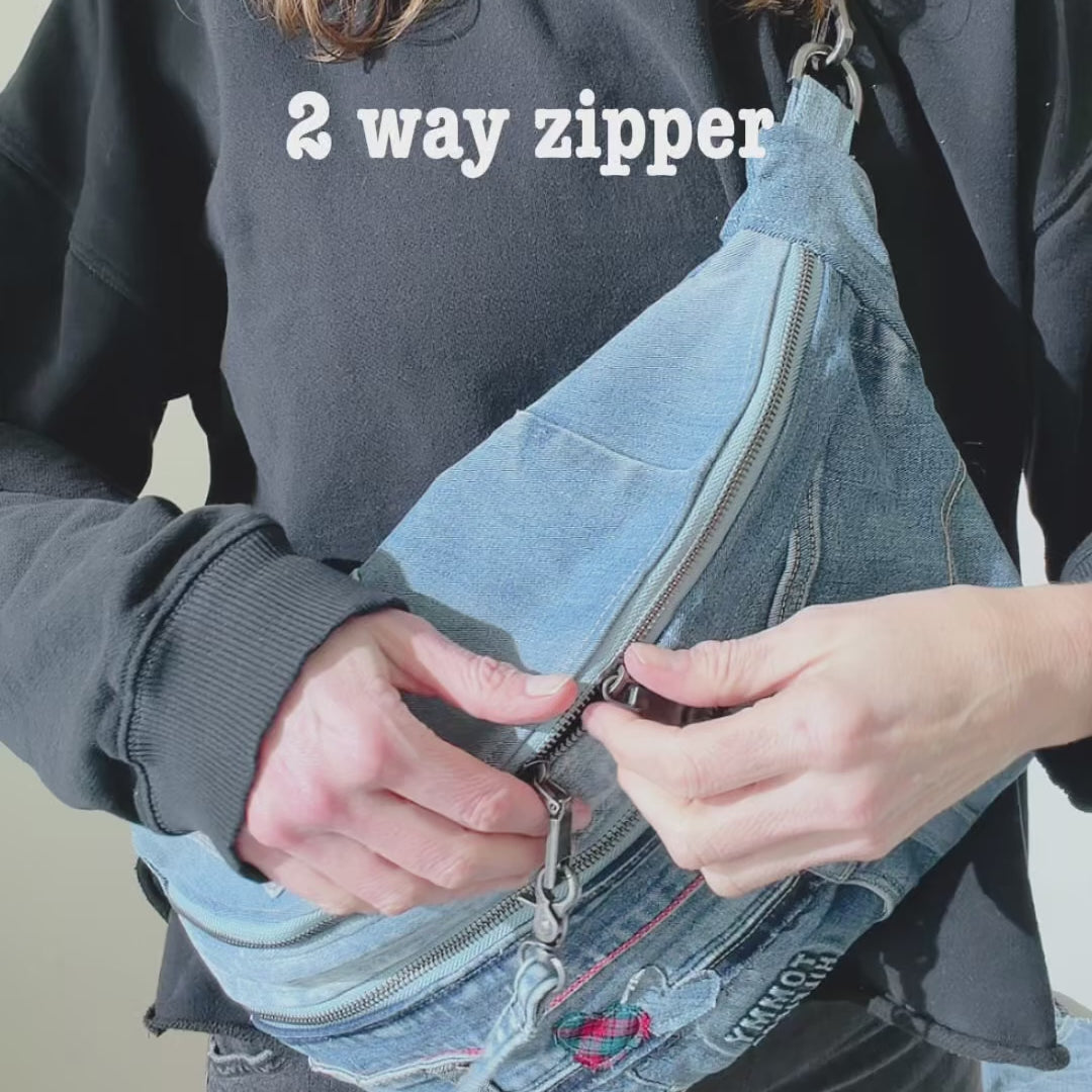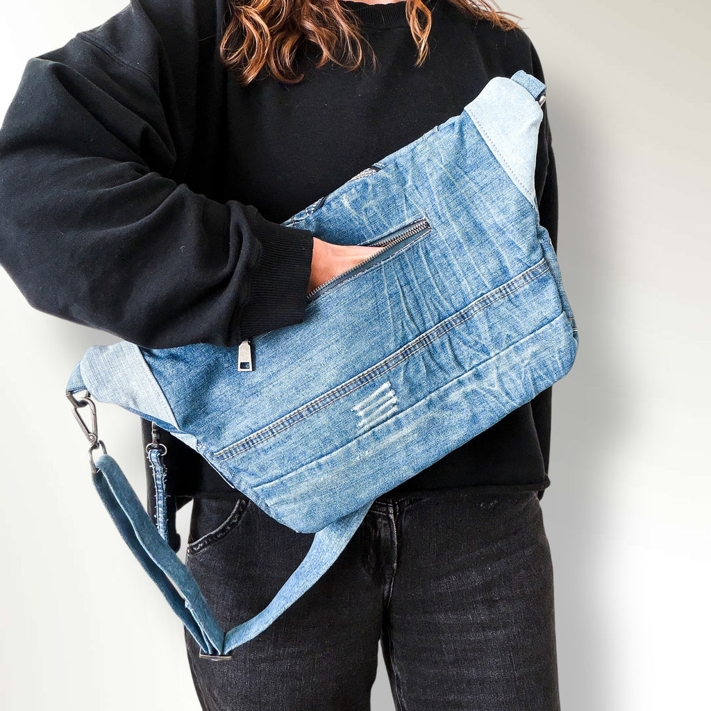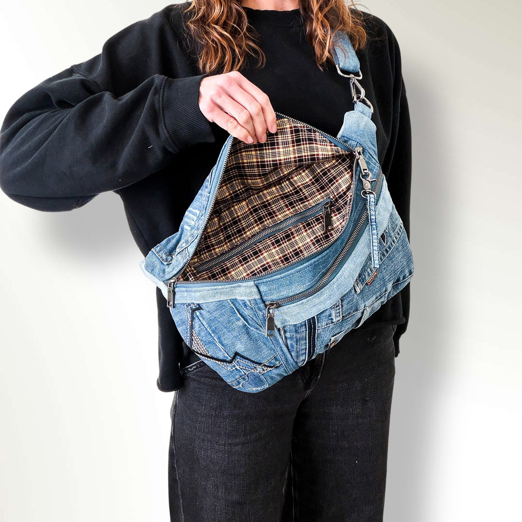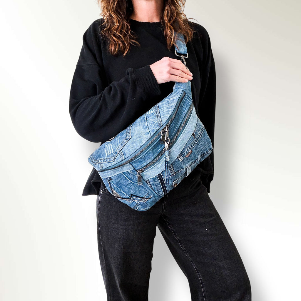 Carry your essentials in sustainable style with our upcycled denim sling bag! Each unique, eco-friendly bag is crafted from repurposed jeans. This crossbody bag is stylish, practical and spacious. Let this denim sling bag be your everyday go-to or festival companion.