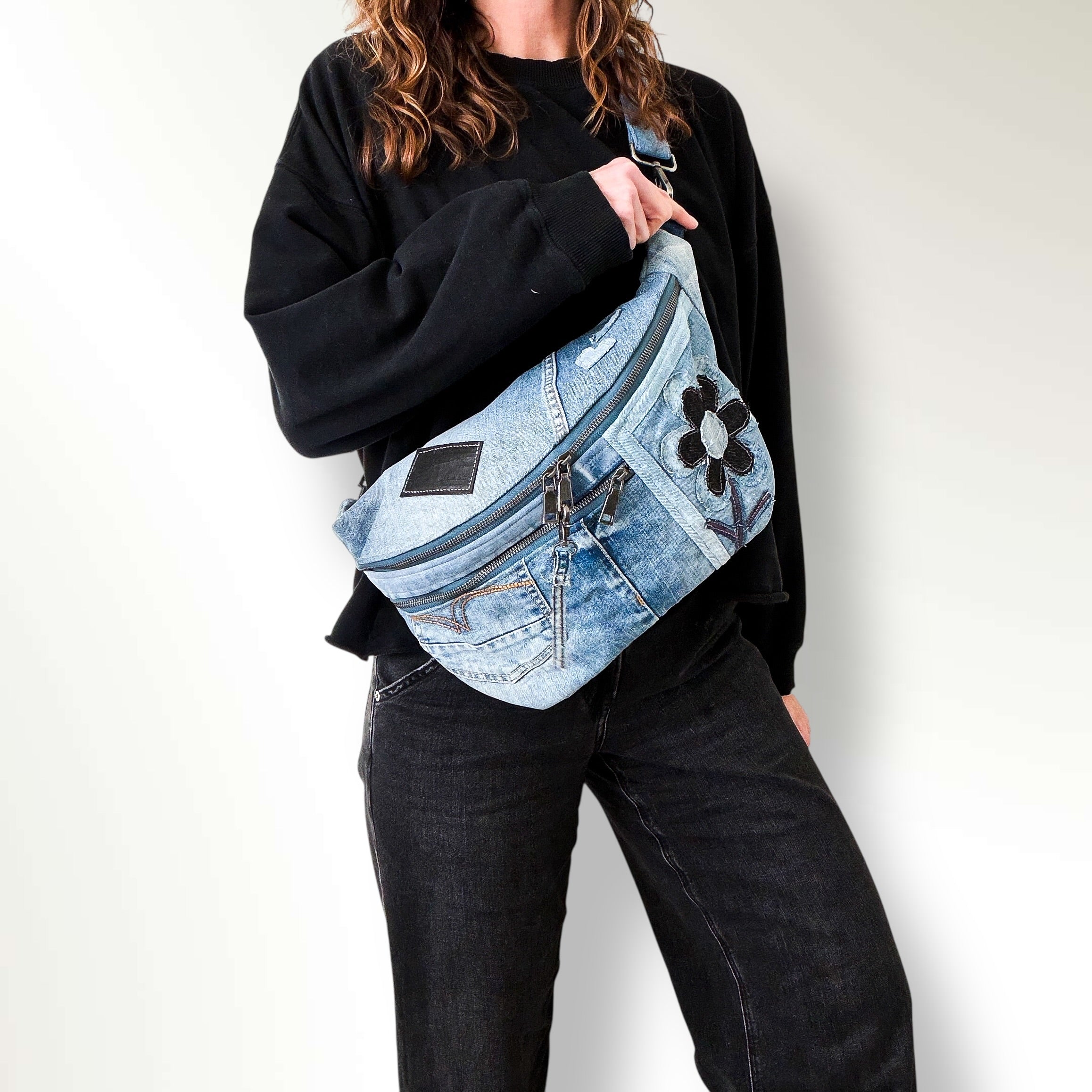 Carry your essentials in sustainable style with our upcycled denim sling bag! Each unique, eco-friendly bag is crafted from repurposed jeans. This crossbody bag is stylish, practical and spacious. Let this denim sling bag be your everyday go-to or festival companion.