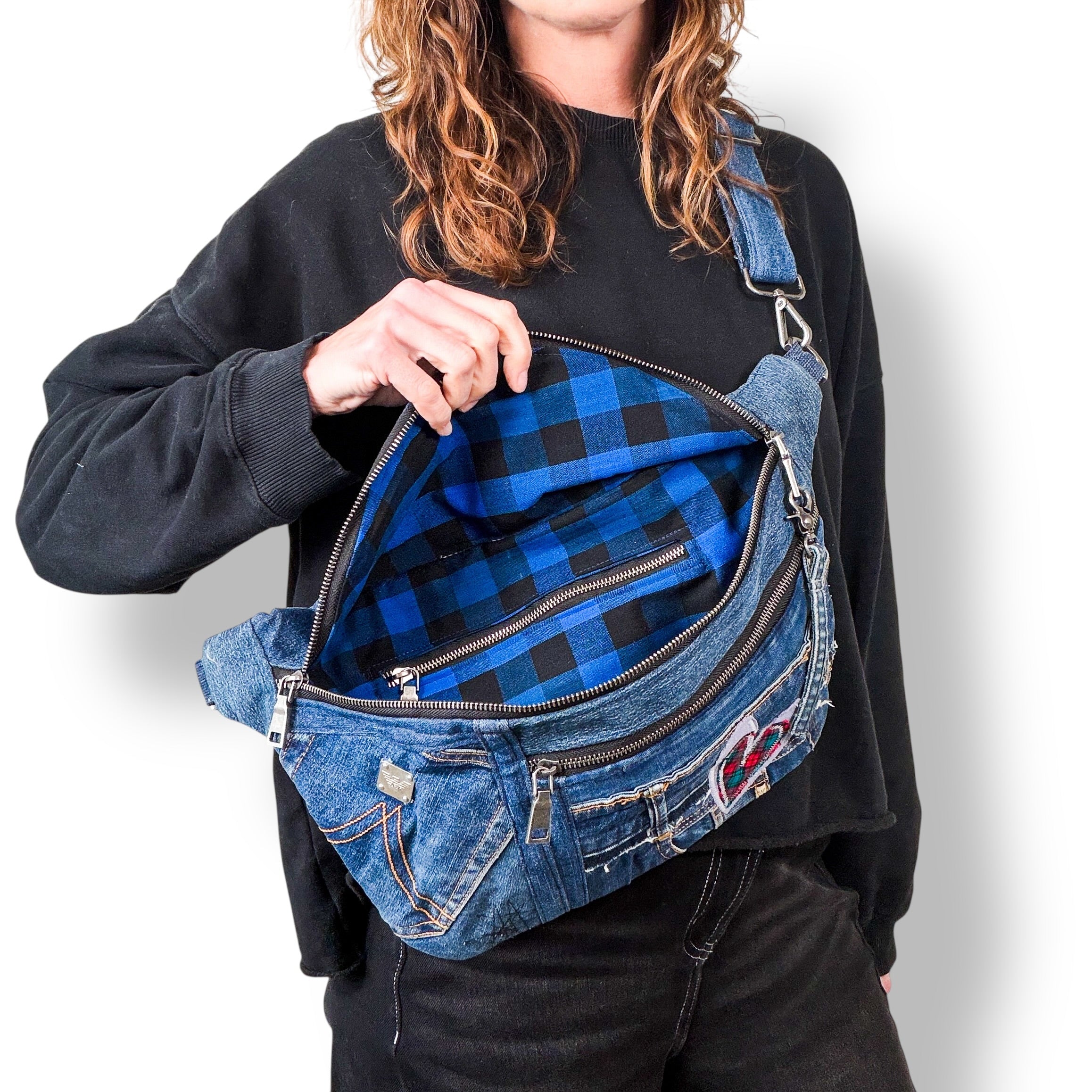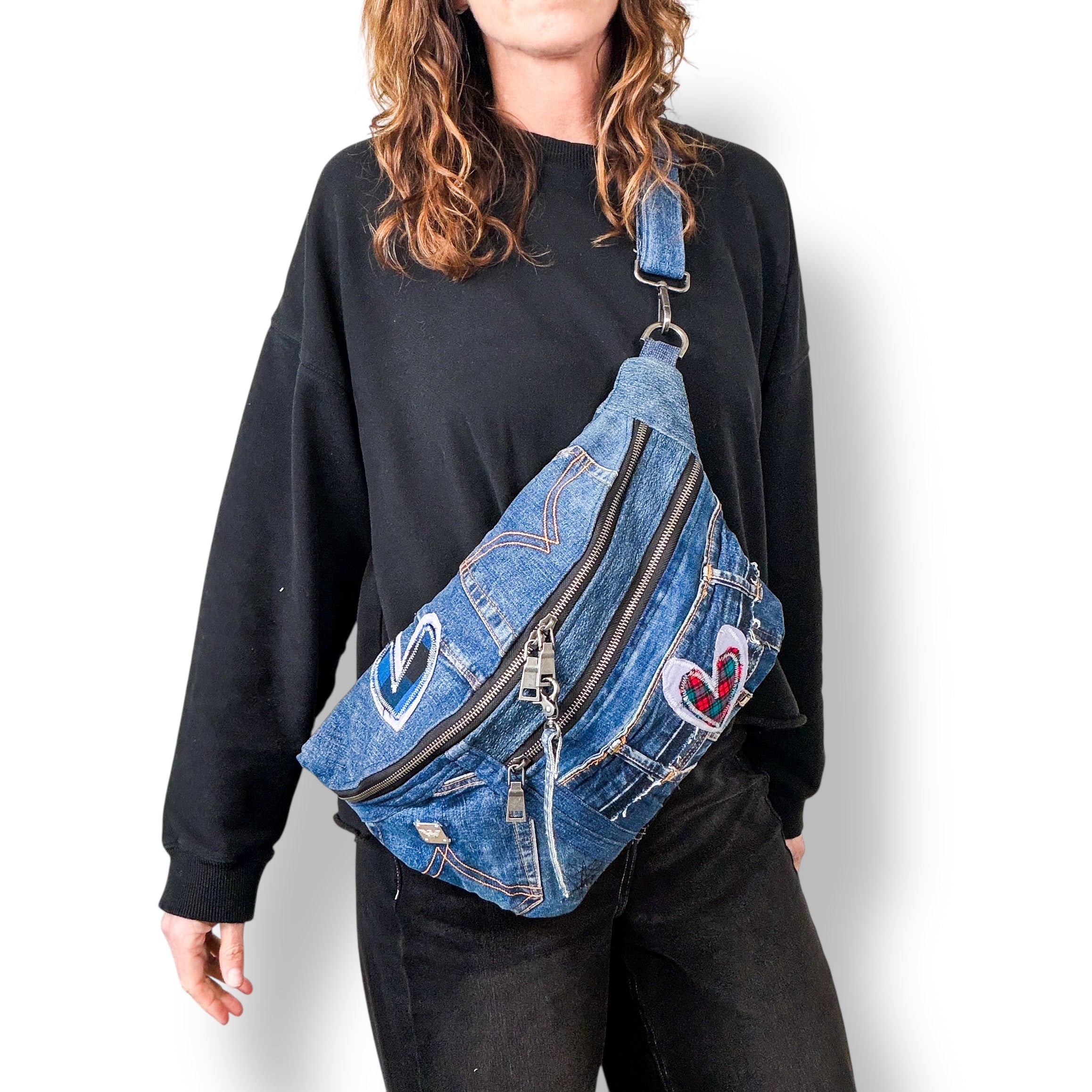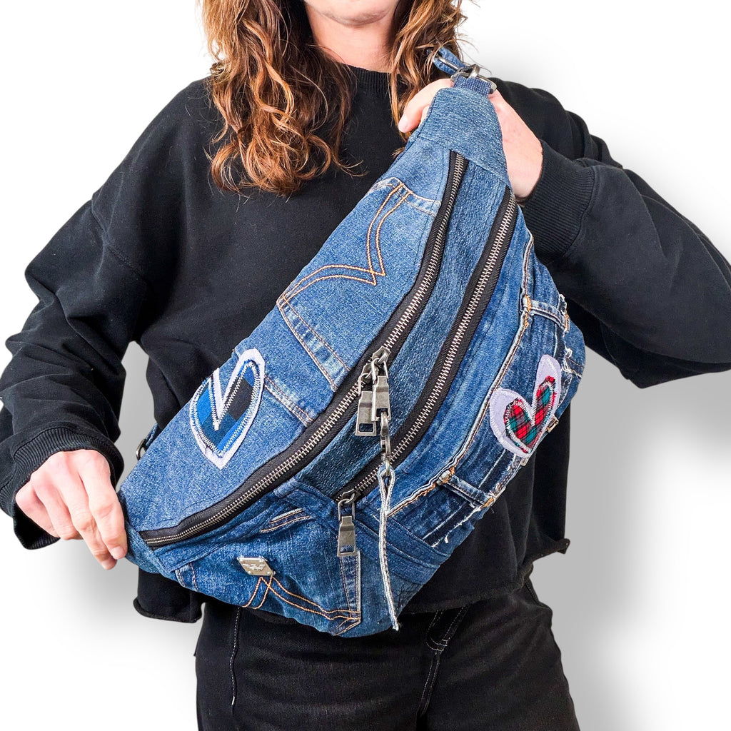 Carry your essentials in sustainable style with our upcycled denim sling bag! Each unique, eco-friendly bag is crafted from repurposed jeans. This crossbody bag is stylish, practical and spacious. Let this denim sling bag be your everyday go-to or festival companion.